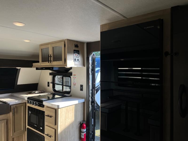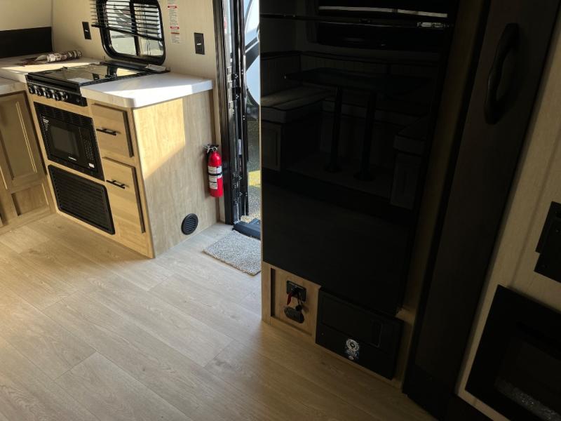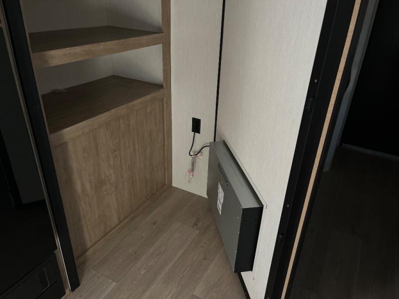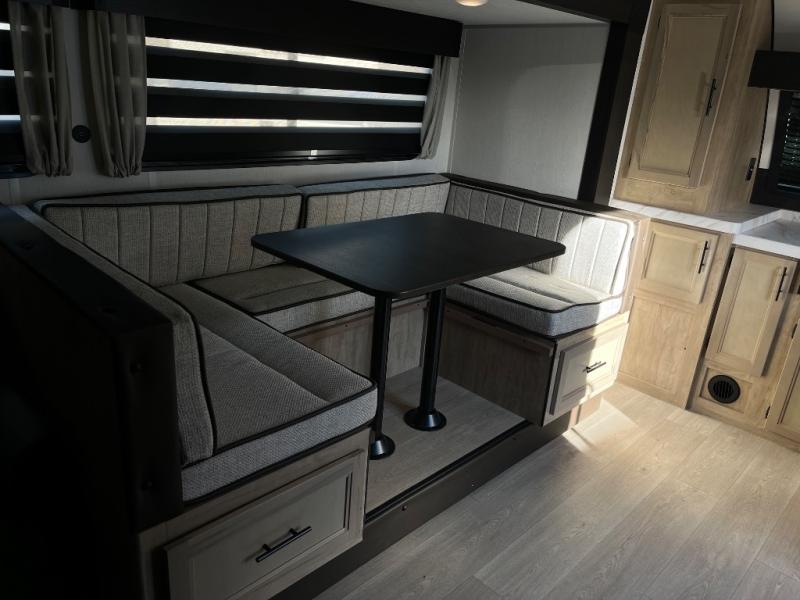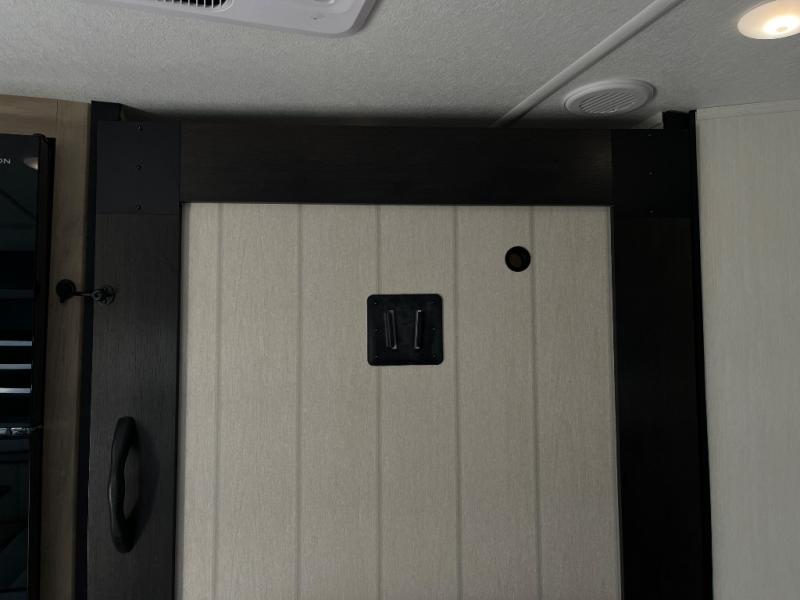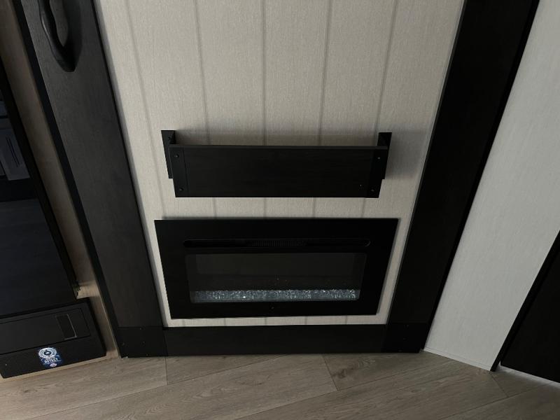 Since this travel trailer features dual entry doors, you can enter in through the rear master bedroom or the front kitchen; how convenient! The kitchen includes ample counter space and all the appliances to prep meals, along with a pantry up front and a hidden pantry behind the fireplace. Your crew can get comfortable on the sofa or play a game around the U-shaped dinette, although you may just find yourselves outdoors since there is an outside kitchen and a power awning with LED lights. The dual entry bath will let you enter in through the main living area, plus it has a private entrance into the bedroom. Here, you'll find an RV king bed, a wardrobe for your things, and USB ports to keep your electronics charged!