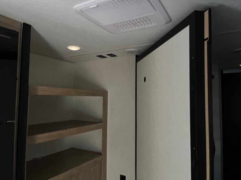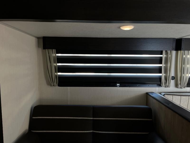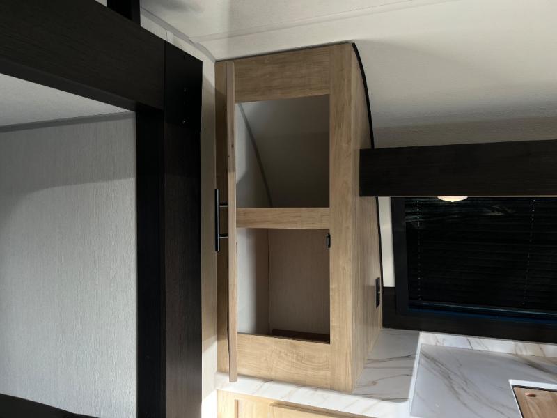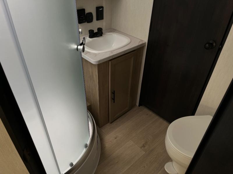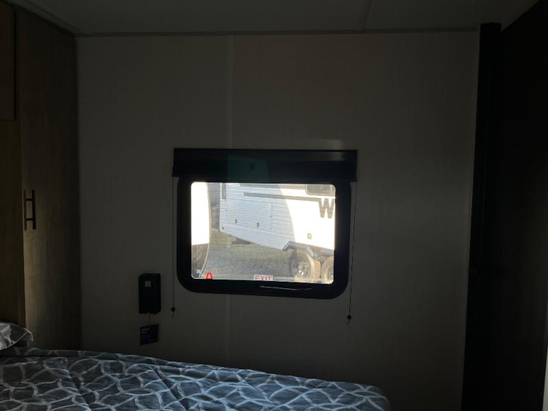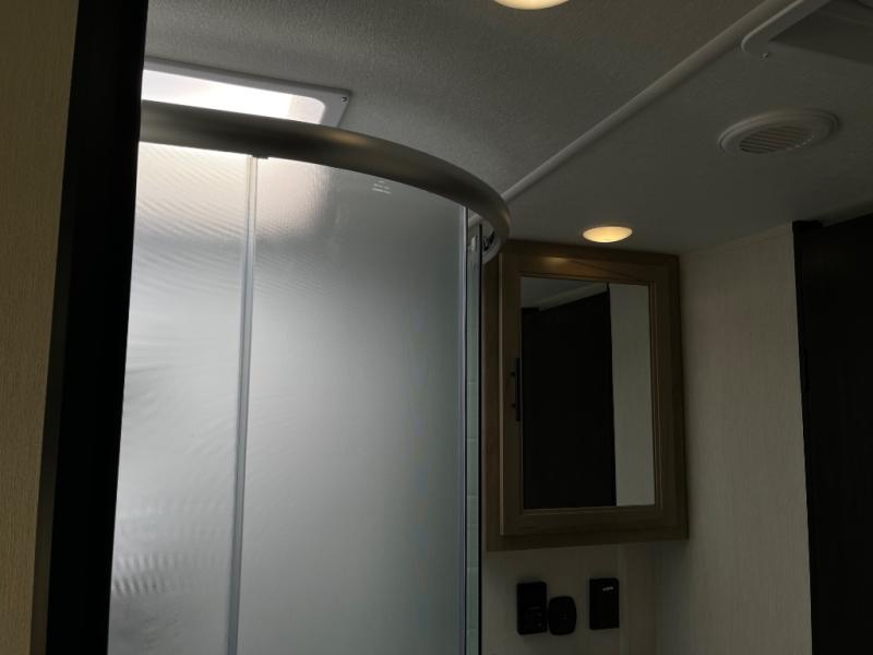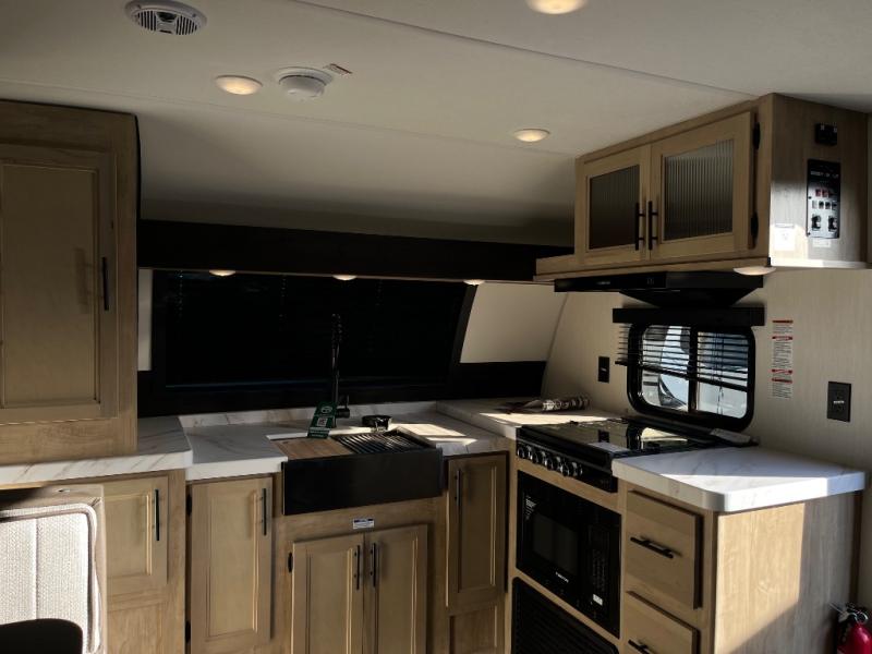 Since this travel trailer features dual entry doors, you can enter in through the rear master bedroom or the front kitchen; how convenient! The kitchen includes ample counter space and all the appliances to prep meals, along with a pantry up front and a hidden pantry behind the fireplace. Your crew can get comfortable on the sofa or play a game around the U-shaped dinette, although you may just find yourselves outdoors since there is an outside kitchen and a power awning with LED lights. The dual entry bath will let you enter in through the main living area, plus it has a private entrance into the bedroom. Here, you'll find an RV king bed, a wardrobe for your things, and USB ports to keep your electronics charged!