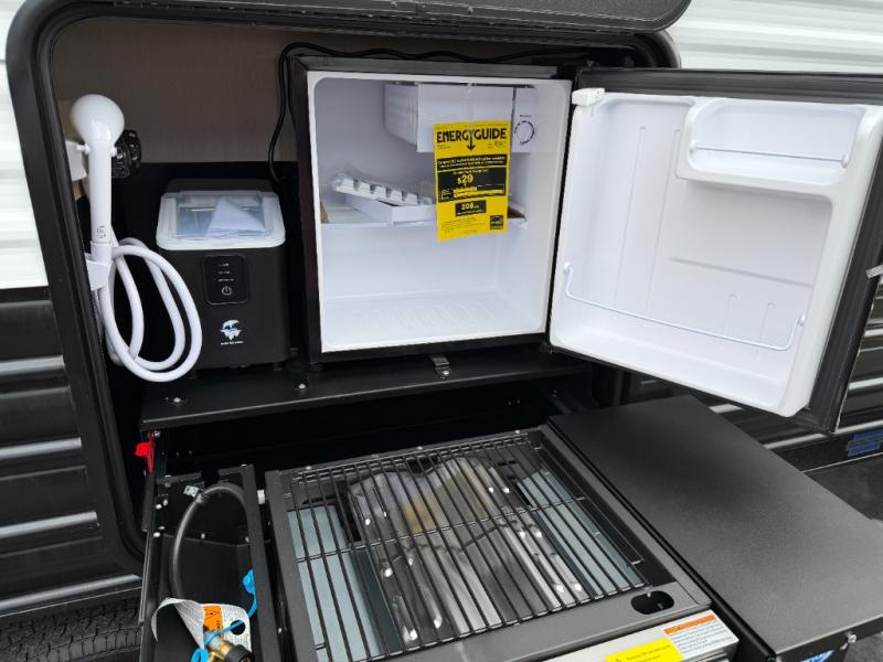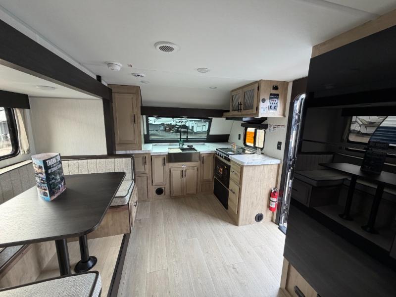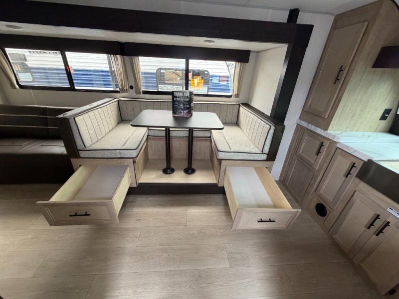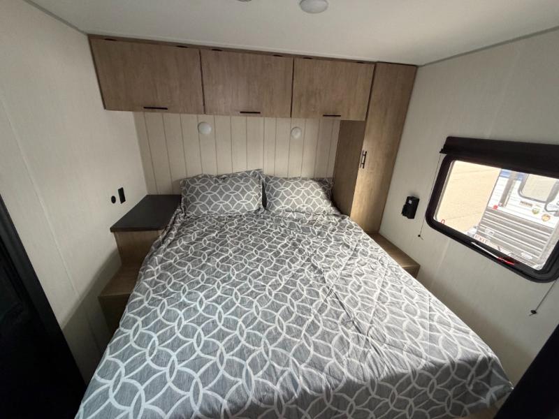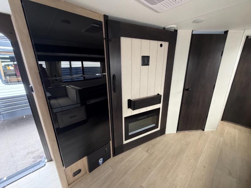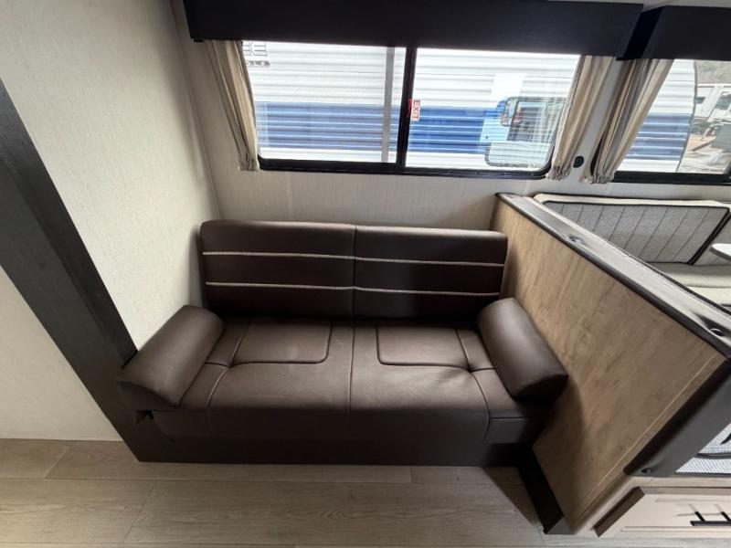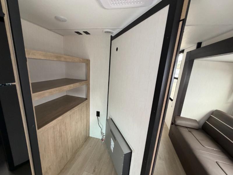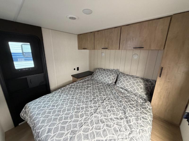 Since this travel trailer features dual entry doors, you can enter in through the rear master bedroom or the front kitchen; how convenient! The kitchen includes ample counter space and all the appliances to prep meals, along with a pantry up front and a hidden pantry behind the fireplace. Your crew can get comfortable on the sofa or play a game around the U-shaped dinette, although you may just find yourselves outdoors since there is an outside kitchen and a power awning with LED lights. The dual entry bath will let you enter in through the main living area, plus it has a private entrance into the bedroom. Here, you'll find an RV king bed, a wardrobe for your things, and USB ports to keep your electronics charged!