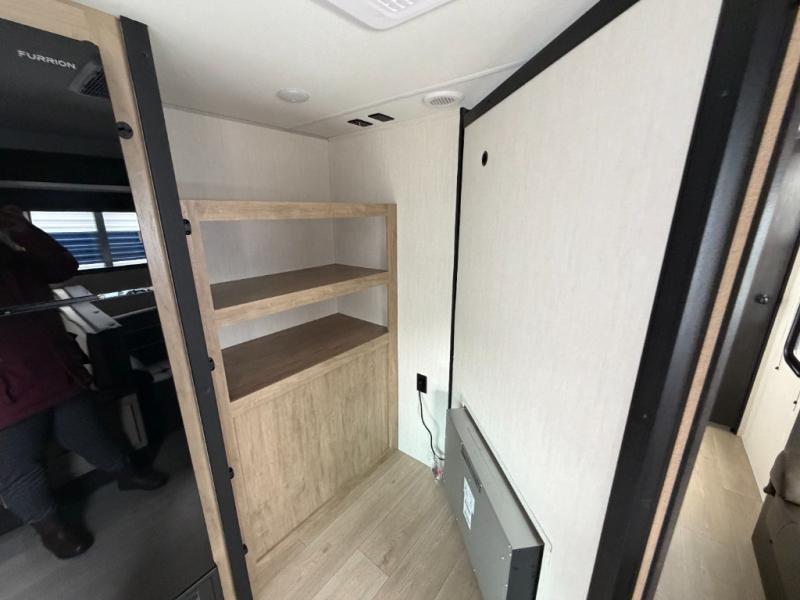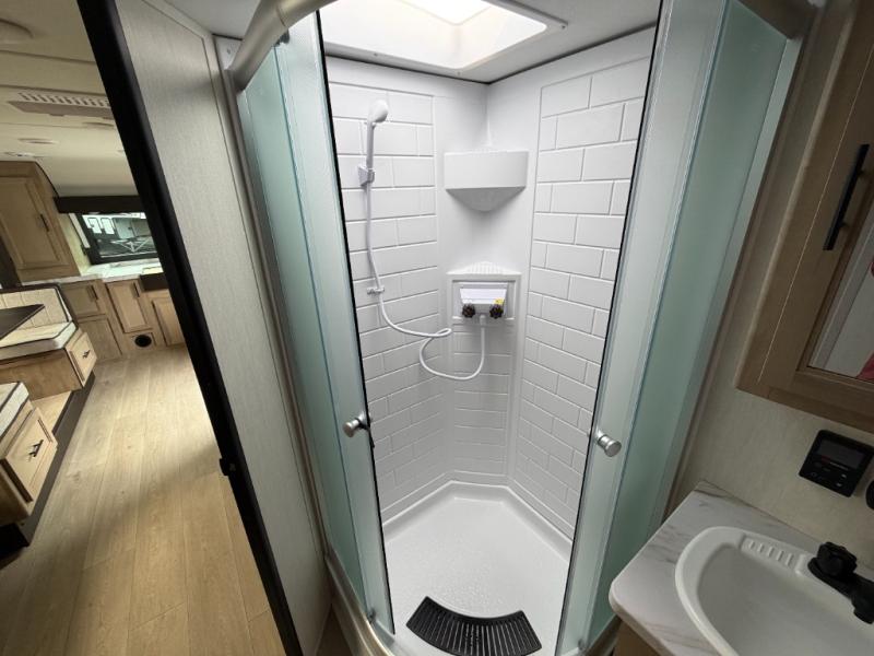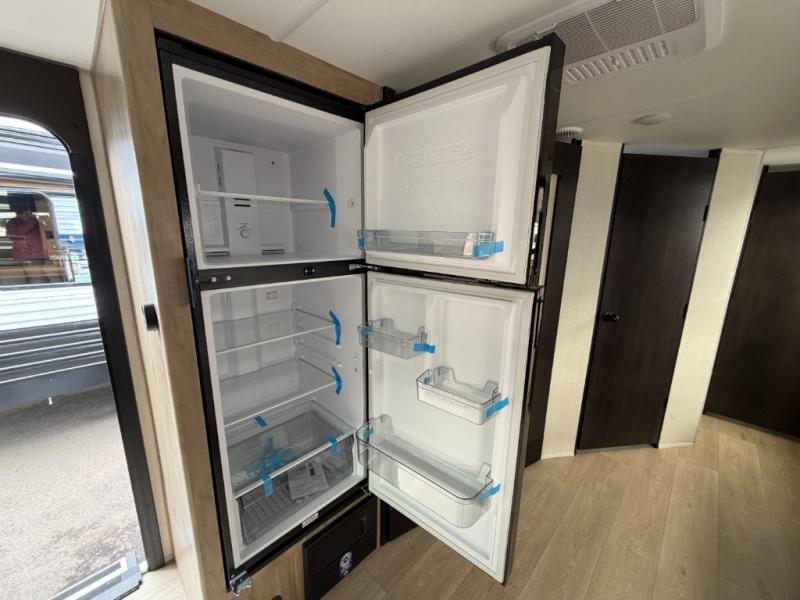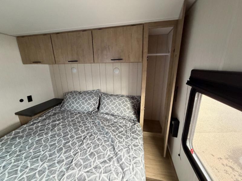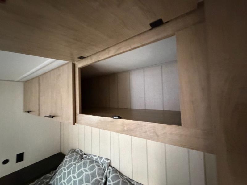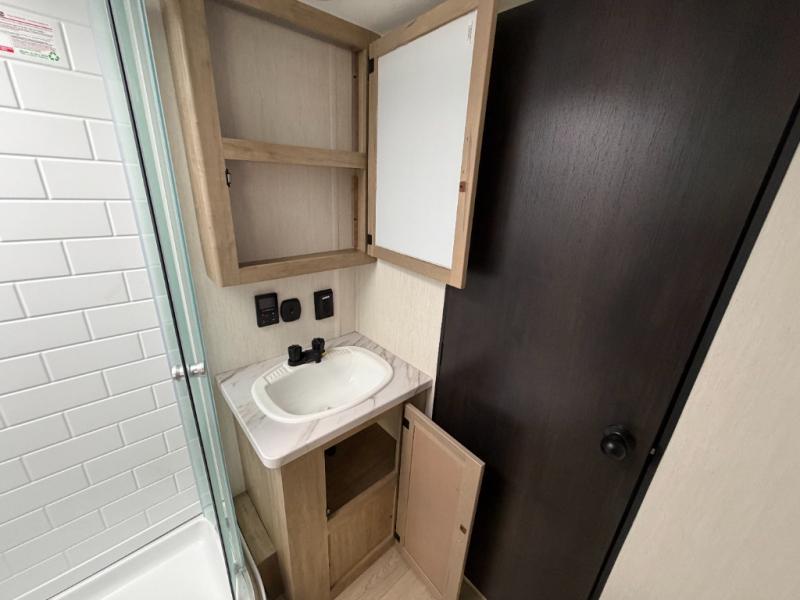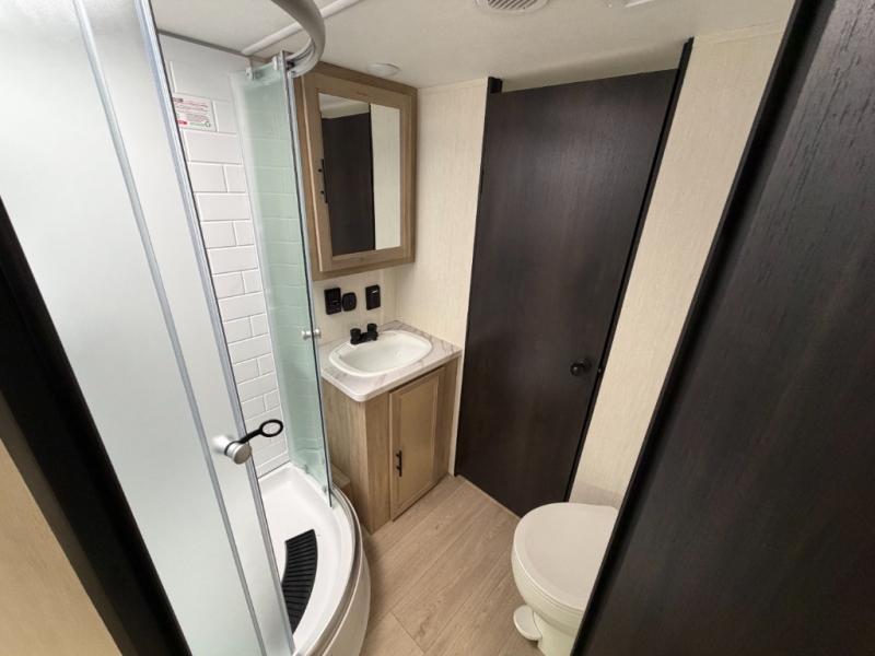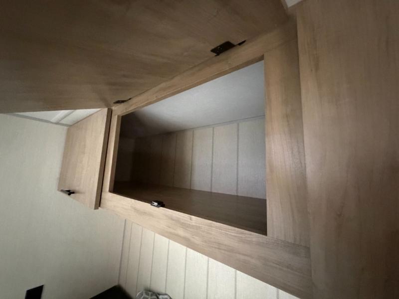 Since this travel trailer features dual entry doors, you can enter in through the rear master bedroom or the front kitchen; how convenient! The kitchen includes ample counter space and all the appliances to prep meals, along with a pantry up front and a hidden pantry behind the fireplace. Your crew can get comfortable on the sofa or play a game around the U-shaped dinette, although you may just find yourselves outdoors since there is an outside kitchen and a power awning with LED lights. The dual entry bath will let you enter in through the main living area, plus it has a private entrance into the bedroom. Here, you'll find an RV king bed, a wardrobe for your things, and USB ports to keep your electronics charged!