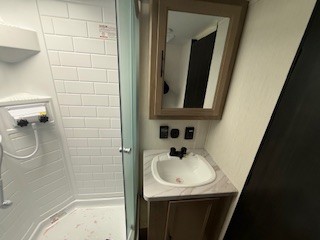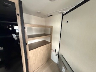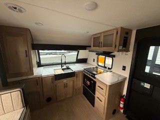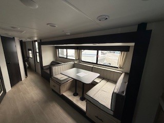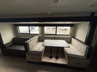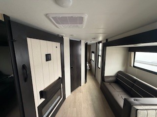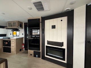 Since this travel trailer features dual entry doors, you can enter in through the rear master bedroom or the front kitchen; how convenient! The kitchen includes ample counter space and all the appliances to prep meals, along with a pantry up front and a hidden pantry behind the fireplace. Your crew can get comfortable on the sofa or play a game around the U-shaped dinette, although you may just find yourselves outdoors since there is an outside kitchen and a power awning with LED lights. The dual entry bath will let you enter in through the main living area, plus it has a private entrance into the bedroom. Here, you'll find an RV king bed, a wardrobe for your things, and USB ports to keep your electronics charged!