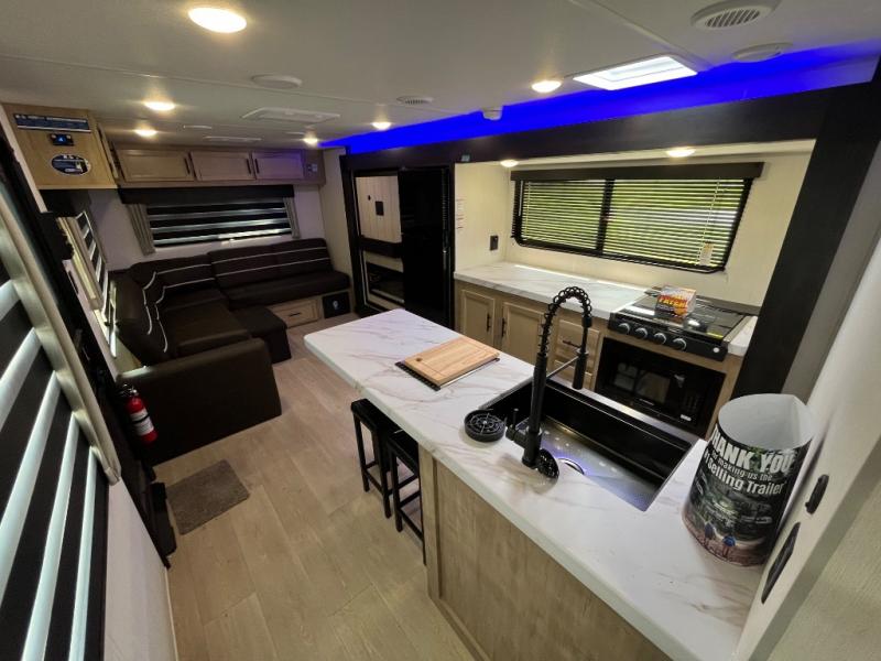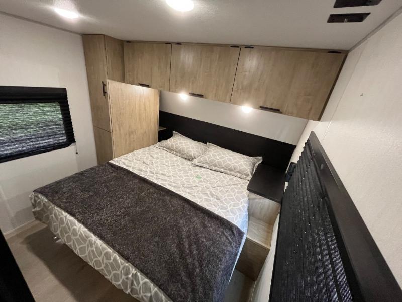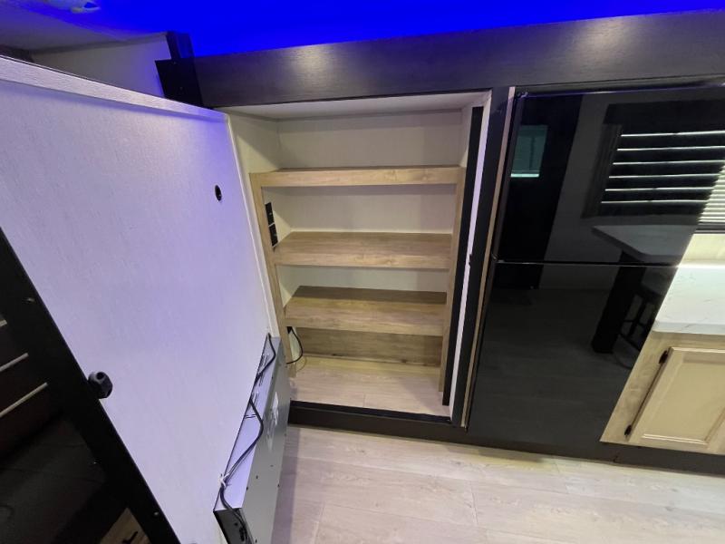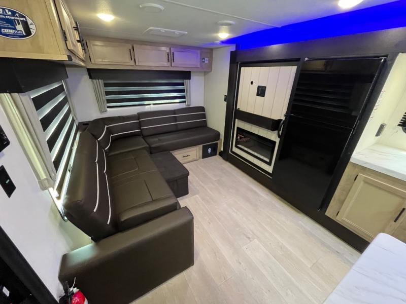 This travel trailer will feel just like home with its RV king bed in the front bedroom plus the full bath with a tub/shower, and there is a spacious living area thanks to the large slide out. Here, you'll find the air fryer and counter space, 12V refrigerator, and the fireplace with a hidden pantry behind it. Your crew can relax on the L-shaped sofa, or visit with the chef while they prep meals at the island peninsula. There are even two bar stools here for added convenience. Head outdoors to enjoy the power awning with LED lights in the evening!