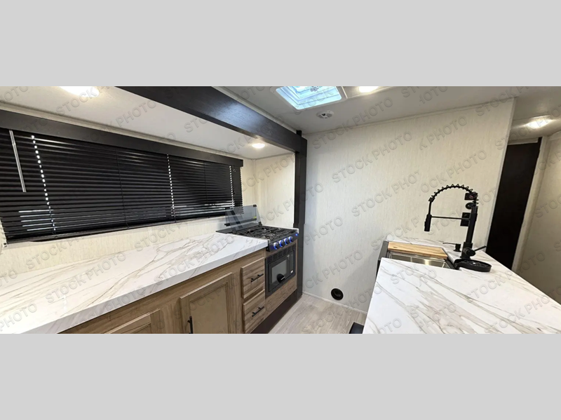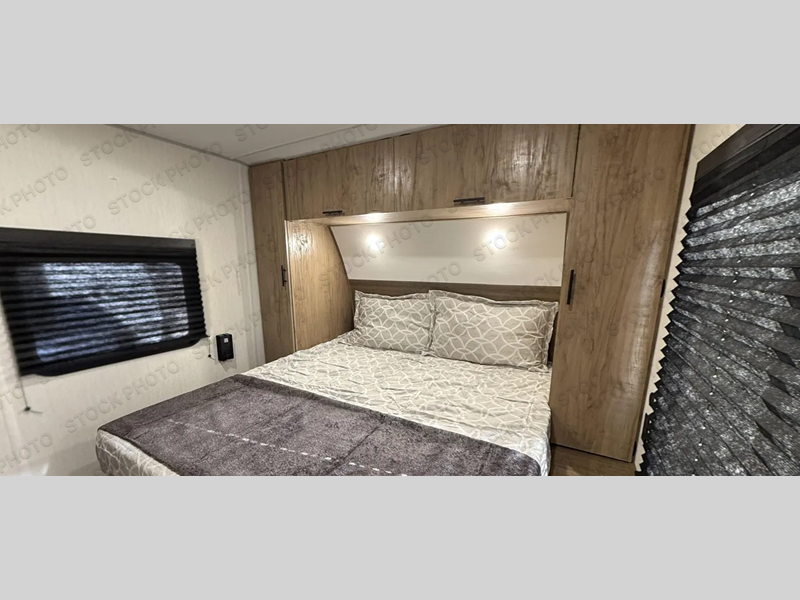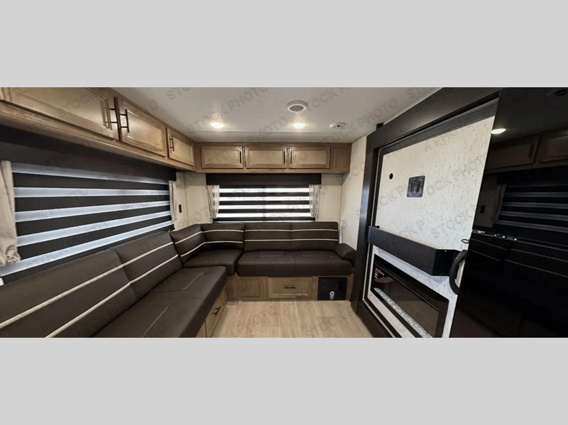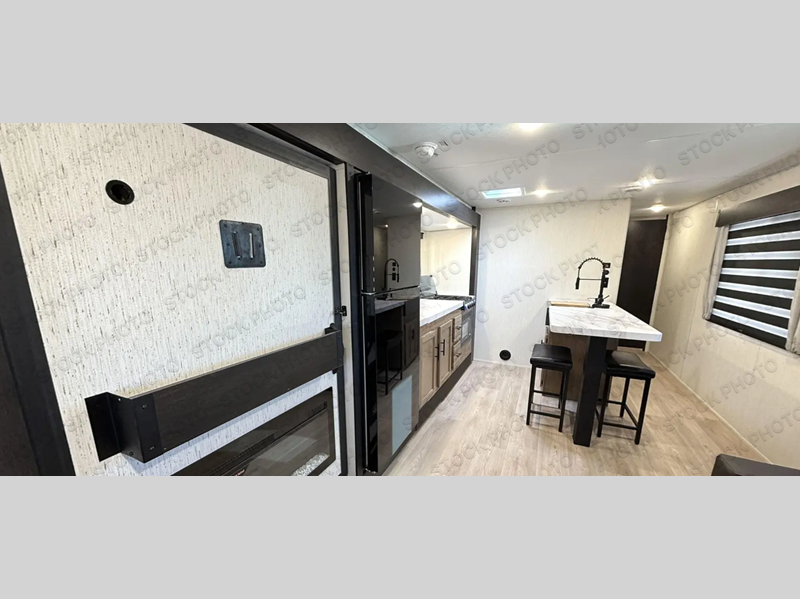 This travel trailer will feel just like home with its RV king bed in the front bedroom plus the full bath with a tub/shower, and there is a spacious living area thanks to the large slide out. Here, you'll find the air fryer and counter space, 12V refrigerator, and the fireplace with a hidden pantry behind it. Your crew can relax on the L-shaped sofa, or visit with the chef while they prep meals at the island peninsula. There are even two bar stools here for added convenience. Head outdoors to enjoy the power awning with LED lights in the evening!