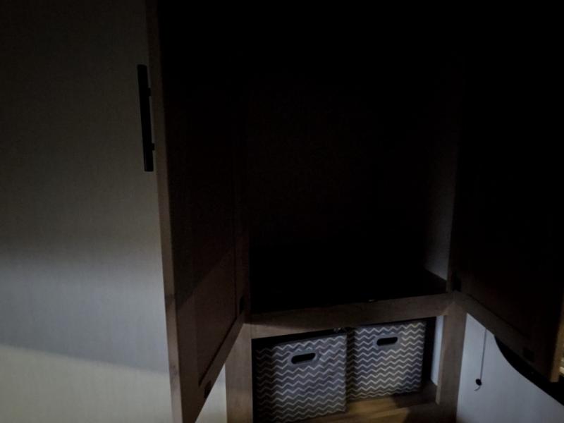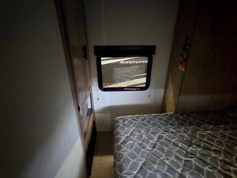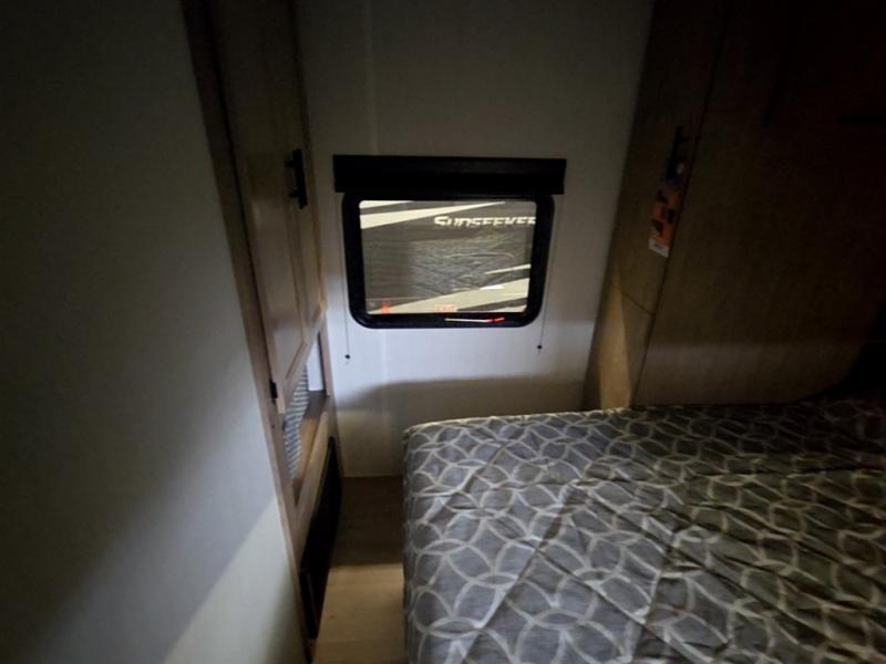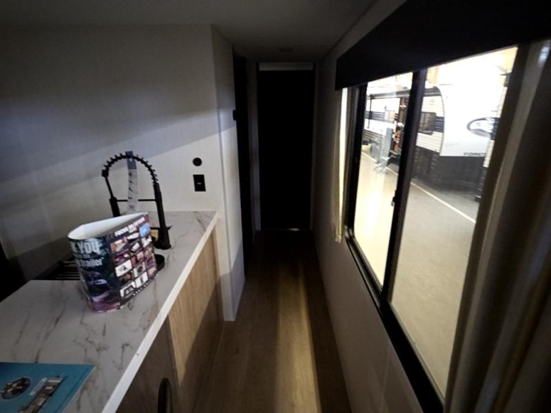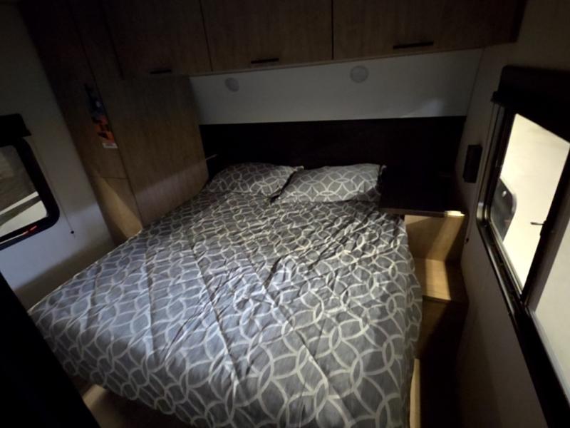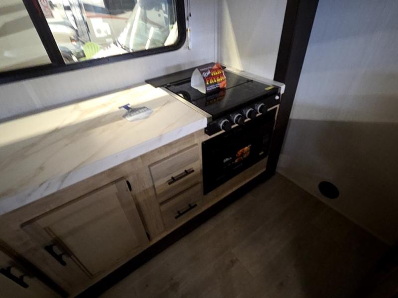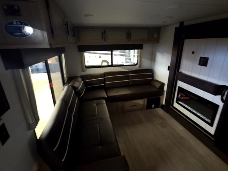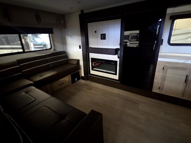 This travel trailer will feel just like home with its RV king bed in the front bedroom plus the full bath with a tub/shower, and there is a spacious living area thanks to the large slide out. Here, you'll find the air fryer and counter space, 12V refrigerator, and the fireplace with a hidden pantry behind it. Your crew can relax on the L-shaped sofa, or visit with the chef while they prep meals at the island peninsula. There are even two bar stools here for added convenience. Head outdoors to enjoy the power awning with LED lights in the evening!