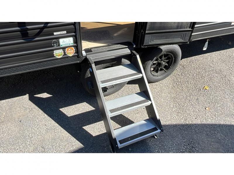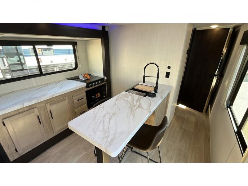 This travel trailer will feel just like home with its RV king bed in the front bedroom plus the full bath with a tub/shower, and there is a spacious living area thanks to the large slide out. Here, you'll find the air fryer and counter space, 12V refrigerator, and the fireplace with a hidden pantry behind it. Your crew can relax on the L-shaped sofa, or visit with the chef while they prep meals at the island peninsula. There are even two bar stools here for added convenience. Head outdoors to enjoy the power awning with LED lights in the evening!