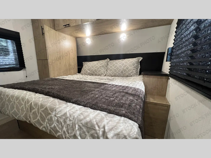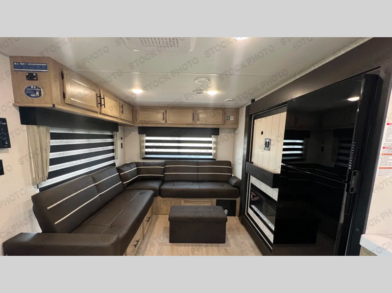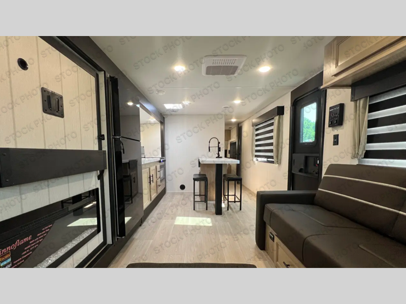 This travel trailer will feel just like home with its RV king bed in the front bedroom plus the full bath with a tub/shower, and there is a spacious living area thanks to the large slide out. Here, you'll find the air fryer and counter space, 12V refrigerator, and the fireplace with a hidden pantry behind it. Your crew can relax on the L-shaped sofa, or visit with the chef while they prep meals at the island peninsula. There are even two bar stools here for added convenience. Head outdoors to enjoy the power awning with LED lights in the evening!