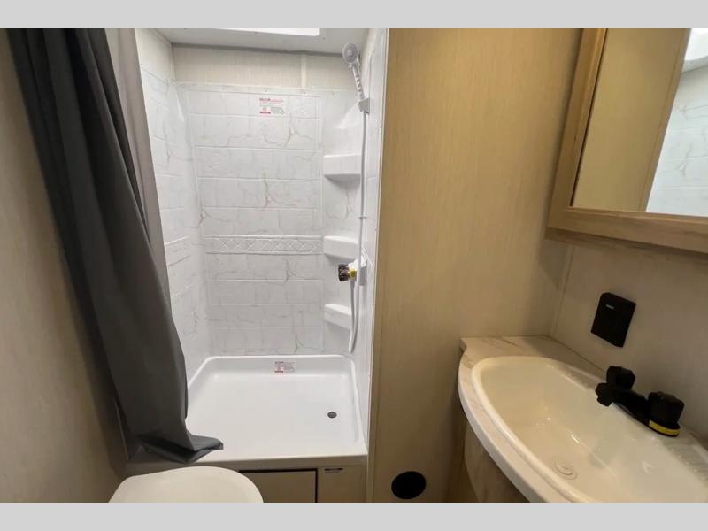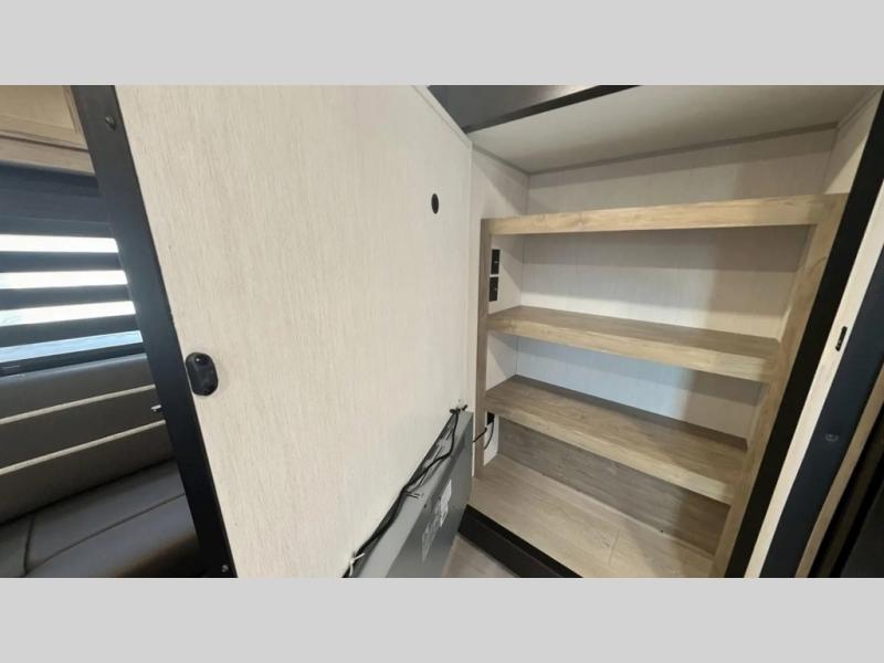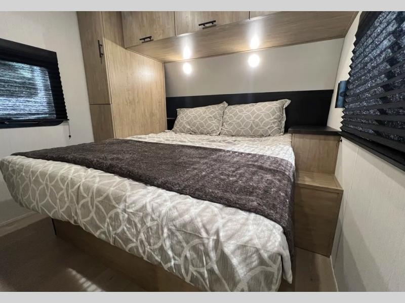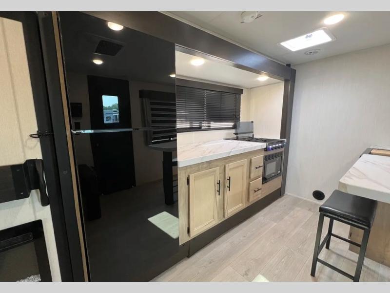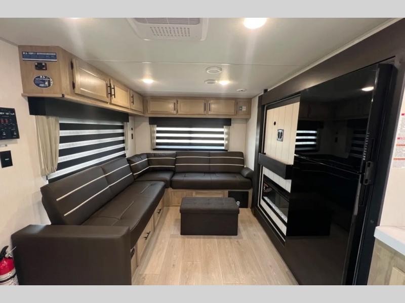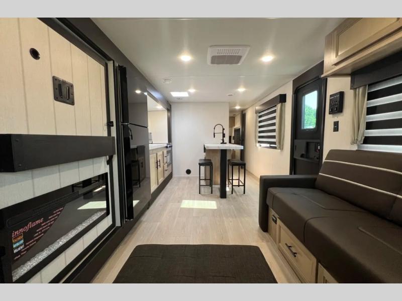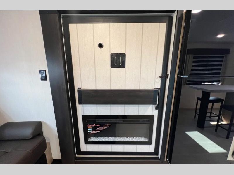 This travel trailer will feel just like home with its RV king bed in the front bedroom plus the full bath with a tub/shower, and there is a spacious living area thanks to the large slide out. Here, you'll find the air fryer and counter space, 12V refrigerator, and the fireplace with a hidden pantry behind it. Your crew can relax on the L-shaped sofa, or visit with the chef while they prep meals at the island peninsula. There are even two bar stools here for added convenience. Head outdoors to enjoy the power awning with LED lights in the evening!