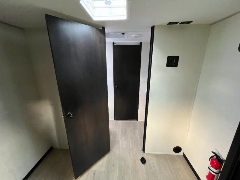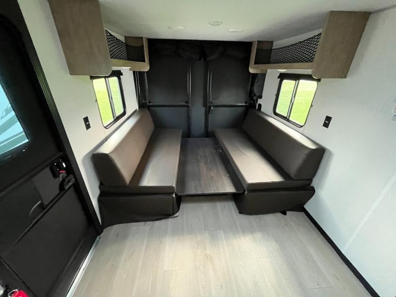This Cherokee Grey Wolf toy hauler is perfect for those who are concerned about keeping the fuel smells and grime from entering the main living area. In this unit you can enjoy the separation with a door and the walk-though bath. In the cargo area, you will have plenty of space for hauling all of your favorite toys. This area also features dual fold-down sofas with a removable table that is great for your thrill seekers to come in for a break from riding. It also allows quick access into the bathroom without having to wander through the entire main living area where you are likely to leave a trail behind. After a full day of playing hard, you can get cleaned up and head into the main kitchen area where you will enjoy a U-shaped dinette. A full kitchen allows you to refuel your body, and there is also an RV king bed up front for a great night's rest!