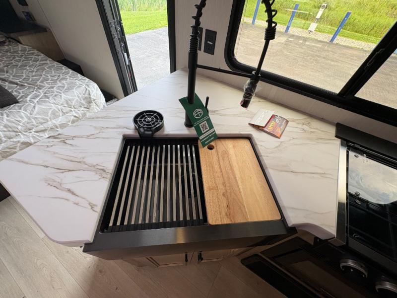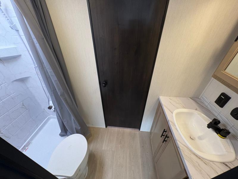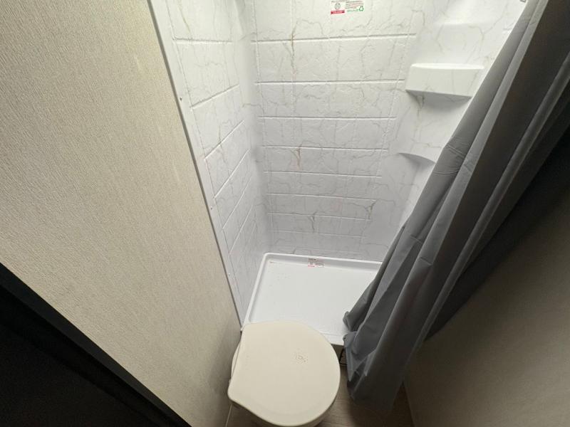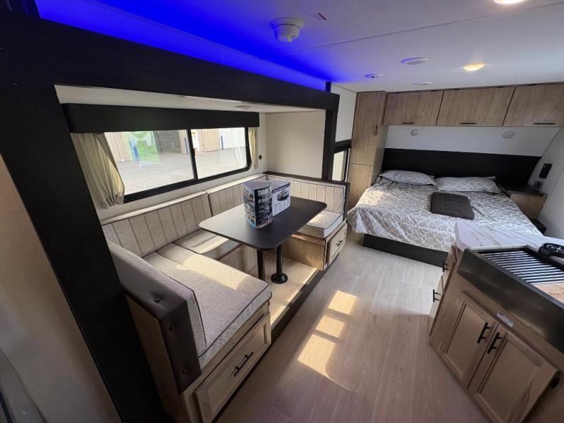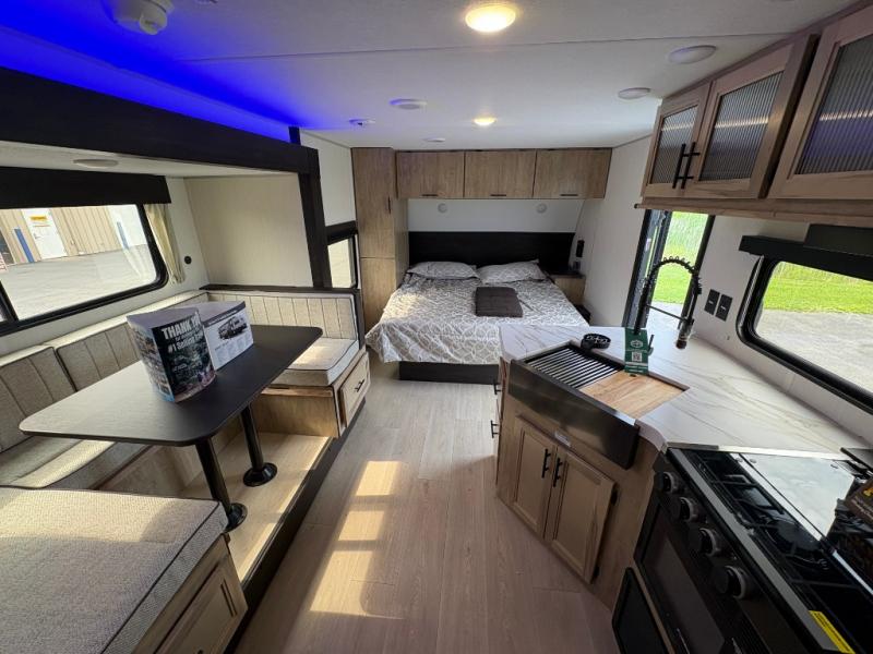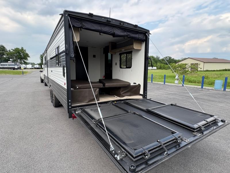 This Cherokee Grey Wolf toy hauler is perfect for those who are concerned about keeping the fuel smells and grime from entering the main living area. In this unit you can enjoy the separation with a door and the walk-though bath. In the cargo area, you will have plenty of space for hauling all of your favorite toys. This area also features dual fold-down sofas with a removable table that is great for your thrill seekers to come in for a break from riding. It also allows quick access into the bathroom without having to wander through the entire main living area where you are likely to leave a trail behind. After a full day of playing hard, you can get cleaned up and head into the main kitchen area where you will enjoy a U-shaped dinette. A full kitchen allows you to refuel your body, and there is also an RV king bed up front for a great night's rest!