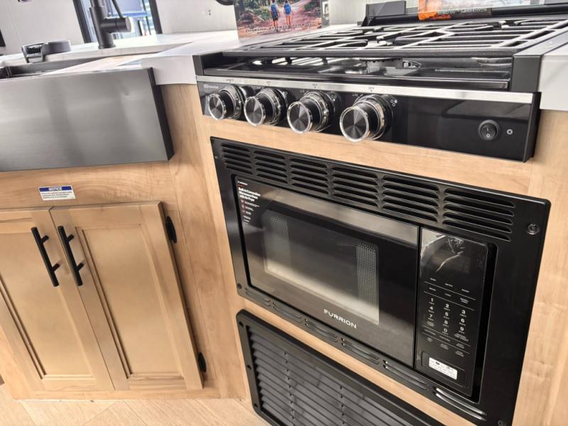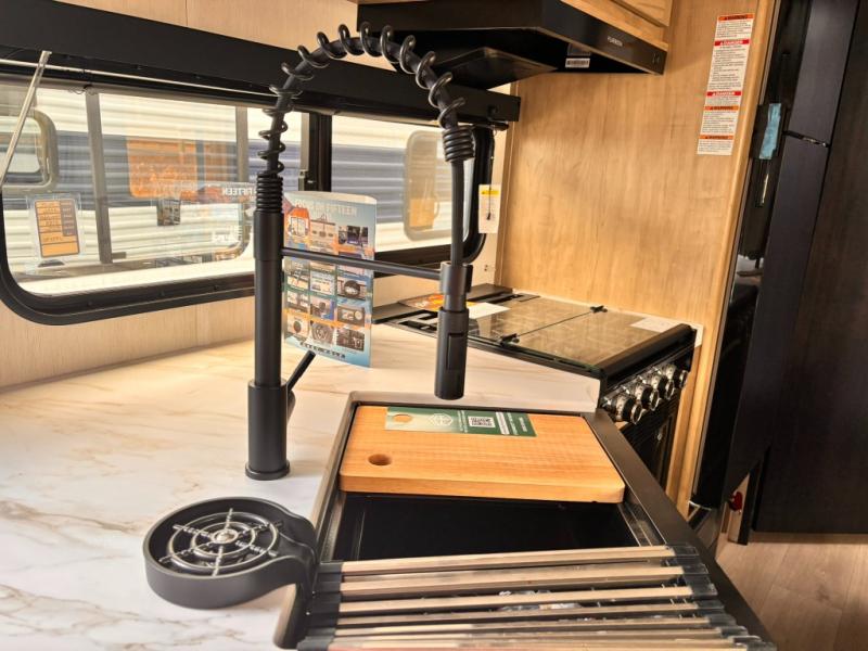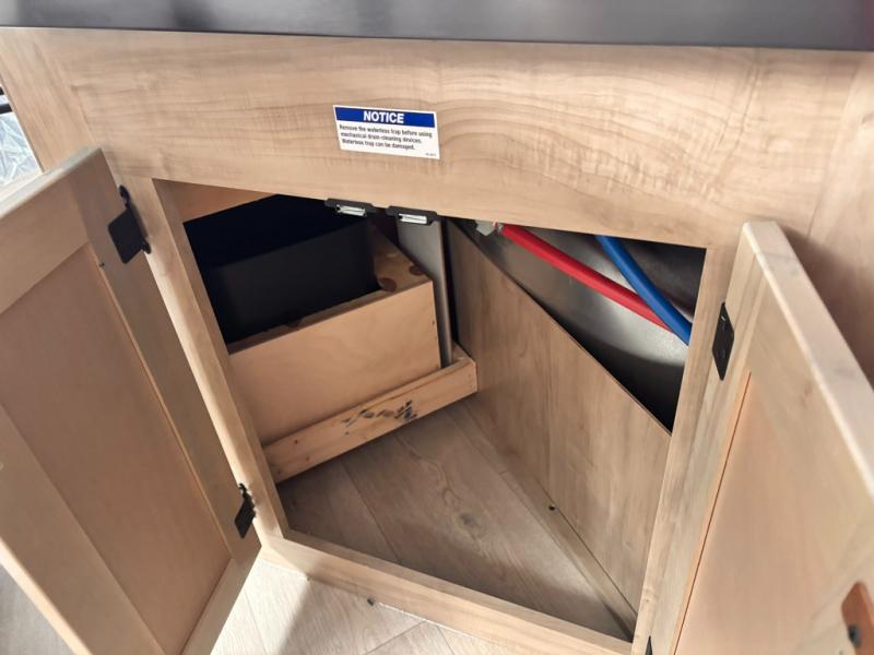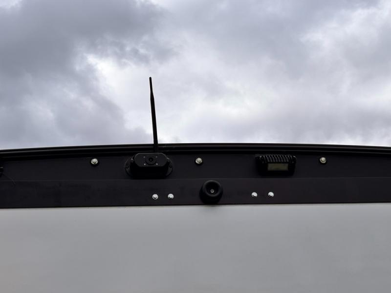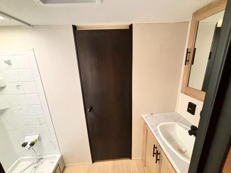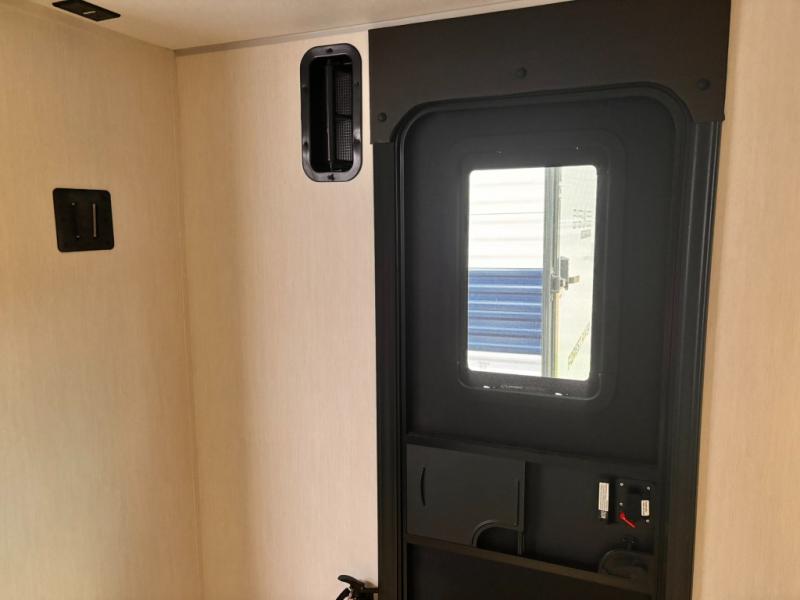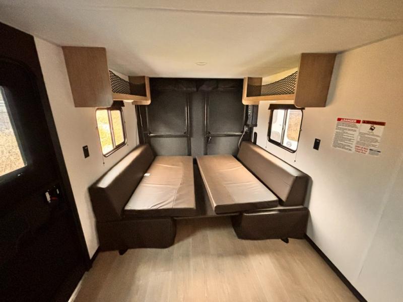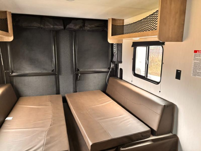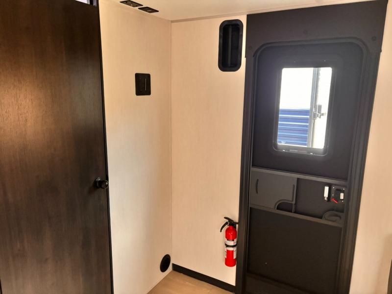 This Cherokee Grey Wolf toy hauler is perfect for those who are concerned about keeping the fuel smells and grime from entering the main living area. In this unit you can enjoy the separation with a door and the walk-though bath. In the cargo area, you will have plenty of space for hauling all of your favorite toys. This area also features dual fold-down sofas with a removable table that is great for your thrill seekers to come in for a break from riding. It also allows quick access into the bathroom without having to wander through the entire main living area where you are likely to leave a trail behind. After a full day of playing hard, you can get cleaned up and head into the main kitchen area where you will enjoy a U-shaped dinette. A full kitchen allows you to refuel your body, and there is also an RV king bed up front for a great night's rest!