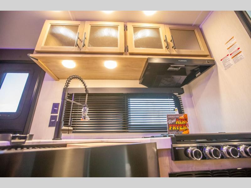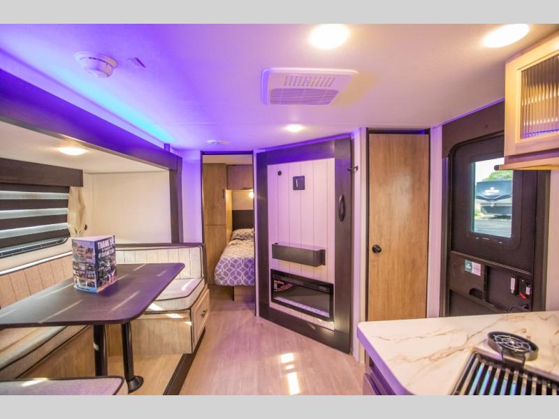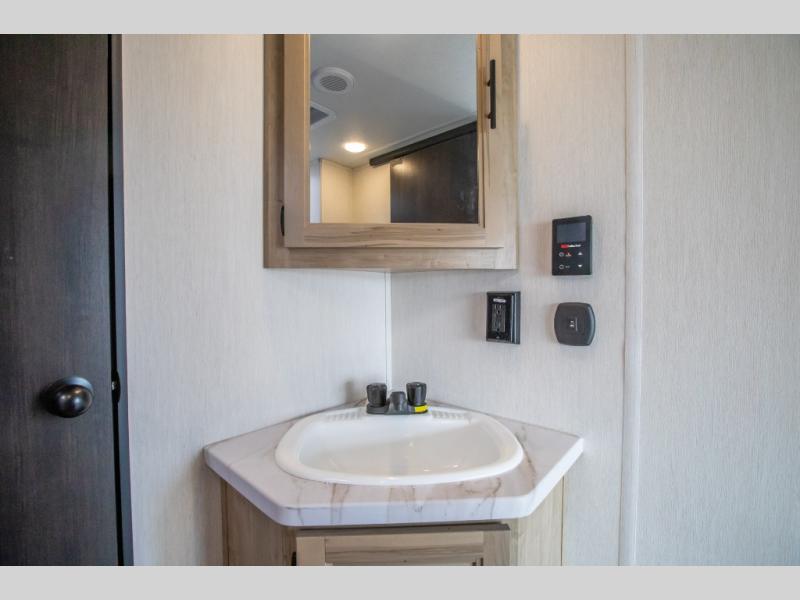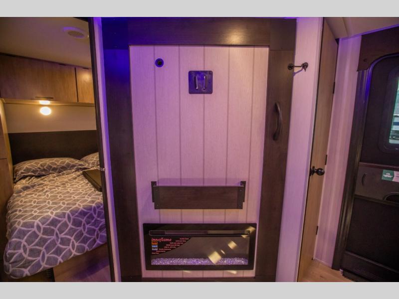 This Cherokee Grey Wolf toy hauler is perfect for those who are concerned about keeping the fuel smells and grime from entering the main living area. In this unit you can enjoy the separation with a door and the walk-though bath. In the cargo area, you will have plenty of space for hauling all of your favorite toys. This area also features a fold-down sofa with a removable table that is great for your thrill seekers to come in for a break from riding. It also allows quick access into the bathroom without having to wander through the entire main living area where you are likely to leave a trail behind. After a full day of playing hard, you can get cleaned up and head into the main kitchen area where you will enjoy a U-shaped dinette. A full kitchen allows you to refuel your body, and there is an entertainment center with a fireplace and hidden shelves behind for books or movies. The front private bedroom will give you your own space at night, and you'll love the RV king bed!