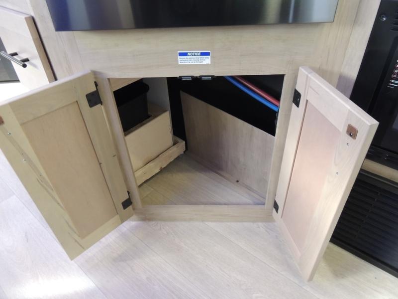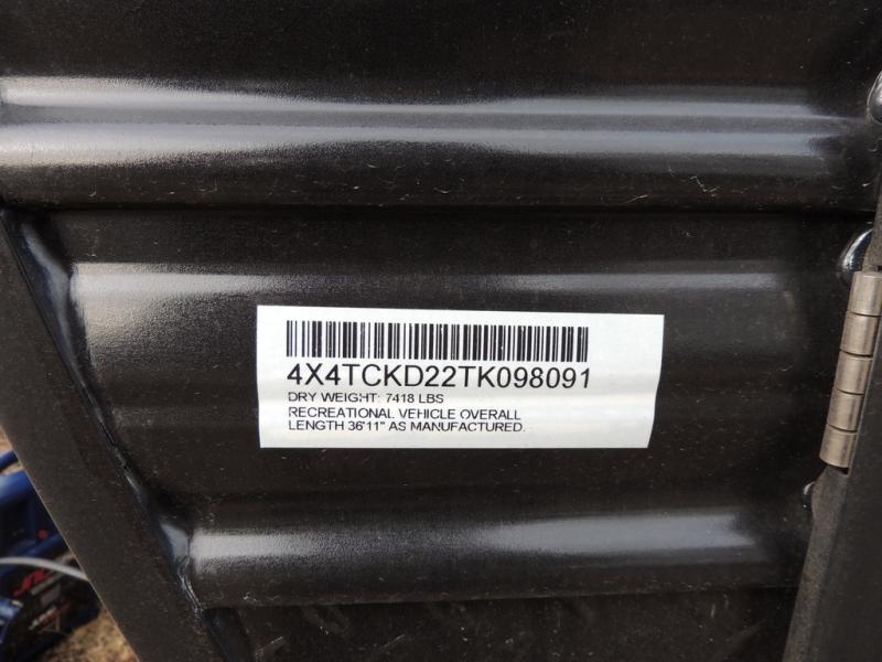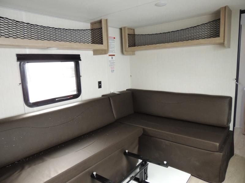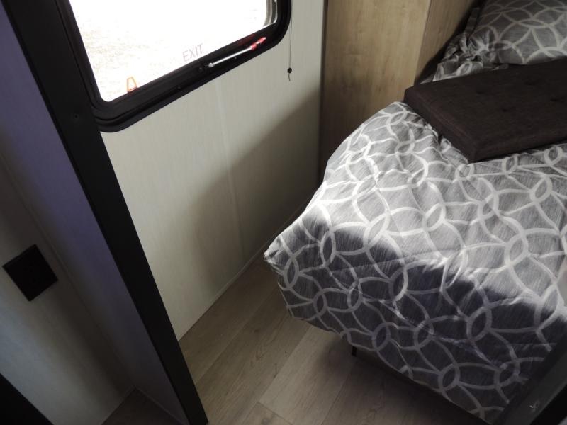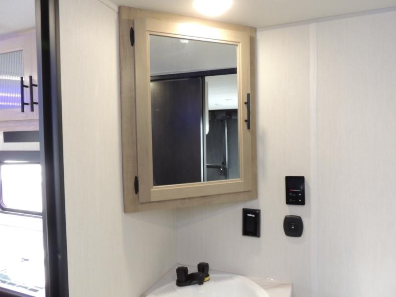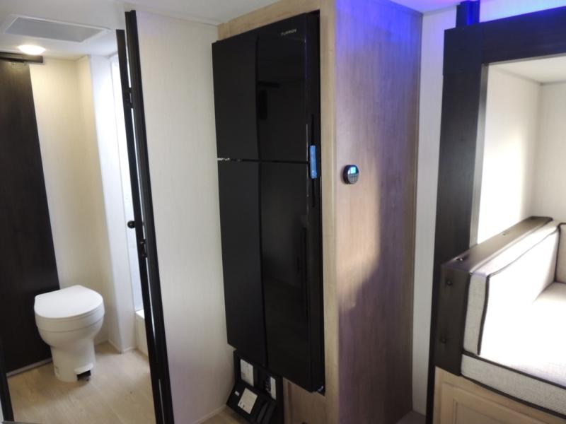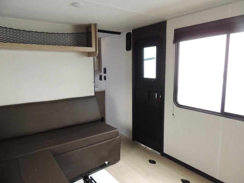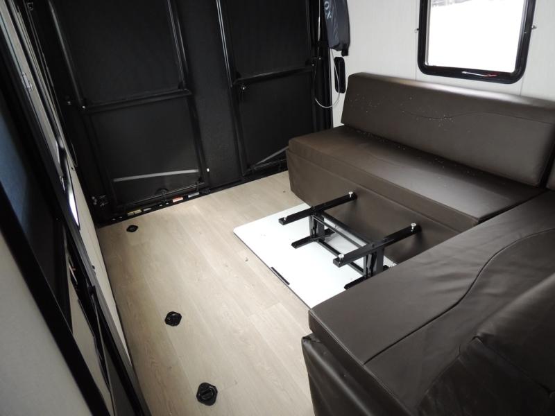 This Cherokee Grey Wolf toy hauler is perfect for those who are concerned about keeping the fuel smells and grime from entering the main living area. In this unit you can enjoy the separation with a door and the walk-though bath. In the cargo area, you will have plenty of space for hauling all of your favorite toys. This area also features a fold-down sofa with a removable table that is great for your thrill seekers to come in for a break from riding. It also allows quick access into the bathroom without having to wander through the entire main living area where you are likely to leave a trail behind. After a full day of playing hard, you can get cleaned up and head into the main kitchen area where you will enjoy a U-shaped dinette. A full kitchen allows you to refuel your body, and there is an entertainment center with a fireplace and hidden shelves behind for books or movies. The front private bedroom will give you your own space at night, and you'll love the RV king bed!