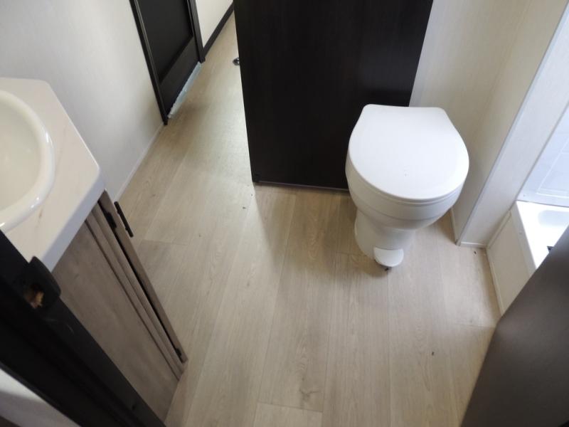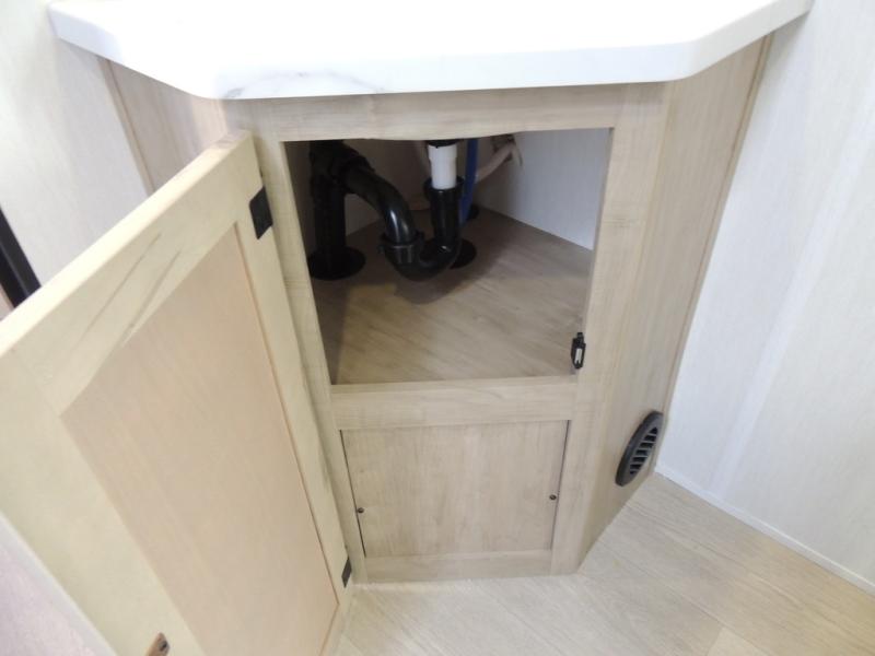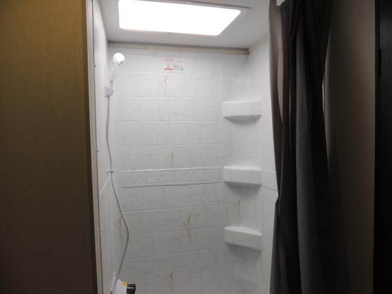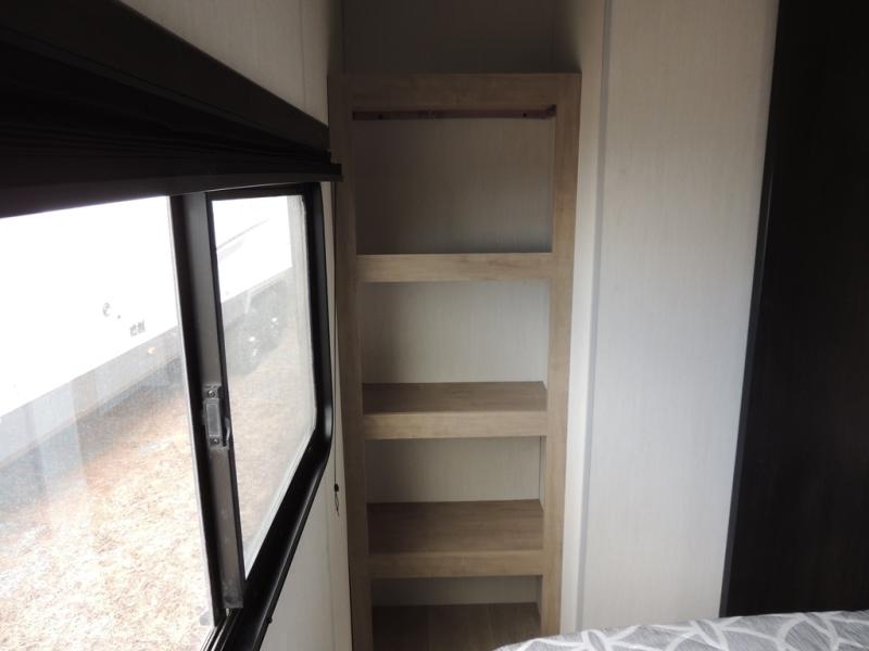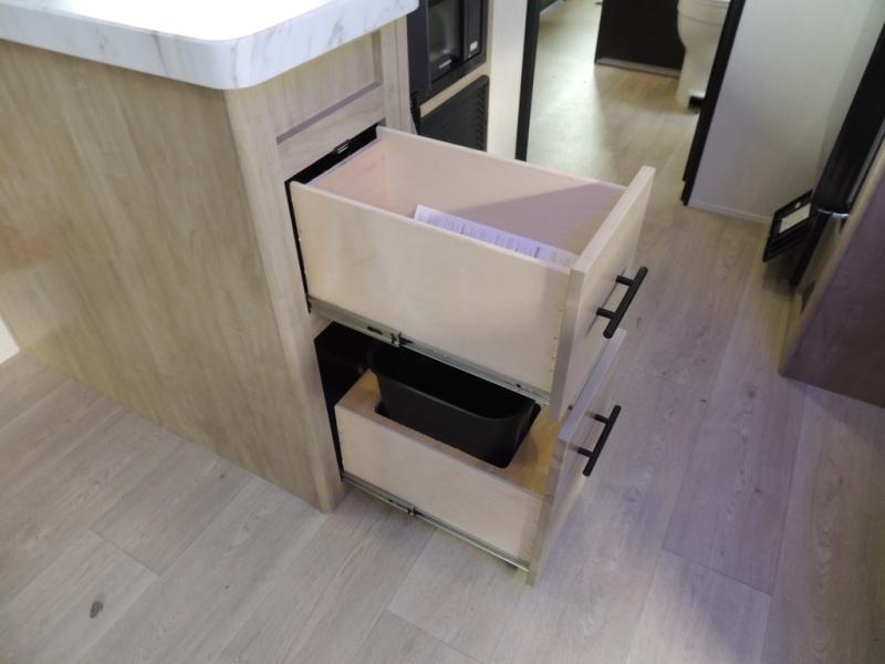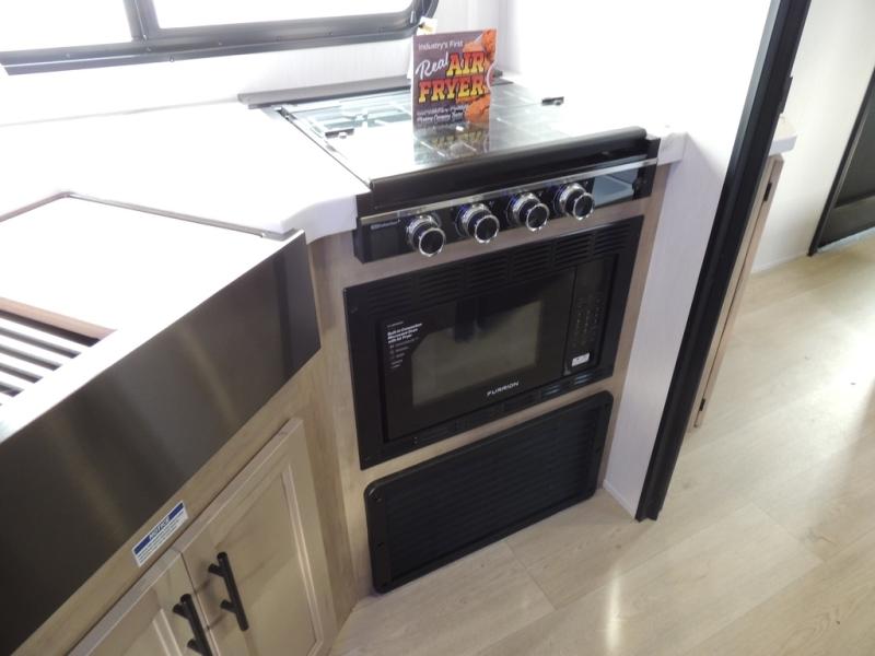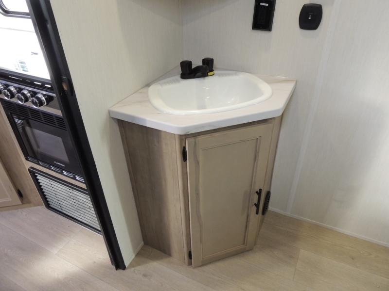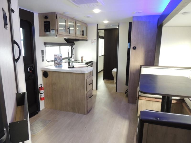 This Cherokee Grey Wolf toy hauler is perfect for those who are concerned about keeping the fuel smells and grime from entering the main living area. In this unit you can enjoy the separation with a door and the walk-though bath. In the cargo area, you will have plenty of space for hauling all of your favorite toys. This area also features a fold-down sofa with a removable table that is great for your thrill seekers to come in for a break from riding. It also allows quick access into the bathroom without having to wander through the entire main living area where you are likely to leave a trail behind. After a full day of playing hard, you can get cleaned up and head into the main kitchen area where you will enjoy a U-shaped dinette. A full kitchen allows you to refuel your body, and there is an entertainment center with a fireplace and hidden shelves behind for books or movies. The front private bedroom will give you your own space at night, and you'll love the RV king bed!