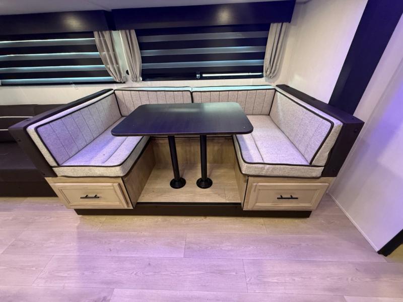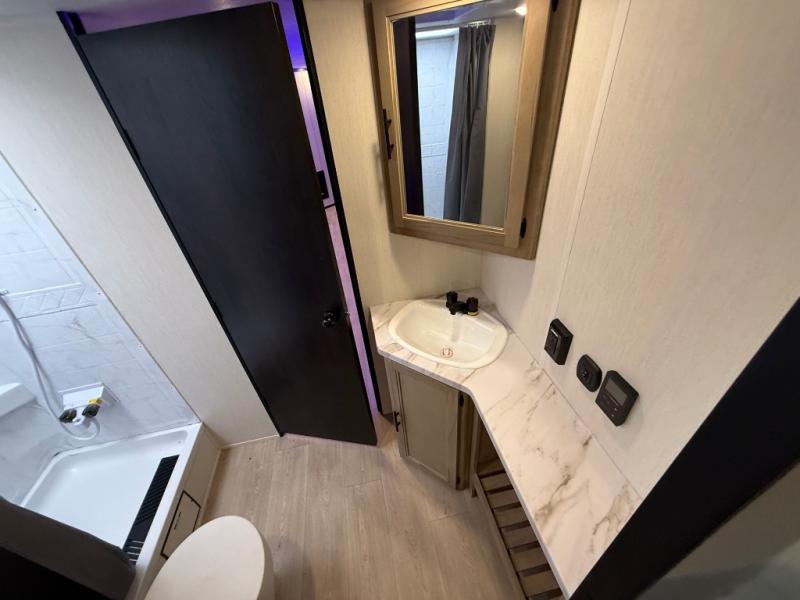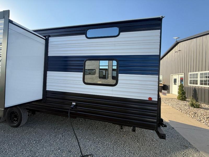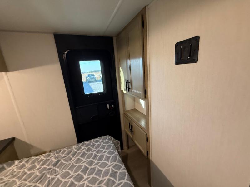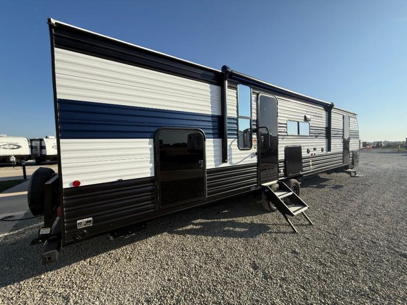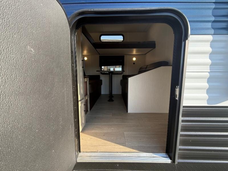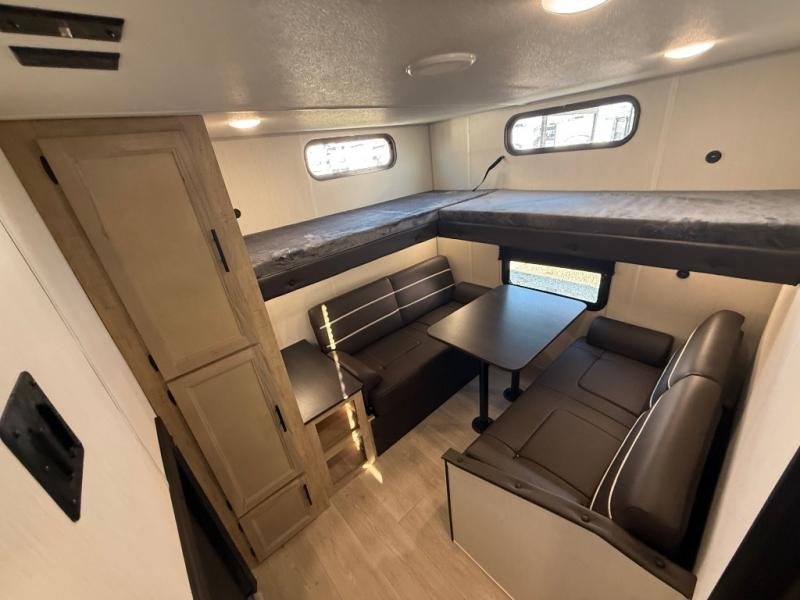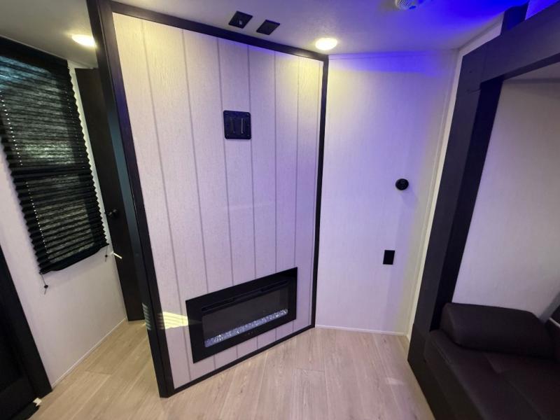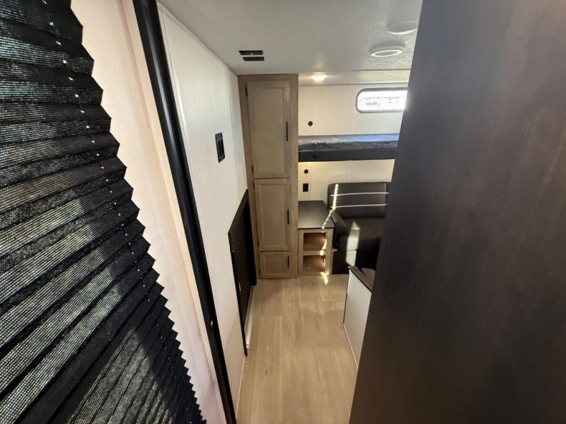 You will love how easy it is to enter/exit this travel trailer with dual entry doors! The rear door leads into the living/kitchen area where you will notice the large U-shaped dinette and the sofa which sit on the slide and create a spacious footprint for moving about, as well as great places to play games and socialize with your friends and family. Plus, there is an entertainment center with a fireplace and a fully equipped kitchen to keep everyone's bellies filled with delicious home cooked meals. At night, there is sleeping space for everyone between the bunks above the sofas with a table in the rear private bunkhouse and the RV king bed in the front private bedroom, plus the furniture can convert into sleeping spaces. The walk-through bathroom leads directly into the bedroom too!