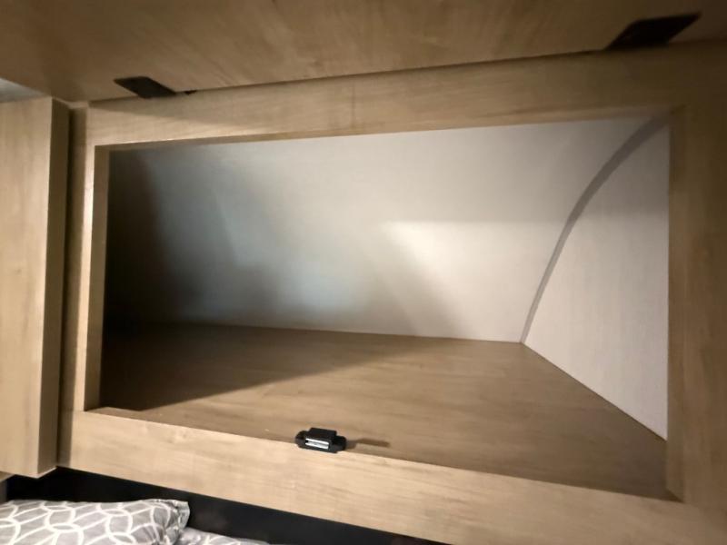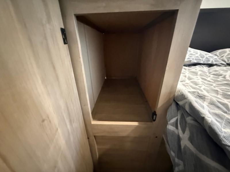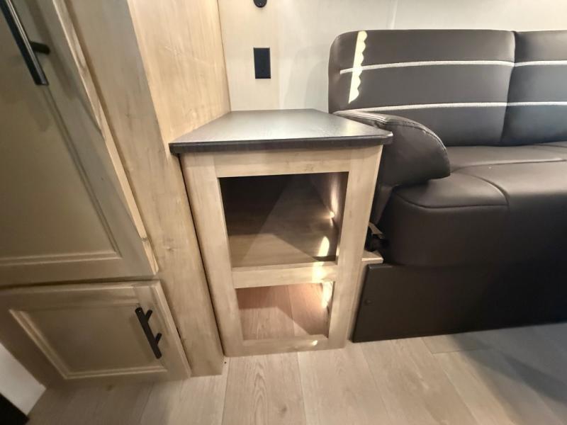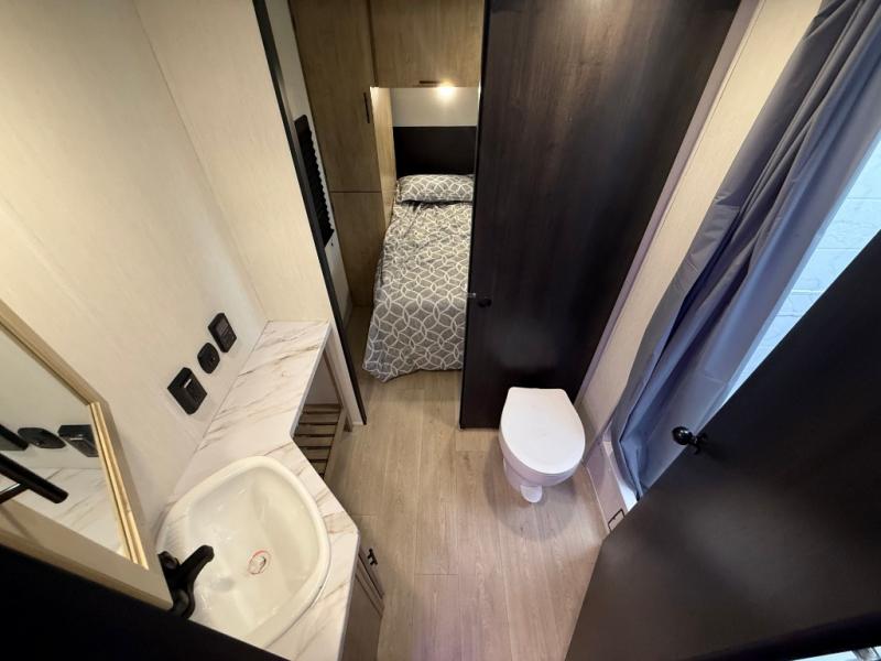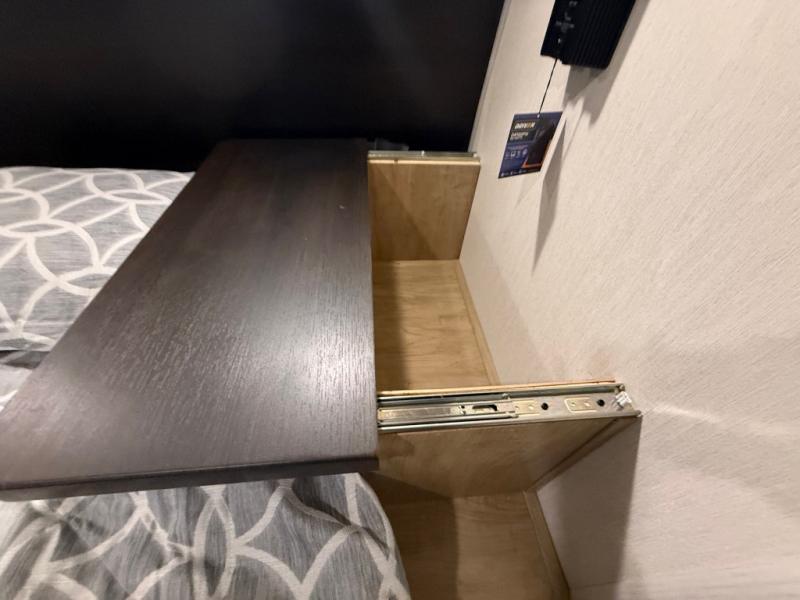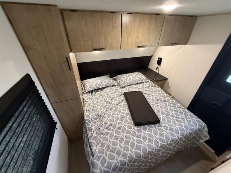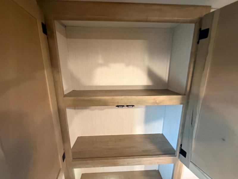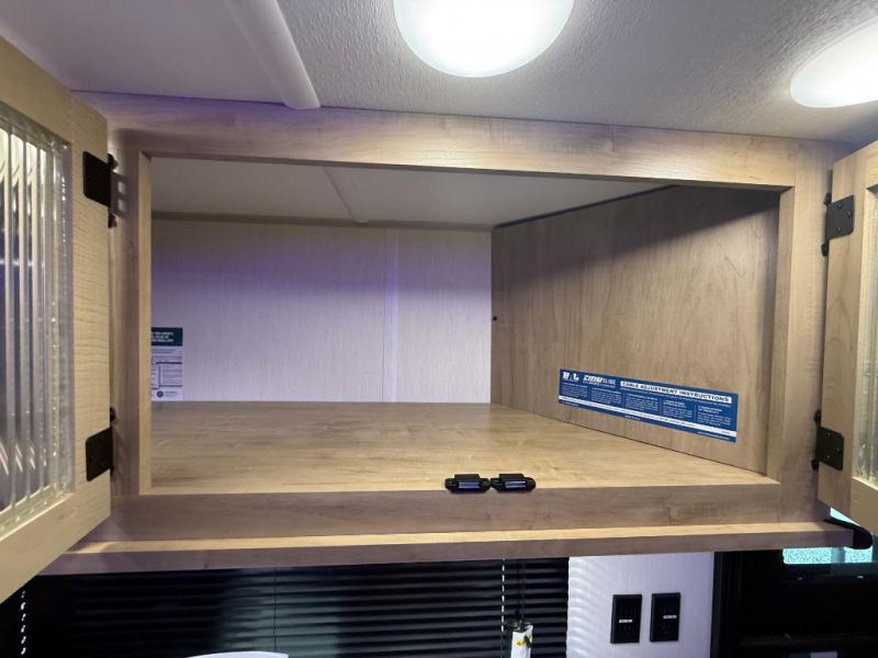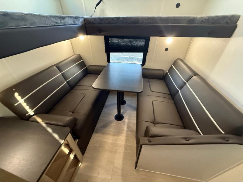 You will love how easy it is to enter/exit this travel trailer with dual entry doors! The rear door leads into the living/kitchen area where you will notice the large U-shaped dinette and the sofa which sit on the slide and create a spacious footprint for moving about, as well as great places to play games and socialize with your friends and family. Plus, there is an entertainment center with a fireplace and a fully equipped kitchen to keep everyone's bellies filled with delicious home cooked meals. At night, there is sleeping space for everyone between the bunks above the sofas with a table in the rear private bunkhouse and the RV king bed in the front private bedroom, plus the furniture can convert into sleeping spaces. The walk-through bathroom leads directly into the bedroom too!