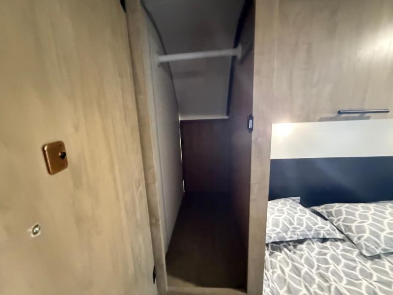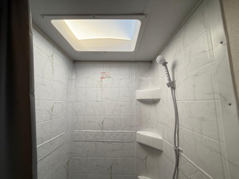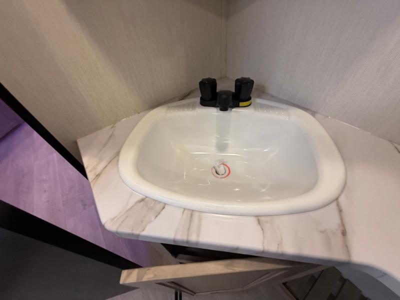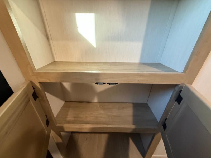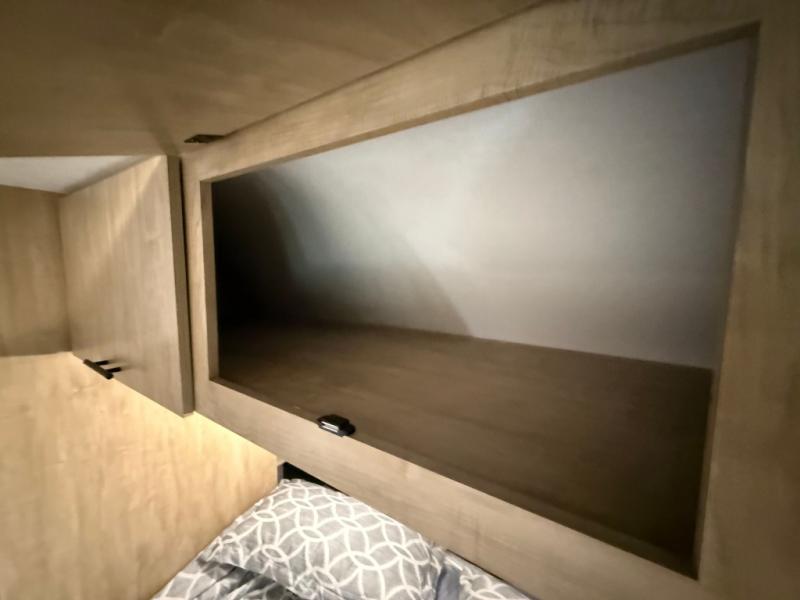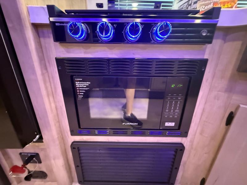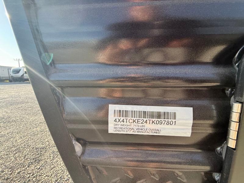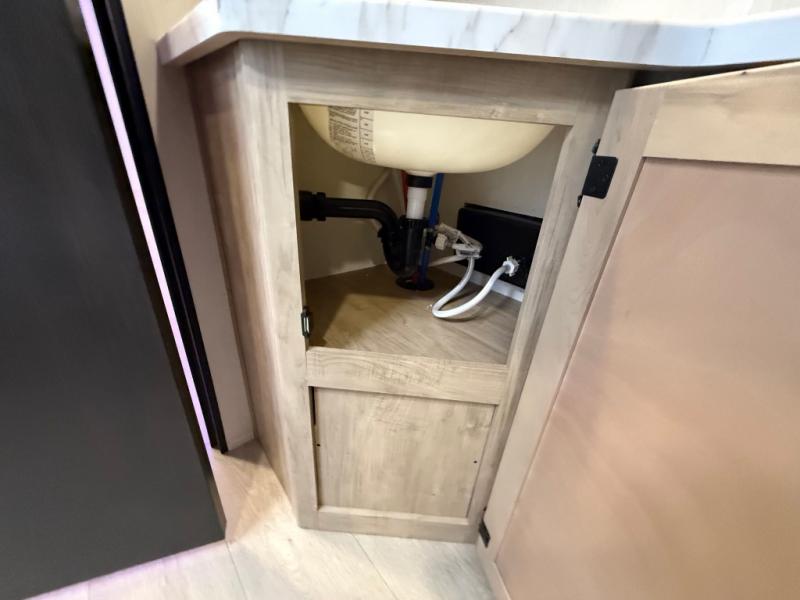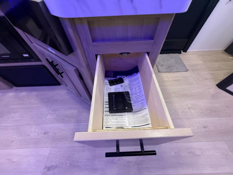 You will love how easy it is to enter/exit this travel trailer with dual entry doors! The rear door leads into the living/kitchen area where you will notice the large U-shaped dinette and the sofa which sit on the slide and create a spacious footprint for moving about, as well as great places to play games and socialize with your friends and family. Plus, there is an entertainment center with a fireplace and a fully equipped kitchen to keep everyone's bellies filled with delicious home cooked meals. At night, there is sleeping space for everyone between the bunks above the sofas with a table in the rear private bunkhouse and the RV king bed in the front private bedroom, plus the furniture can convert into sleeping spaces. The walk-through bathroom leads directly into the bedroom too!