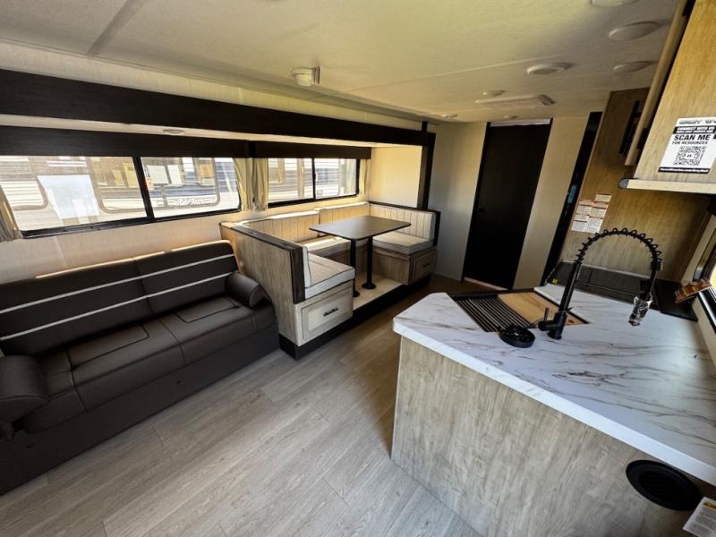 You will love how easy it is to enter/exit this travel trailer with dual entry doors! The rear door leads into the living/kitchen area where you will notice the large U-shaped dinette and the sofa which sit on the slide and create a spacious footprint for moving about, as well as great places to play games and socialize with your friends and family. Plus, there is an entertainment center with a fireplace and a fully equipped kitchen to keep everyone's bellies filled with delicious home cooked meals. At night, there is sleeping space for everyone between the bunks above the sofas with a table in the rear private bunkhouse and the RV king bed in the front private bedroom, plus the furniture can convert into sleeping spaces. The walk-through bathroom leads directly into the bedroom too!