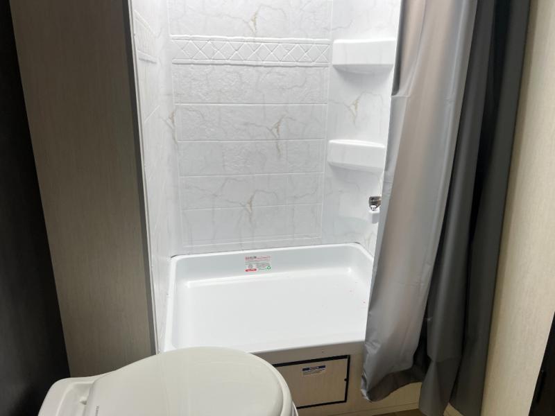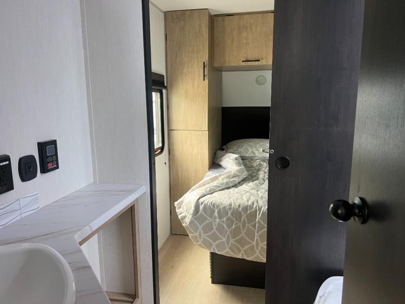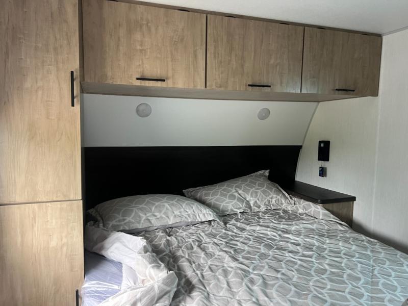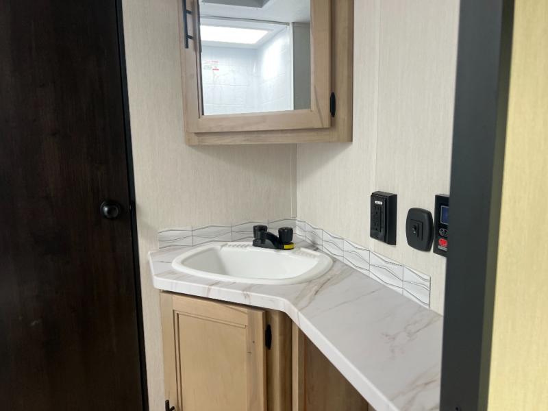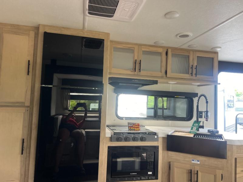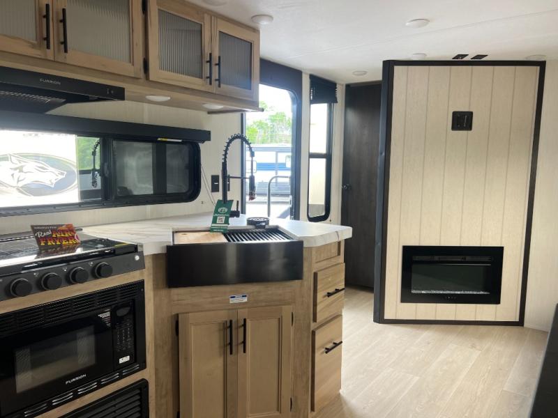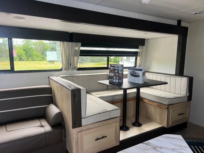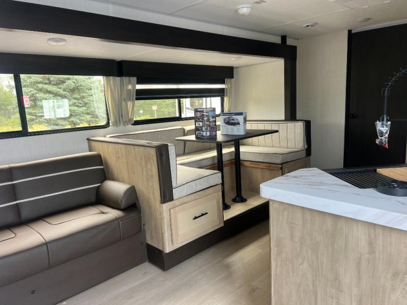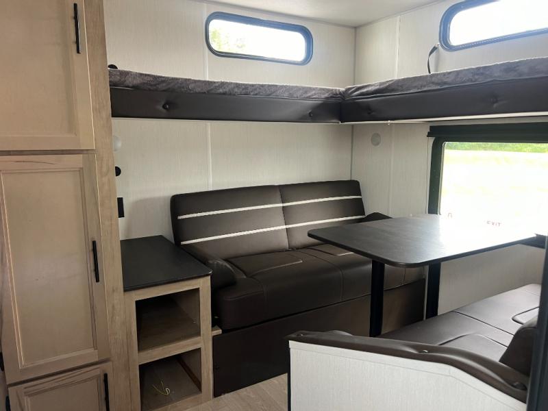 You will love how easy it is to enter/exit this travel trailer with dual entry doors! The rear door leads into the living/kitchen area where you will notice the large U-shaped dinette and the sofa which sit on the slide and create a spacious footprint for moving about, as well as great places to play games and socialize with your friends and family. Plus, there is an entertainment center with a fireplace and a fully equipped kitchen to keep everyone's bellies filled with delicious home cooked meals. At night, there is sleeping space for everyone between the bunks above the sofas with a table in the rear private bunkhouse and the RV king bed in the front private bedroom, plus the furniture can convert into sleeping spaces. The walk-through bathroom leads directly into the bedroom too!