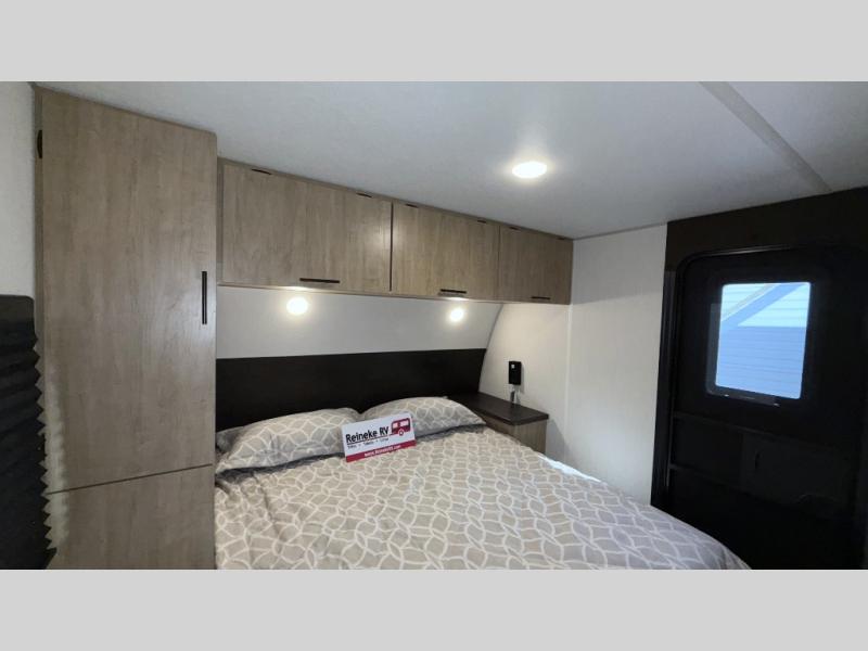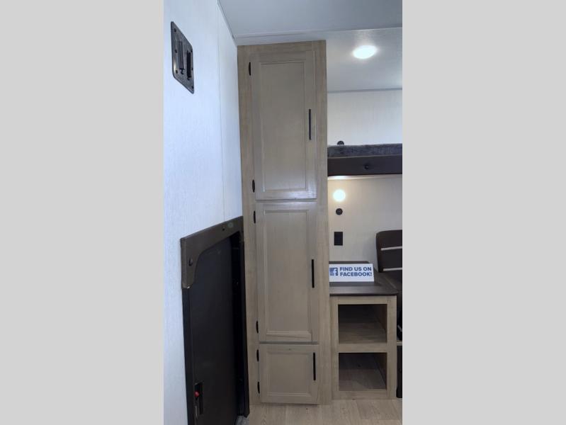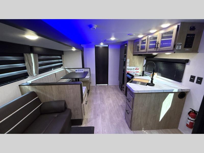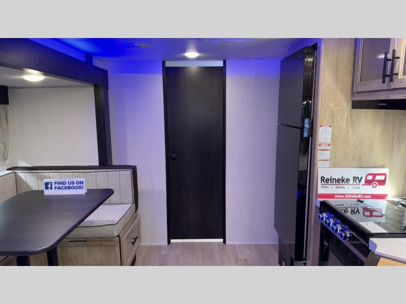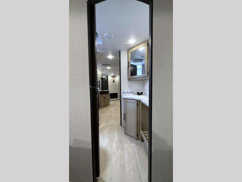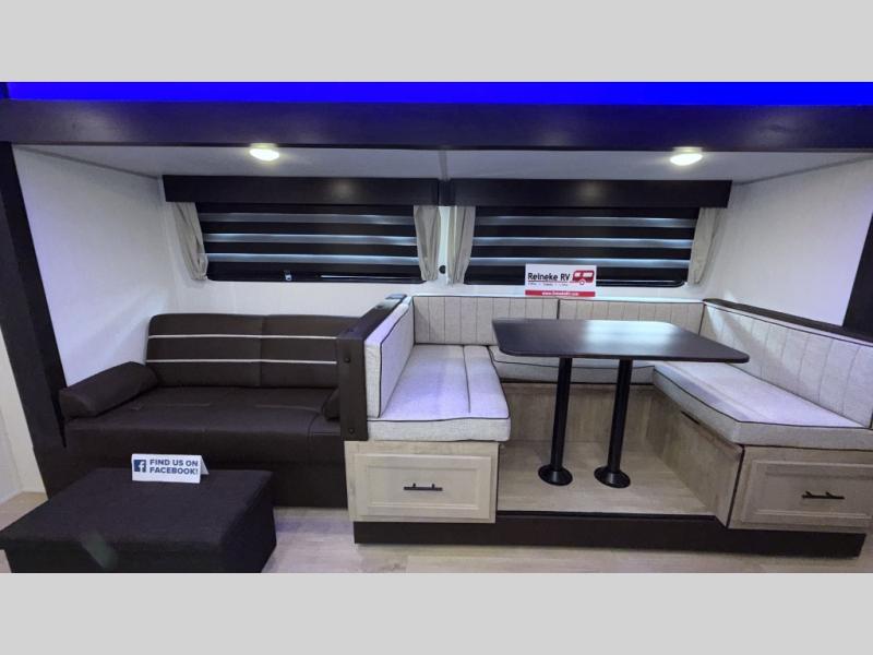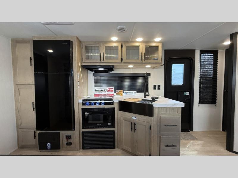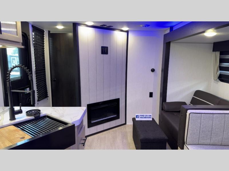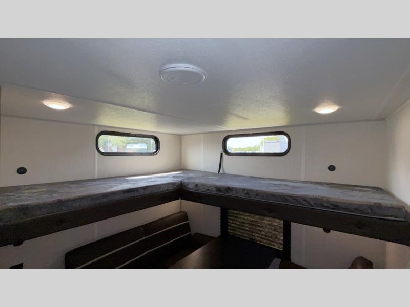 You will love how easy it is to enter/exit this travel trailer with dual entry doors! The rear door leads into the living/kitchen area where you will notice the large U-shaped dinette and the sofa which sit on the slide and create a spacious footprint for moving about, as well as great places to play games and socialize with your friends and family. Plus, there is an entertainment center with a fireplace and a fully equipped kitchen to keep everyone's bellies filled with delicious home cooked meals. At night, there is sleeping space for everyone between the bunks above the sofas with a table in the rear private bunkhouse and the RV king bed in the front private bedroom, plus the furniture can convert into sleeping spaces. The walk-through bathroom leads directly into the bedroom too!