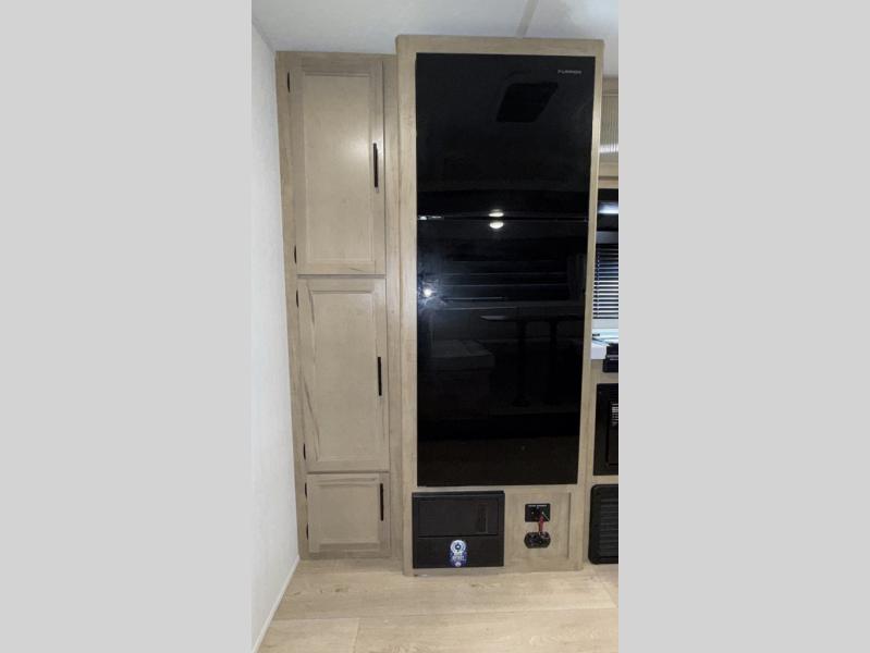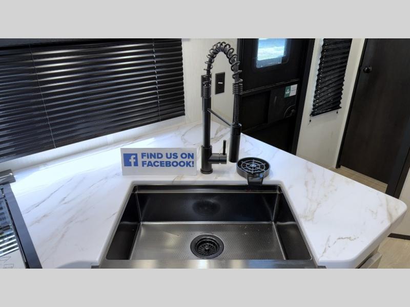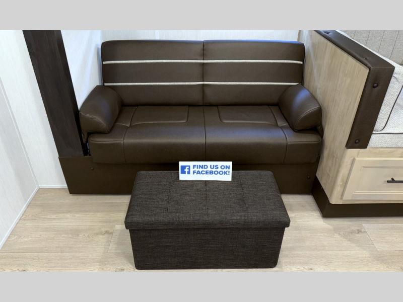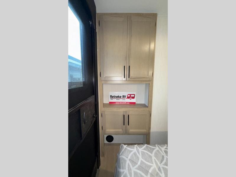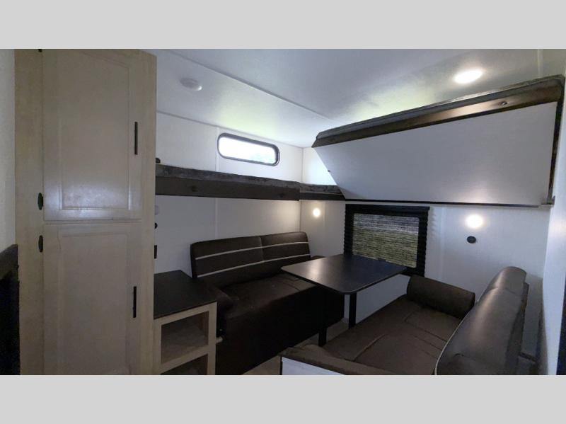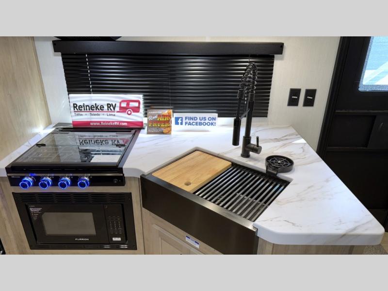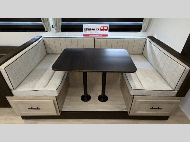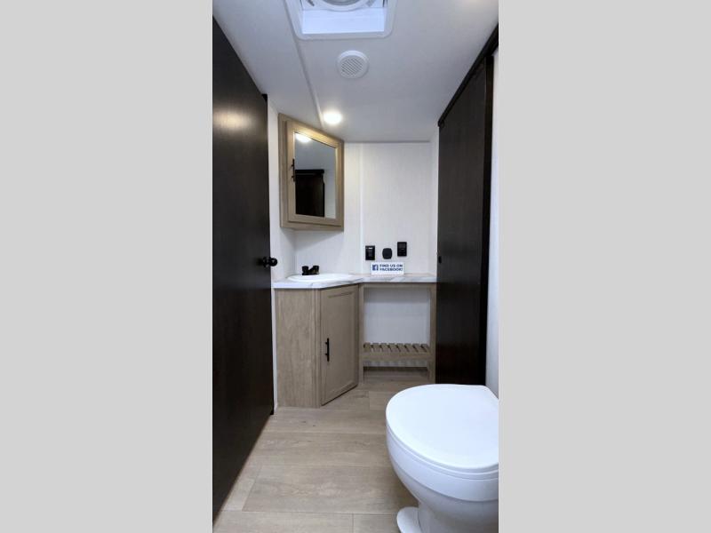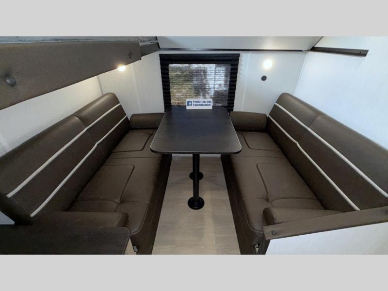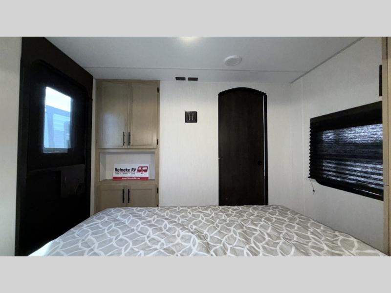 You will love how easy it is to enter/exit this travel trailer with dual entry doors! The rear door leads into the living/kitchen area where you will notice the large U-shaped dinette and the sofa which sit on the slide and create a spacious footprint for moving about, as well as great places to play games and socialize with your friends and family. Plus, there is an entertainment center with a fireplace and a fully equipped kitchen to keep everyone's bellies filled with delicious home cooked meals. At night, there is sleeping space for everyone between the bunks above the sofas with a table in the rear private bunkhouse and the RV king bed in the front private bedroom, plus the furniture can convert into sleeping spaces. The walk-through bathroom leads directly into the bedroom too!
