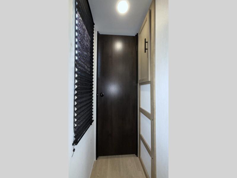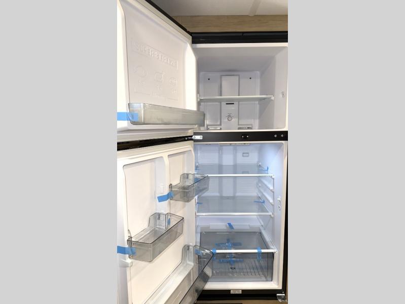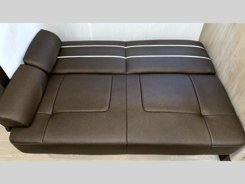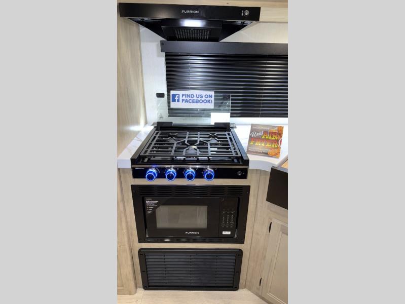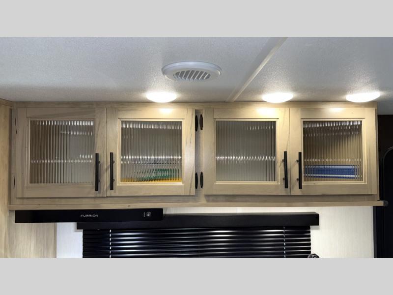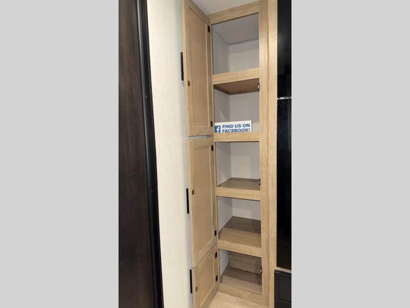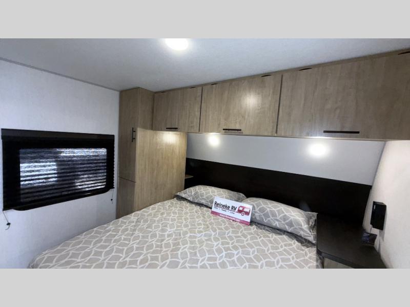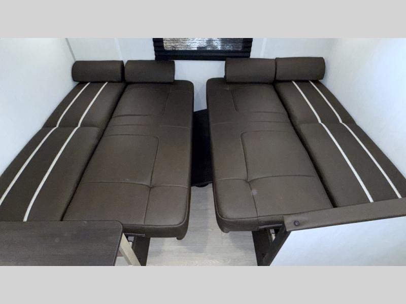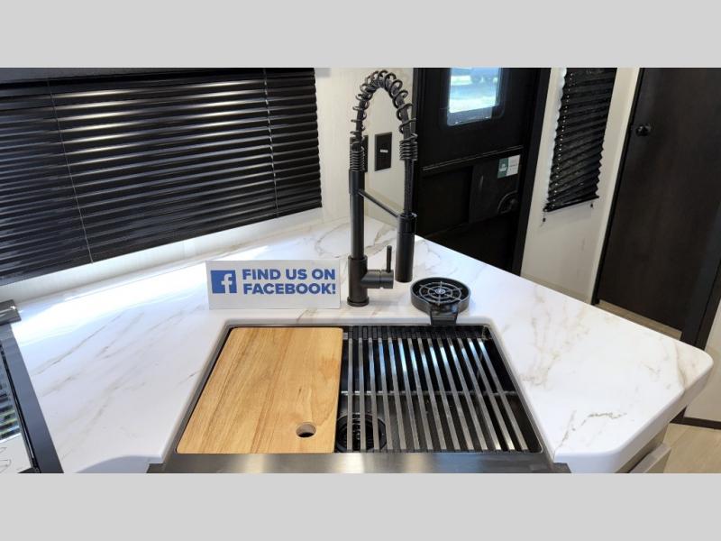 You will love how easy it is to enter/exit this travel trailer with dual entry doors! The rear door leads into the living/kitchen area where you will notice the large U-shaped dinette and the sofa which sit on the slide and create a spacious footprint for moving about, as well as great places to play games and socialize with your friends and family. Plus, there is an entertainment center with a fireplace and a fully equipped kitchen to keep everyone's bellies filled with delicious home cooked meals. At night, there is sleeping space for everyone between the bunks above the sofas with a table in the rear private bunkhouse and the RV king bed in the front private bedroom, plus the furniture can convert into sleeping spaces. The walk-through bathroom leads directly into the bedroom too!