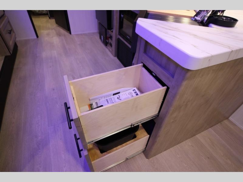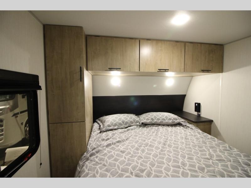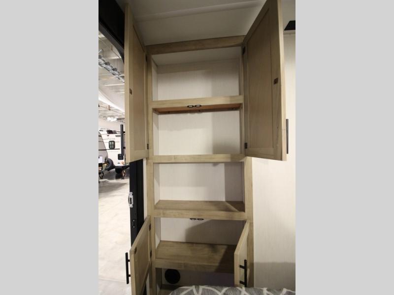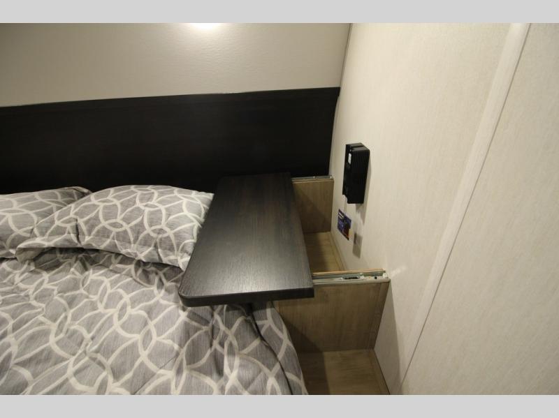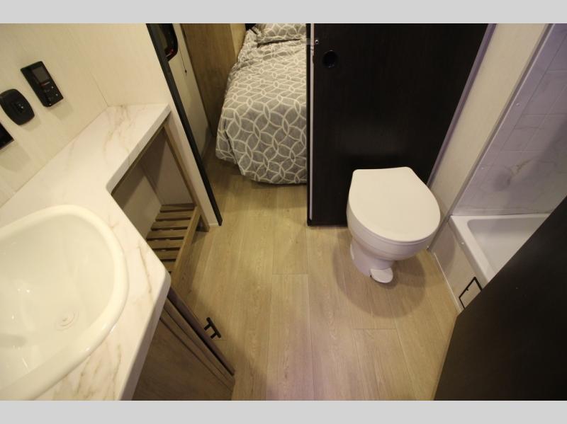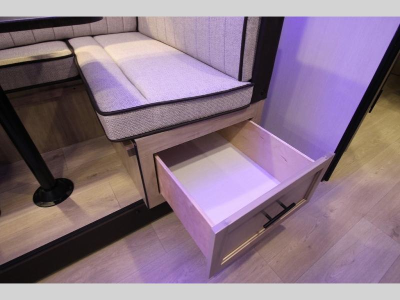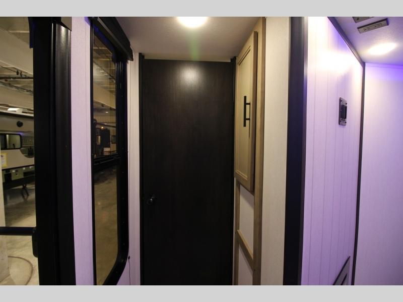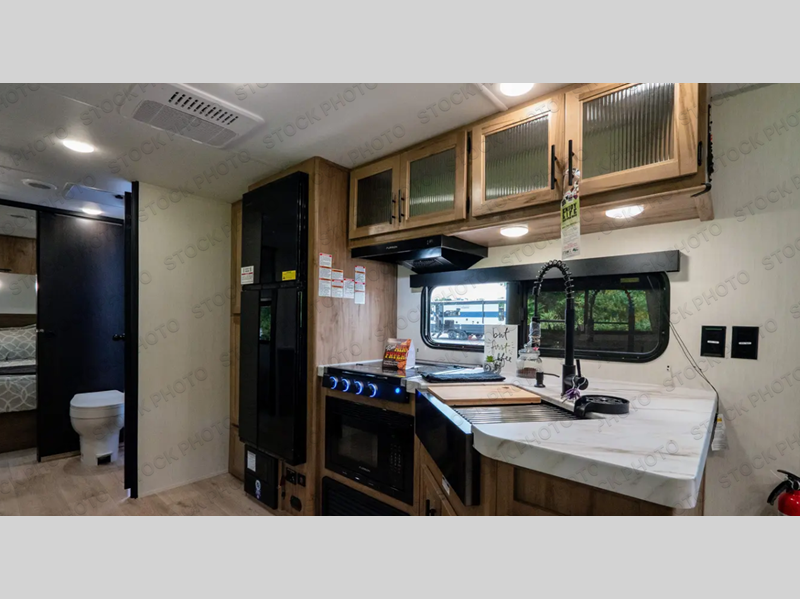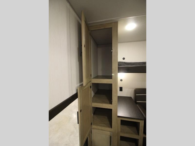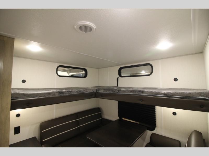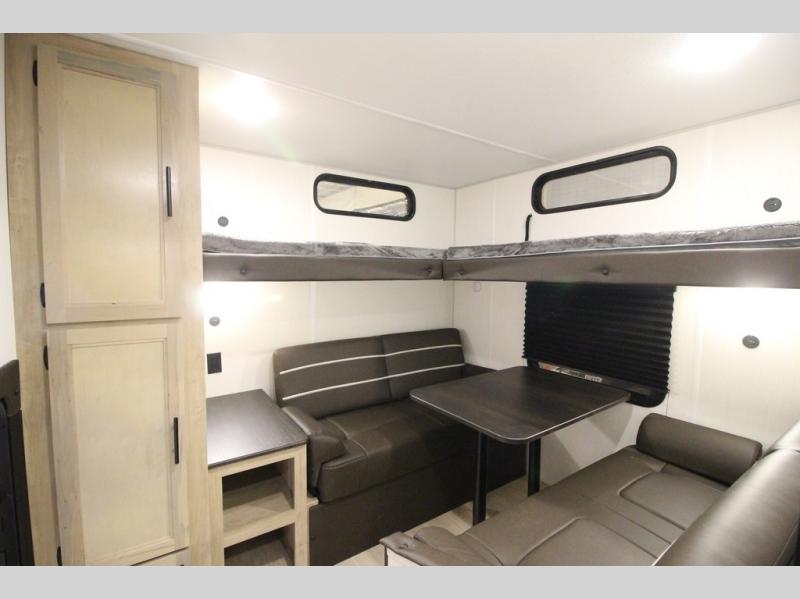 You will love how easy it is to enter/exit this travel trailer with dual entry doors! The rear door leads into the living/kitchen area where you will notice the large U-shaped dinette and the sofa which sit on the slide and create a spacious footprint for moving about, as well as great places to play games and socialize with your friends and family. Plus, there is an entertainment center with a fireplace and a fully equipped kitchen to keep everyone's bellies filled with delicious home cooked meals. At night, there is sleeping space for everyone between the bunks above the sofas with a table in the rear private bunkhouse and the RV king bed in the front private bedroom, plus the furniture can convert into sleeping spaces. The walk-through bathroom leads directly into the bedroom too!