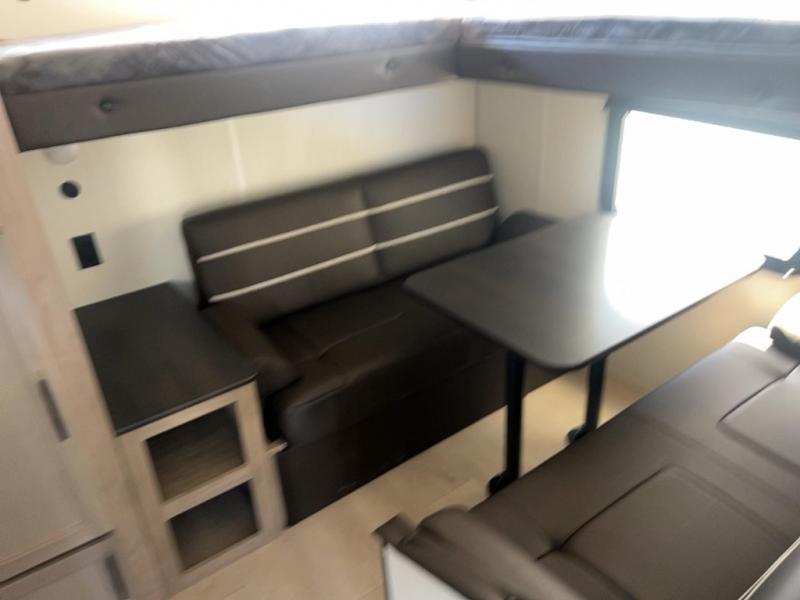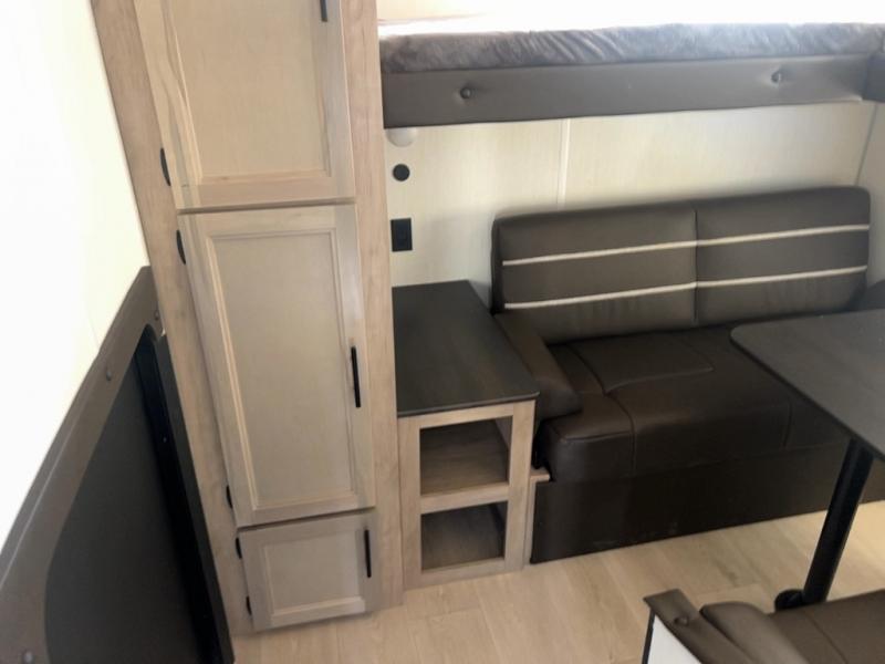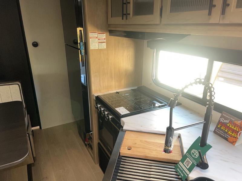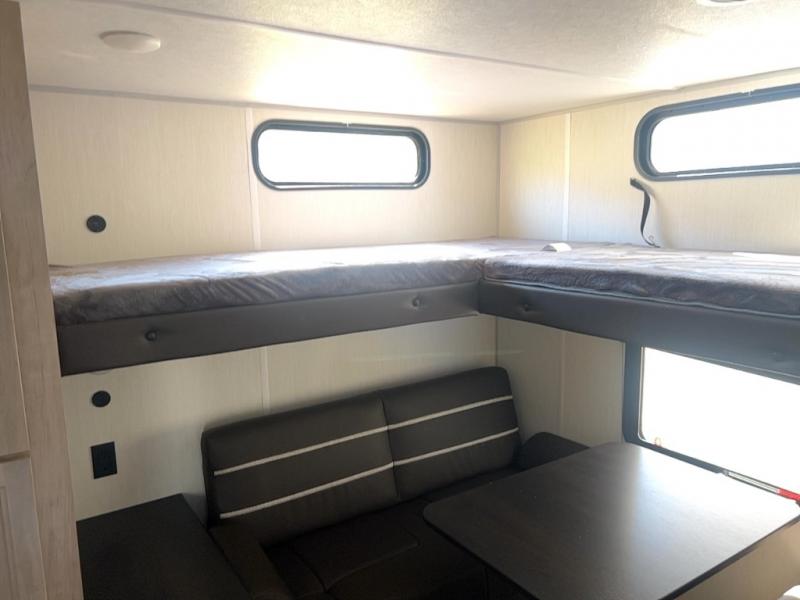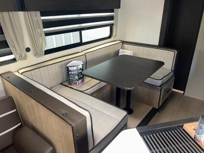 You will love how easy it is to enter/exit this travel trailer with dual entry doors! The rear door leads into the living/kitchen area where you will notice the large U-shaped dinette and the sofa which sit on the slide and create a spacious footprint for moving about, as well as great places to play games and socialize with your friends and family. Plus, there is an entertainment center with a fireplace and a fully equipped kitchen to keep everyone's bellies filled with delicious home cooked meals. At night, there is sleeping space for everyone between the bunks above the sofas with a table in the rear private bunkhouse and the RV king bed in the front private bedroom, plus the furniture can convert into sleeping spaces. The walk-through bathroom leads directly into the bedroom too!