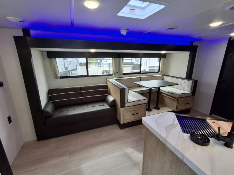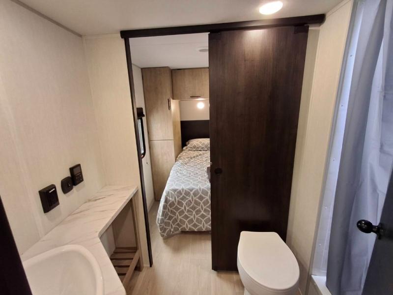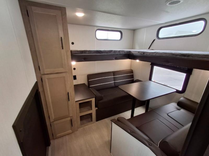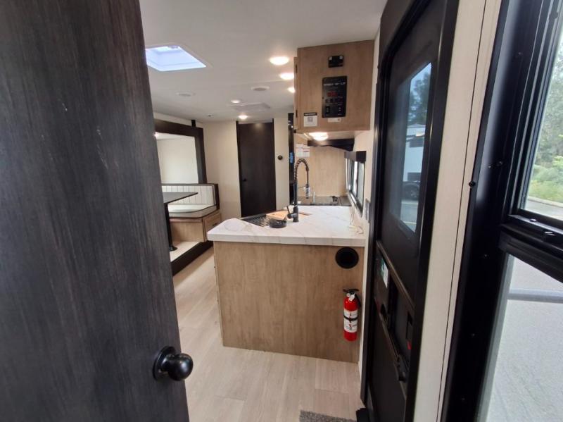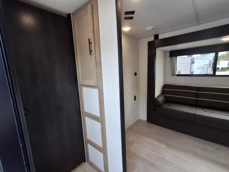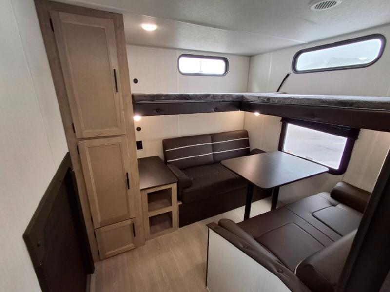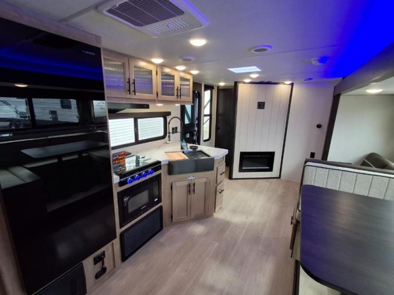 You will love how easy it is to enter/exit this travel trailer with dual entry doors! The rear door leads into the living/kitchen area where you will notice the large U-shaped dinette and the sofa which sit on the slide and create a spacious footprint for moving about, as well as great places to play games and socialize with your friends and family. Plus, there is an entertainment center with a fireplace and a fully equipped kitchen to keep everyone's bellies filled with delicious home cooked meals. At night, there is sleeping space for everyone between the bunks above the sofas with a table in the rear private bunkhouse and the RV king bed in the front private bedroom, plus the furniture can convert into sleeping spaces. The walk-through bathroom leads directly into the bedroom too!