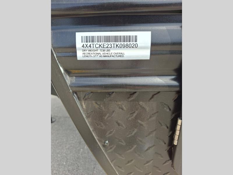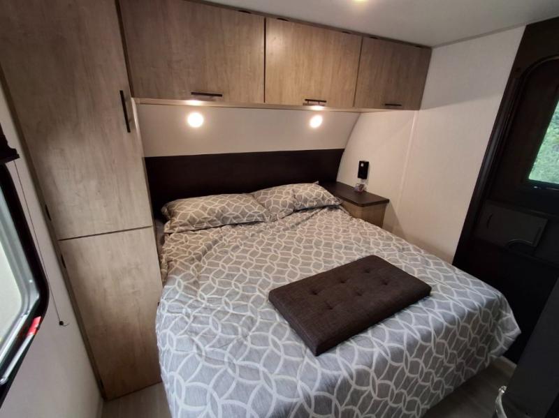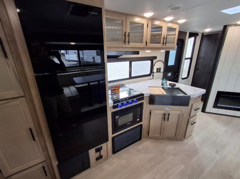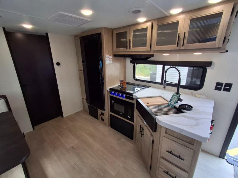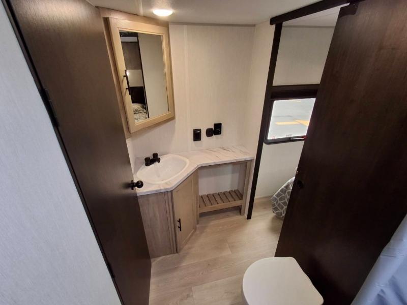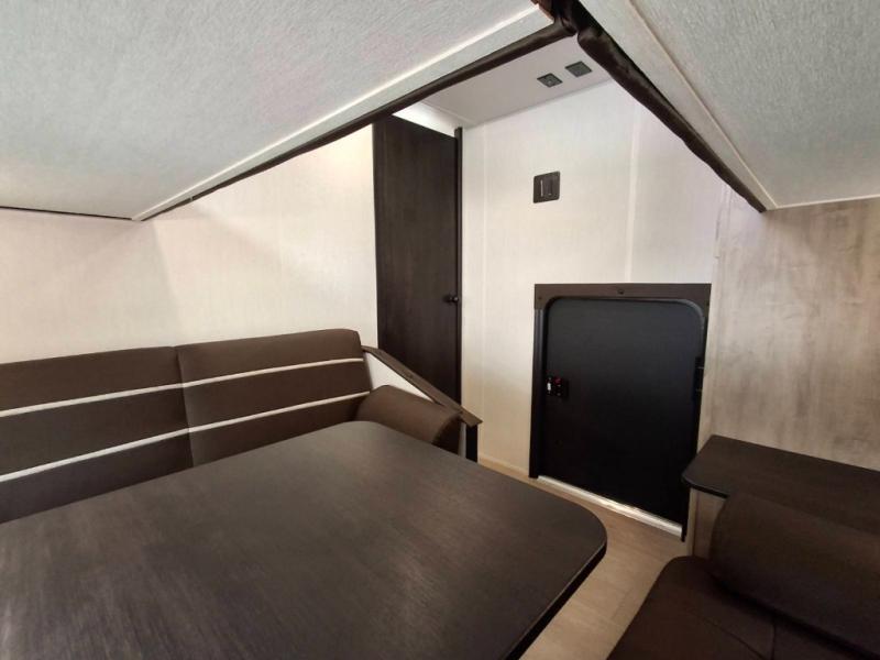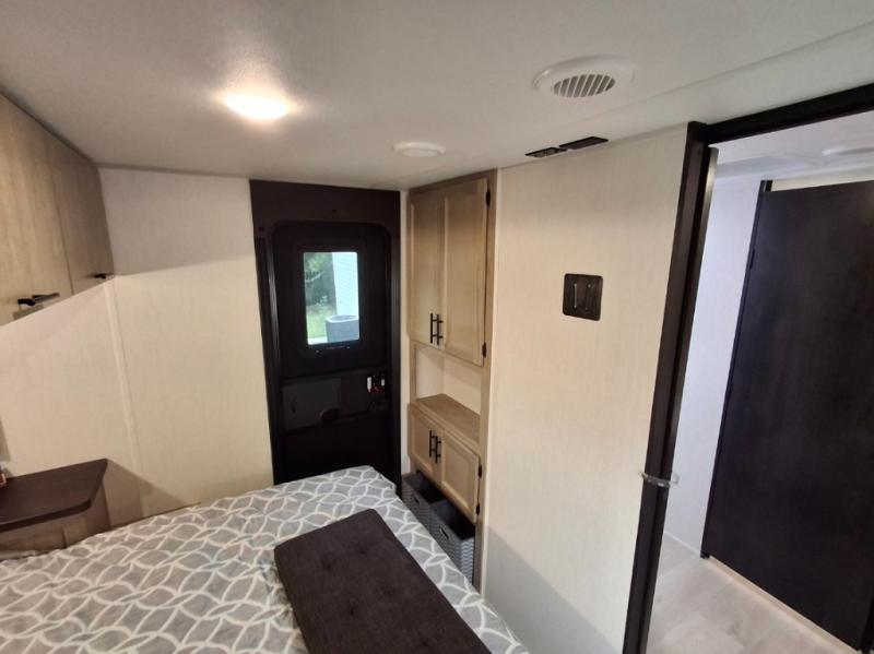 You will love how easy it is to enter/exit this travel trailer with dual entry doors! The rear door leads into the living/kitchen area where you will notice the large U-shaped dinette and the sofa which sit on the slide and create a spacious footprint for moving about, as well as great places to play games and socialize with your friends and family. Plus, there is an entertainment center with a fireplace and a fully equipped kitchen to keep everyone's bellies filled with delicious home cooked meals. At night, there is sleeping space for everyone between the bunks above the sofas with a table in the rear private bunkhouse and the RV king bed in the front private bedroom, plus the furniture can convert into sleeping spaces. The walk-through bathroom leads directly into the bedroom too!