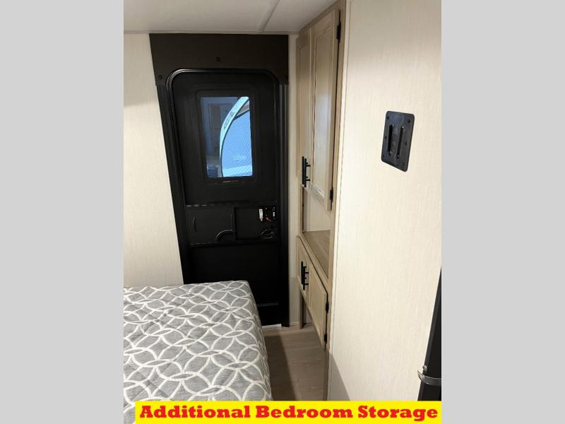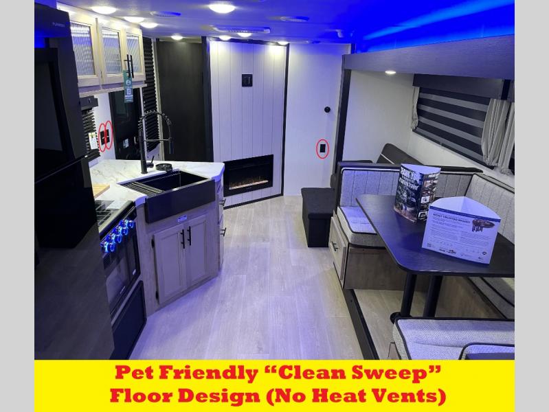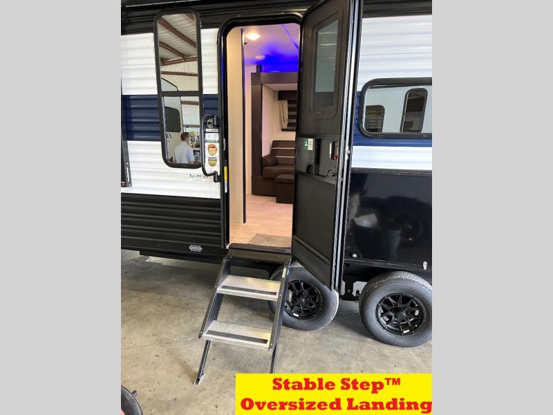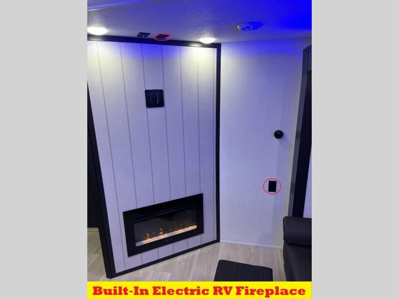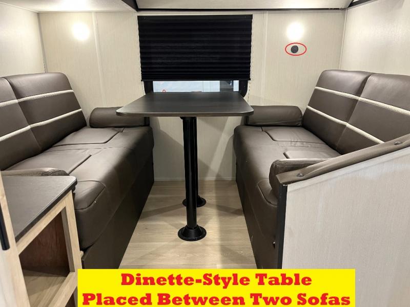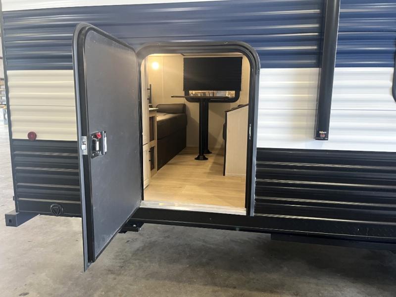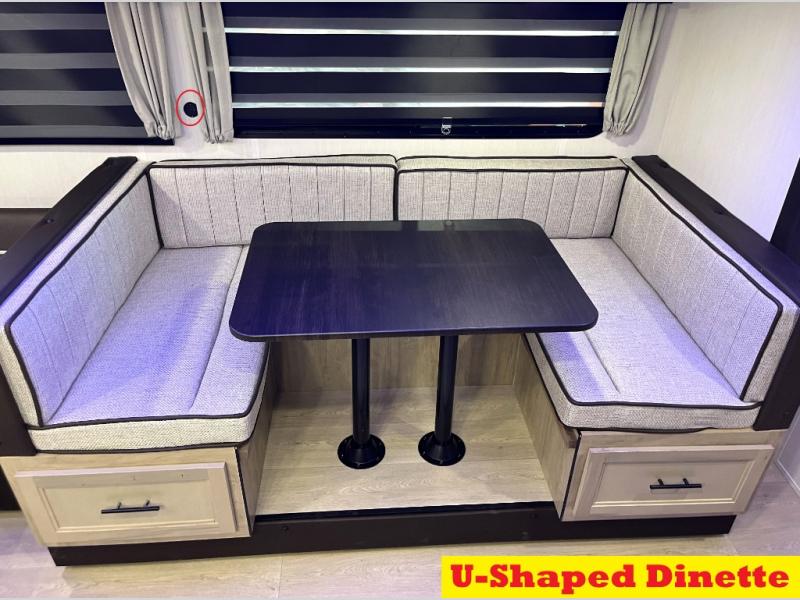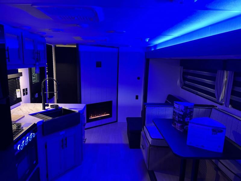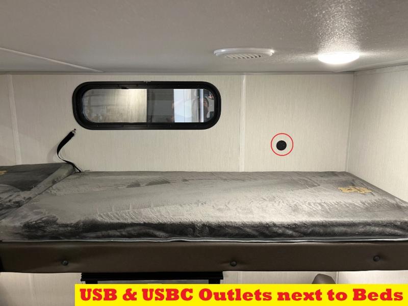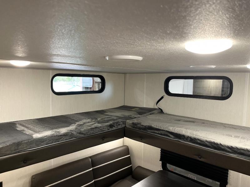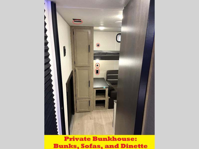 You will love how easy it is to enter/exit this travel trailer with dual entry doors! The rear door leads into the living/kitchen area where you will notice the large U-shaped dinette and the sofa which sit on the slide and create a spacious footprint for moving about, as well as great places to play games and socialize with your friends and family. Plus, there is an entertainment center with a fireplace and a fully equipped kitchen to keep everyone's bellies filled with delicious home cooked meals. At night, there is sleeping space for everyone between the bunks above the sofas with a table in the rear private bunkhouse and the RV king bed in the front private bedroom, plus the furniture can convert into sleeping spaces. The walk-through bathroom leads directly into the bedroom too!