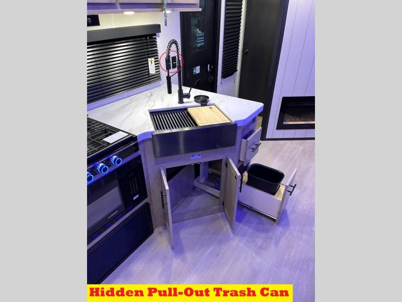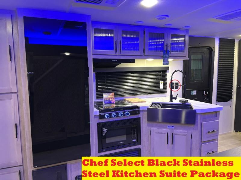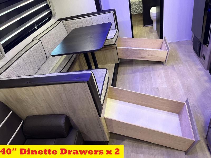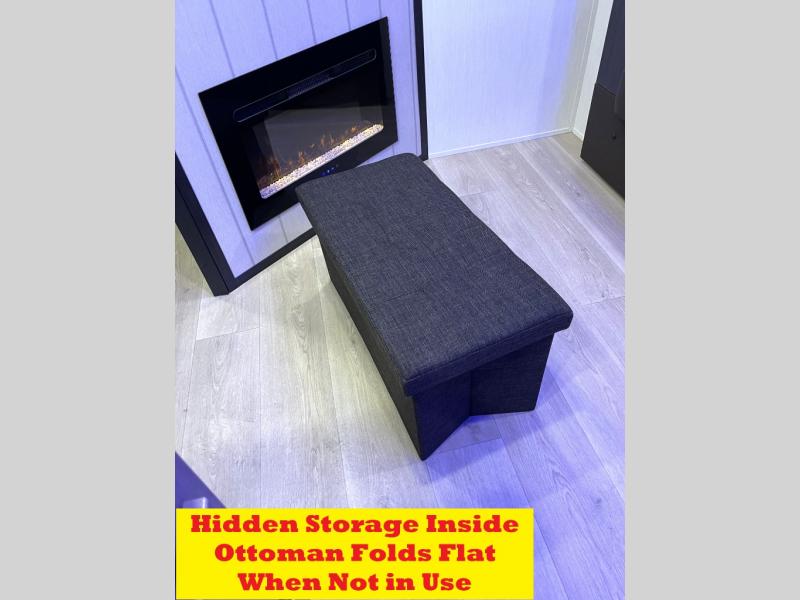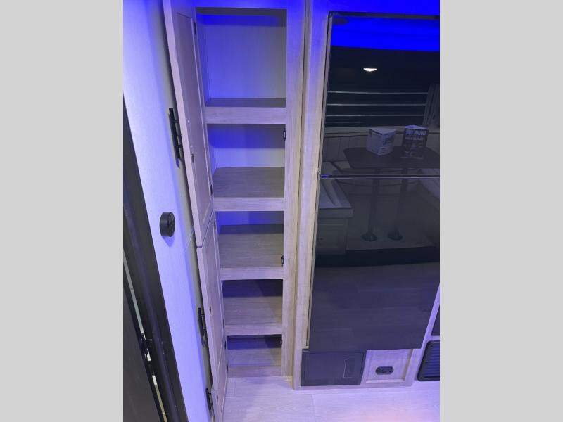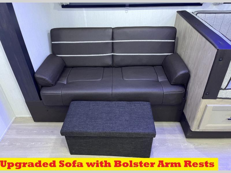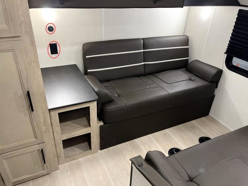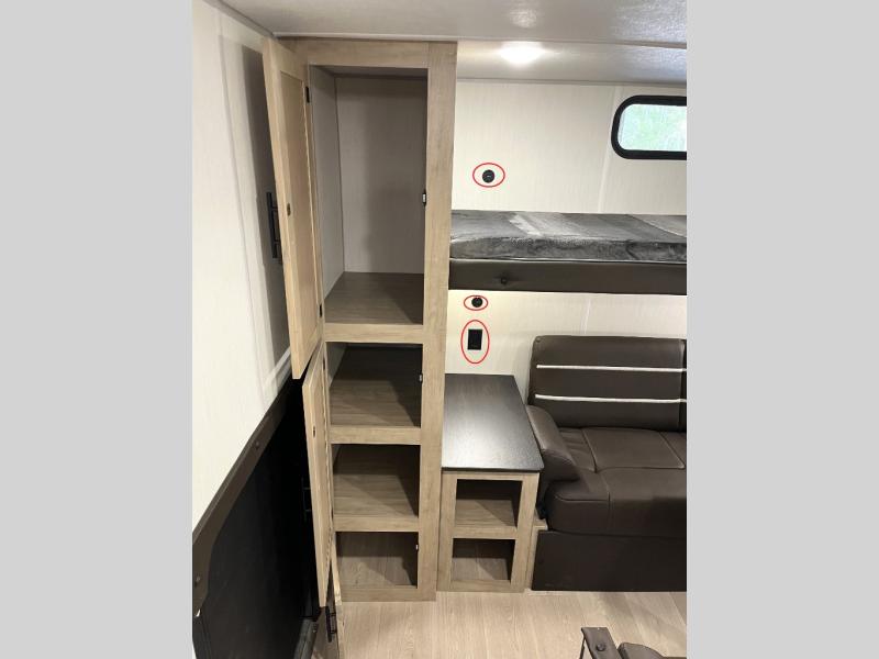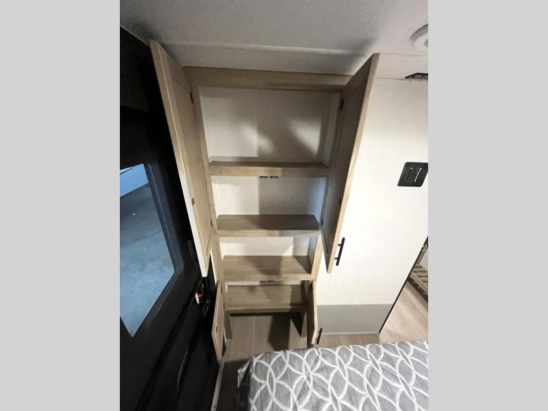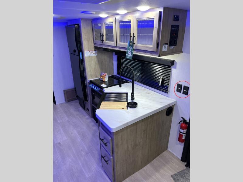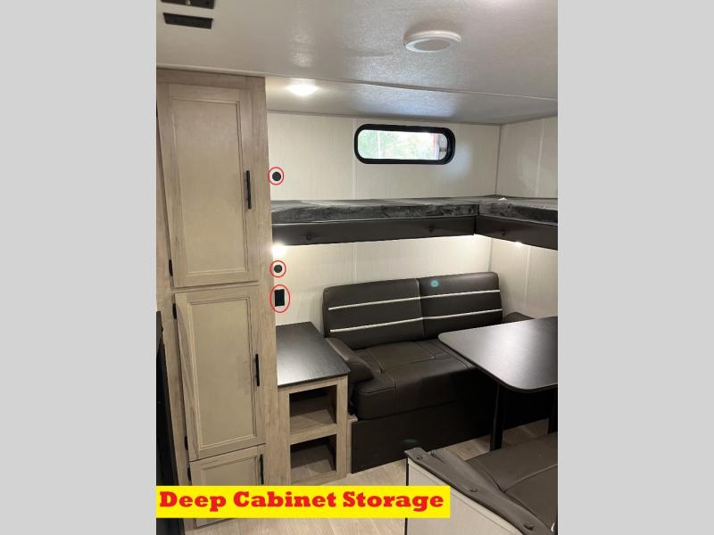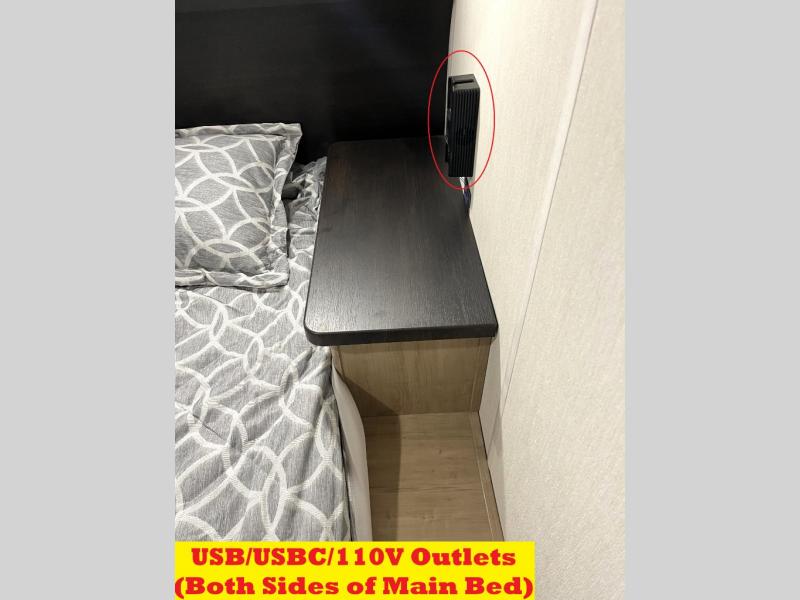 You will love how easy it is to enter/exit this travel trailer with dual entry doors! The rear door leads into the living/kitchen area where you will notice the large U-shaped dinette and the sofa which sit on the slide and create a spacious footprint for moving about, as well as great places to play games and socialize with your friends and family. Plus, there is an entertainment center with a fireplace and a fully equipped kitchen to keep everyone's bellies filled with delicious home cooked meals. At night, there is sleeping space for everyone between the bunks above the sofas with a table in the rear private bunkhouse and the RV king bed in the front private bedroom, plus the furniture can convert into sleeping spaces. The walk-through bathroom leads directly into the bedroom too!