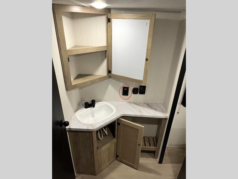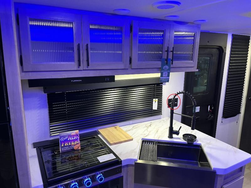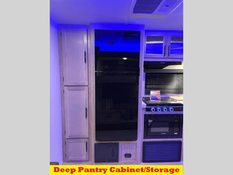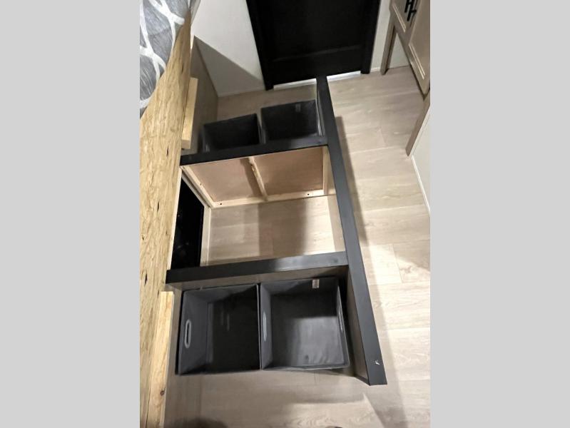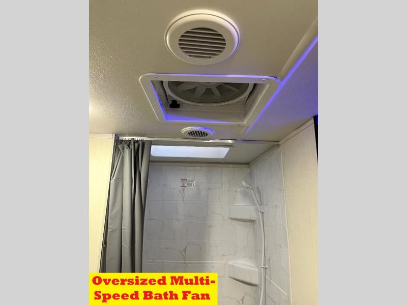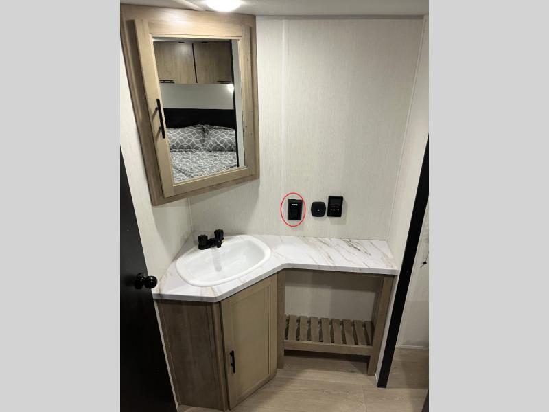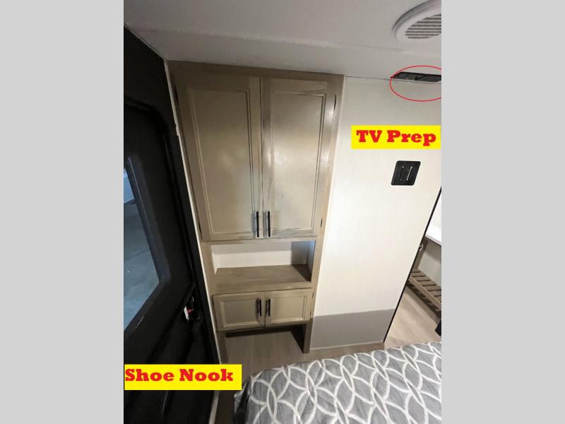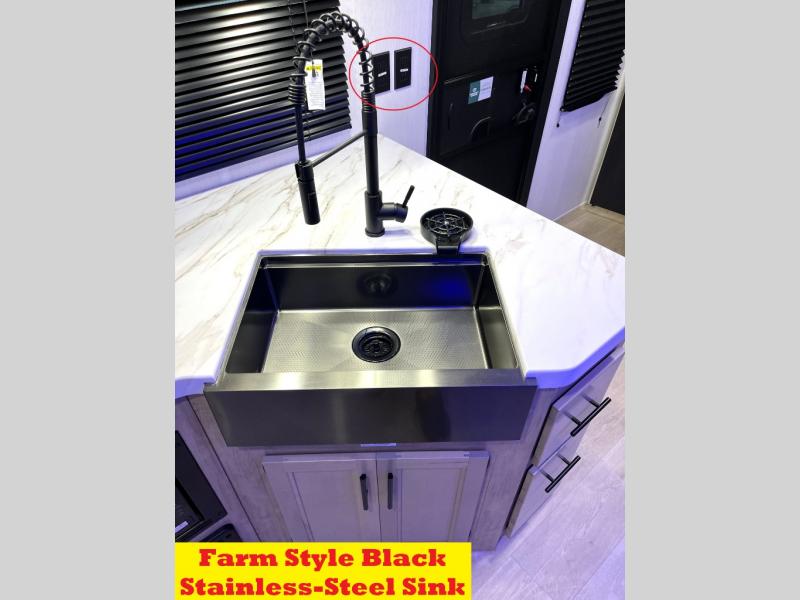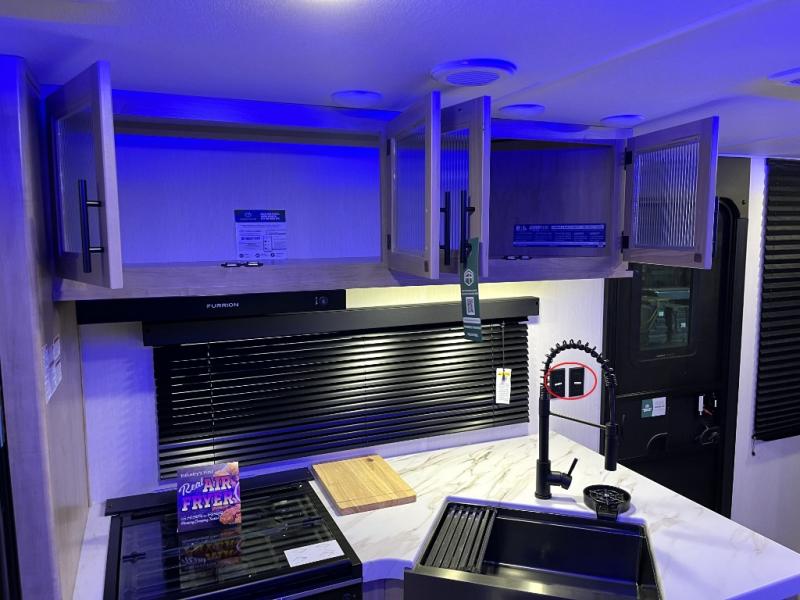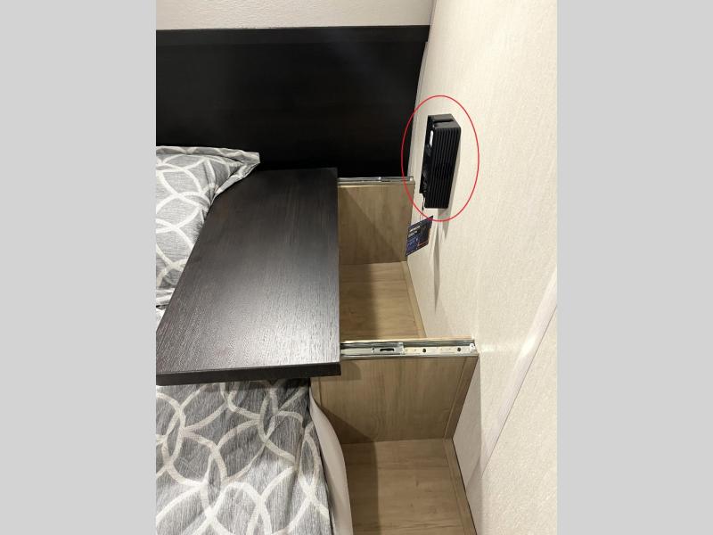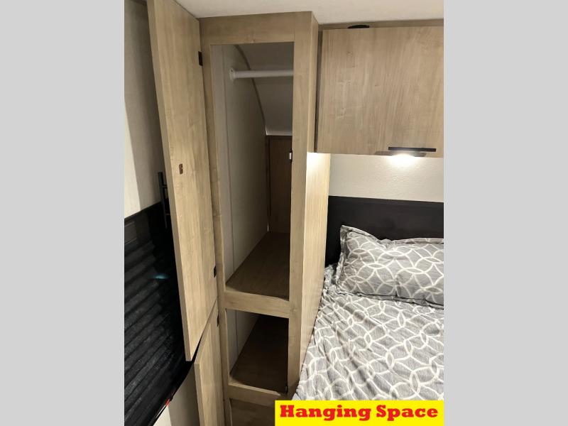 You will love how easy it is to enter/exit this travel trailer with dual entry doors! The rear door leads into the living/kitchen area where you will notice the large U-shaped dinette and the sofa which sit on the slide and create a spacious footprint for moving about, as well as great places to play games and socialize with your friends and family. Plus, there is an entertainment center with a fireplace and a fully equipped kitchen to keep everyone's bellies filled with delicious home cooked meals. At night, there is sleeping space for everyone between the bunks above the sofas with a table in the rear private bunkhouse and the RV king bed in the front private bedroom, plus the furniture can convert into sleeping spaces. The walk-through bathroom leads directly into the bedroom too!