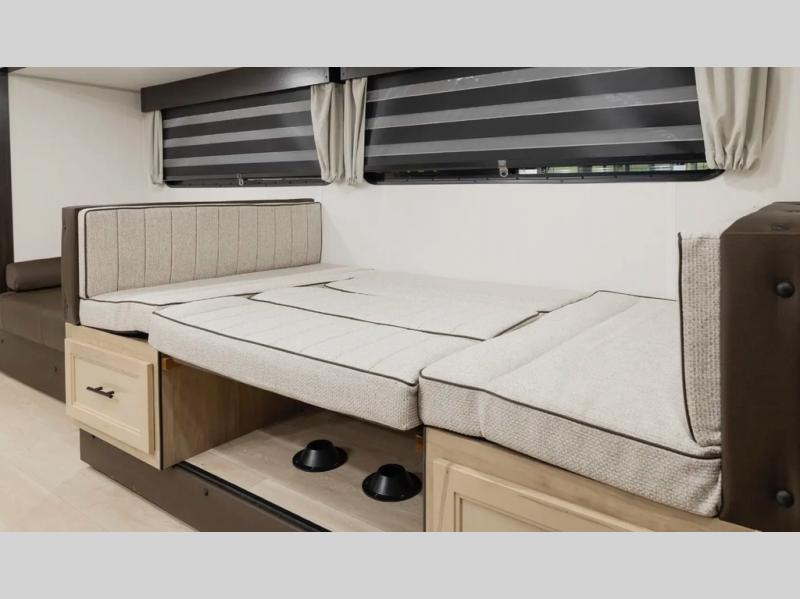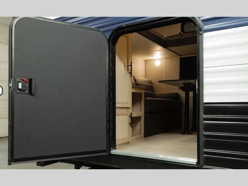 You will love how easy it is to enter/exit this travel trailer with dual entry doors! The rear door leads into the living/kitchen area where you will notice the large U-shaped dinette and the sofa which sit on the slide and create a spacious footprint for moving about, as well as great places to play games and socialize with your friends and family. Plus, there is an entertainment center with a fireplace and a fully equipped kitchen to keep everyone's bellies filled with delicious home cooked meals. At night, there is sleeping space for everyone between the bunks above the sofas with a table in the rear private bunkhouse and the RV king bed in the front private bedroom, plus the furniture can convert into sleeping spaces. The walk-through bathroom leads directly into the bedroom too!