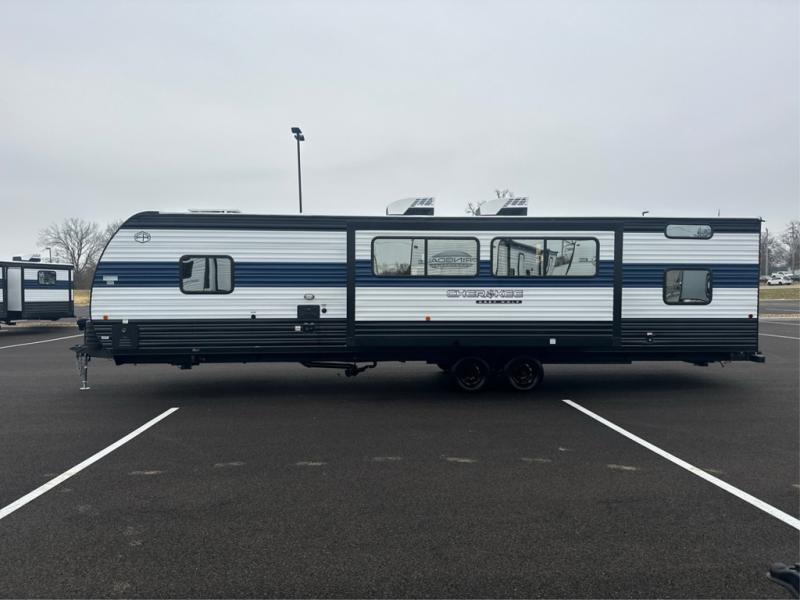 You will love how easy it is to enter/exit this travel trailer with dual entry doors! The rear door leads into the living/kitchen area where you will notice the large U-shaped dinette and the sofa which sit on the slide and create a spacious footprint for moving about, as well as great places to play games and socialize with your friends and family. Plus, there is an entertainment center with a fireplace and a fully equipped kitchen to keep everyone's bellies filled with delicious home cooked meals. At night, there is sleeping space for everyone between the bunks above the sofas with a table in the rear private bunkhouse and the RV king bed in the front private bedroom, plus the furniture can convert into sleeping spaces. The walk-through bathroom leads directly into the bedroom too!