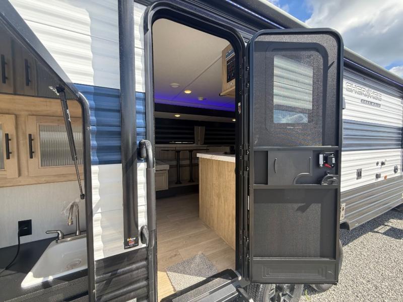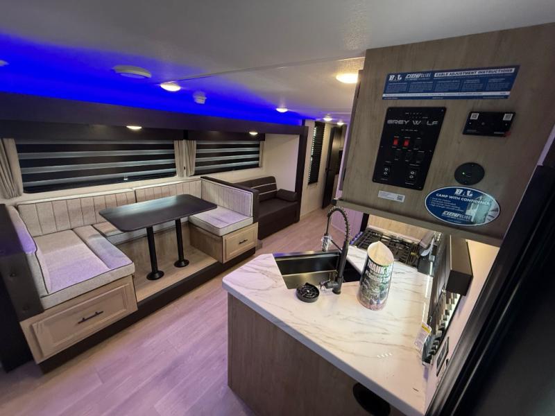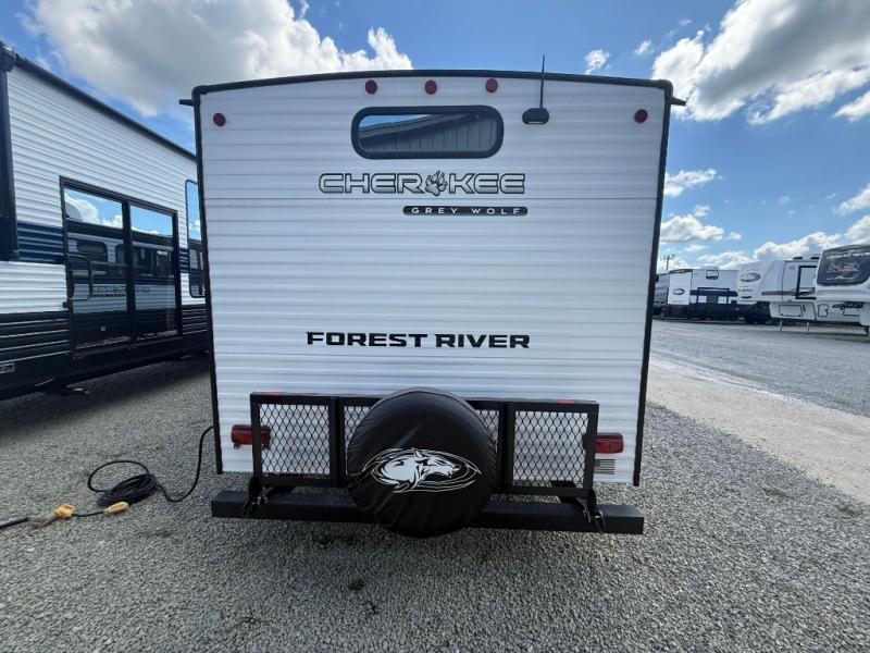 Whether it's a journey that will take you to new locations or a tried-and-true getaway to that favorite and memorable destination, the Forest River Cherokee Grey Wolf travel trailers and toy haulers are going to make the trip worth it every single time! You can travel in confidence with the premium wheel package, seamless roofing membrane with heat reflectivity, Power Gear frame technology with space-saver rail design, and Cherokee back-up camera system. The Cherokee Grey Wolf's interior is highly attractive with its stainless steel kitchen suite package and premium bedding ensemble and comforter. You will also find a black waste tank flush-out kit, an outside shower with hot and cold water, an armored underbelly tank enclosure, and an RV grill quick connect.