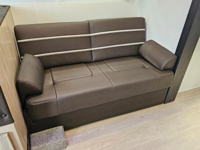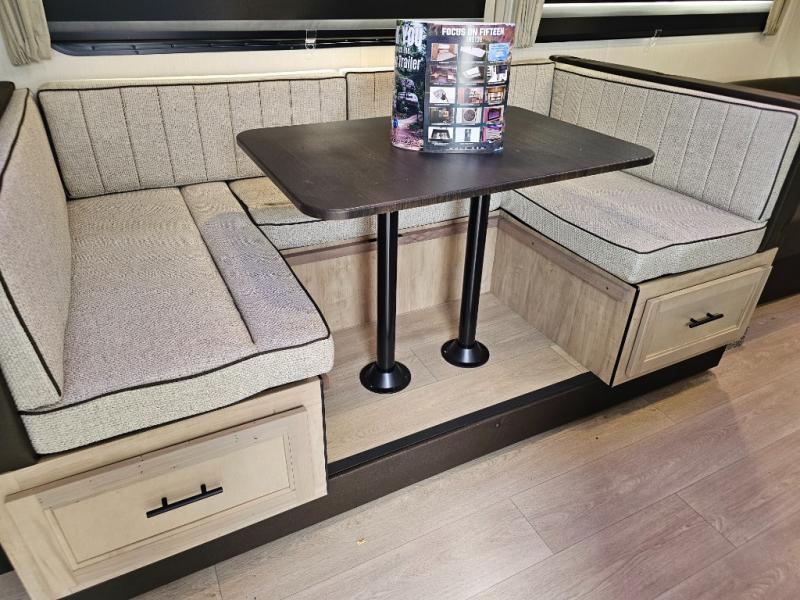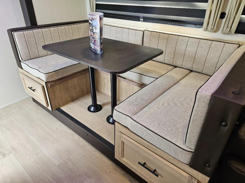 U-shaped dinette and sofa offer additional sleeping options for guests