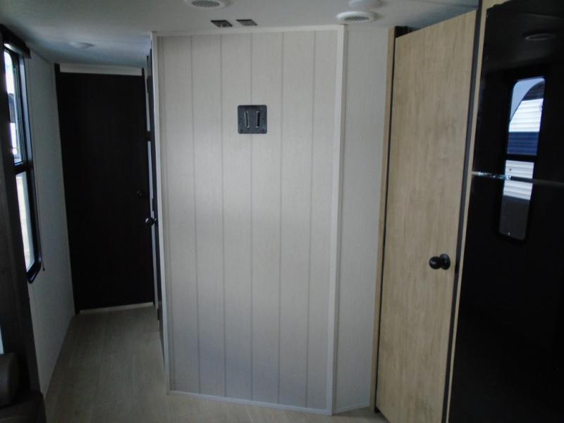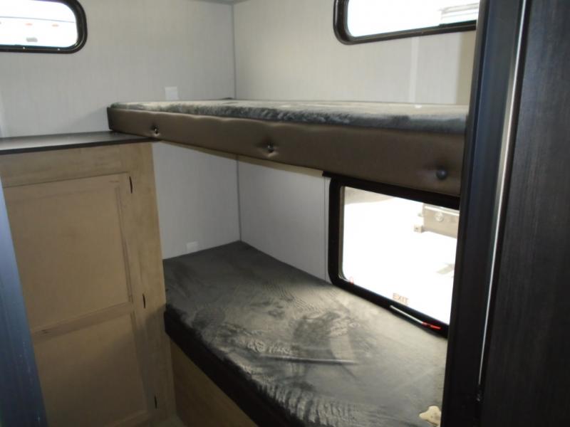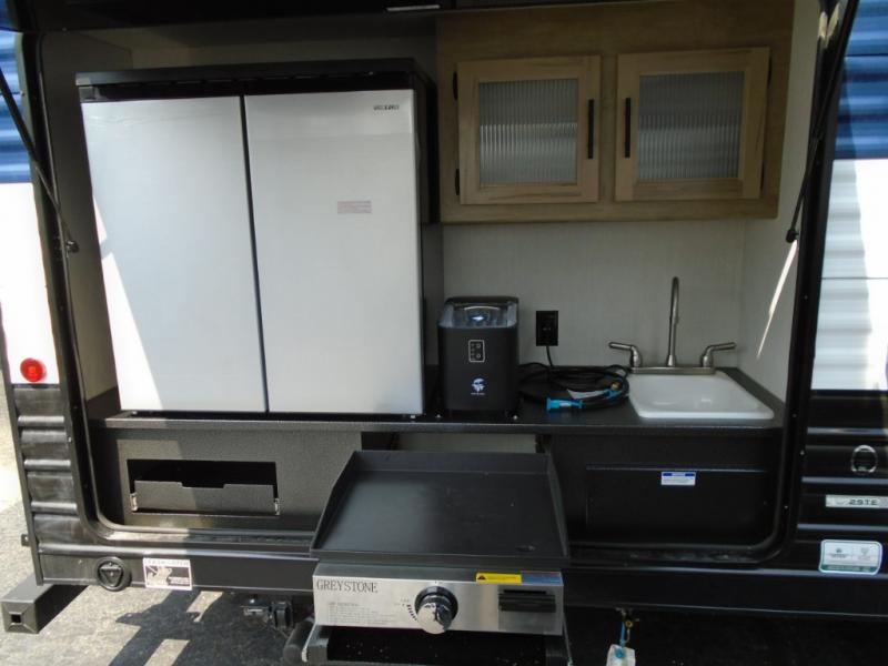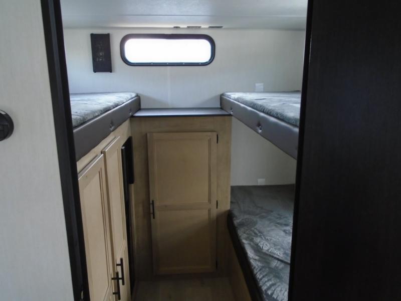 Your larger family will love spending weekends away with this Cherokee Grey Wolf travel trailer as their home away from home. This model offers lots of sleeping space with three bunk beds in the rear private bunkhouse. In the front, there is a master suite with wardrobes and nightstands on either side of the RV king bed, and it even has private access to the dual-entry bath. The two entry doors will make accessing the trailer easy for everyone, and you will appreciate the abundant storage throughout this unit including large overhead cabinets, a spacious pantry, and numerous outside storage compartments for all of your outdoor gear. There's even an outside bar & grill!
