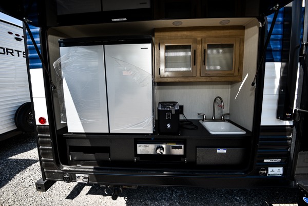 Your larger family will love spending weekends away with this Cherokee Grey Wolf travel trailer as their home away from home. This model offers lots of sleeping space with three bunk beds in the rear private bunkhouse. In the front, there is a master suite with a wardrobe beside RV king bed, and it even has private access to the dual-entry bath. The two entry doors will make accessing the trailer easy for everyone, and you will appreciate the abundant storage throughout this unit including large overhead cabinets, a spacious pantry, and numerous outside storage compartments for all of your outdoor gear. There's even an outside bar & grill!