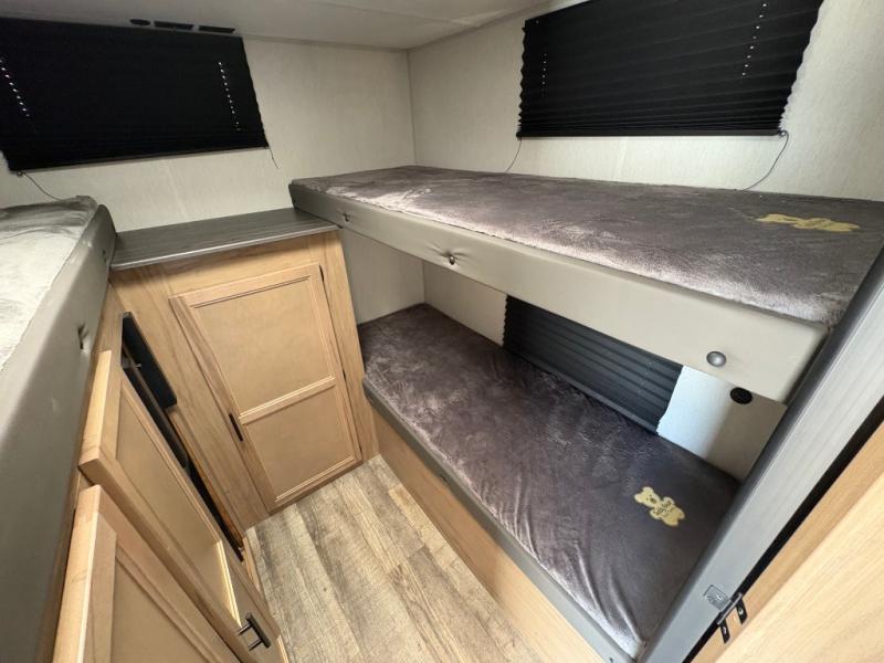 Your larger family will love spending weekends away with this Cherokee Grey Wolf travel trailer as their home away from home. This model offers lots of sleeping space with three bunk beds in the rear private bunkhouse. In the front, there is a master suite with wardrobes and nightstands on either side of the RV king bed, and it even has private access to the dual-entry bath. The two entry doors will make accessing the trailer easy for everyone, and you will appreciate the abundant storage throughout this unit including large overhead cabinets, a spacious pantry, and numerous outside storage compartments for all of your outdoor gear. There's even an outside bar & grill!