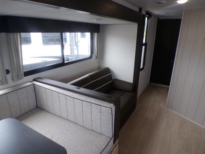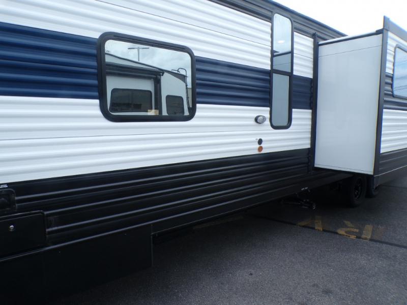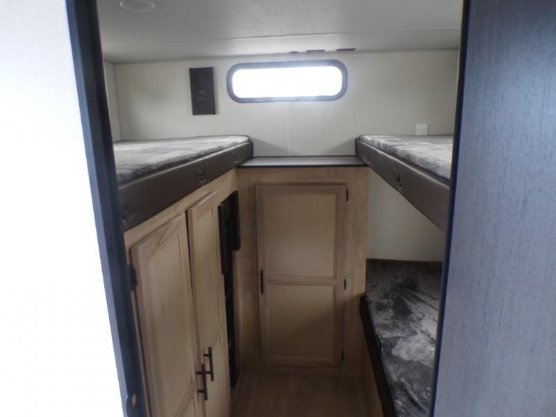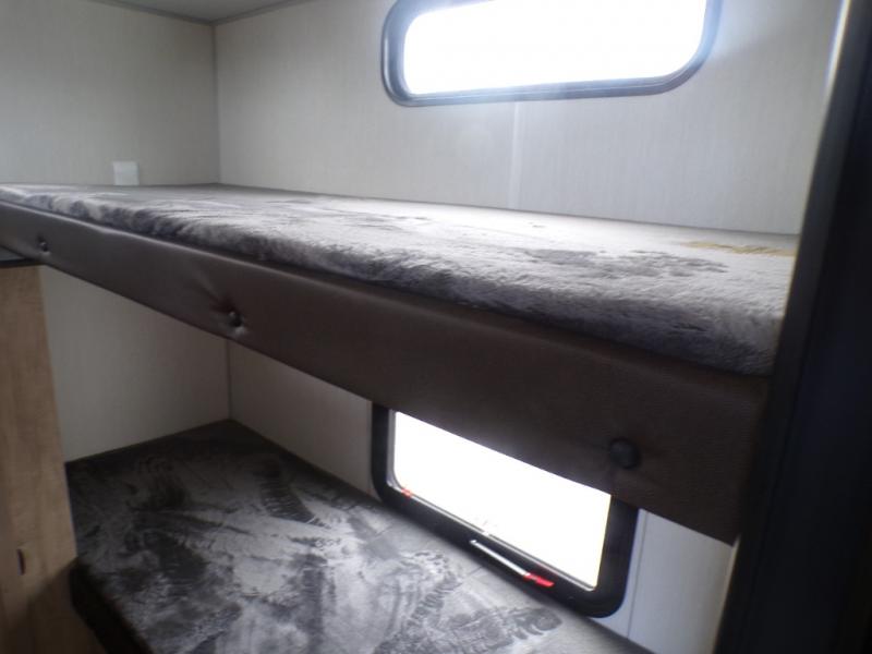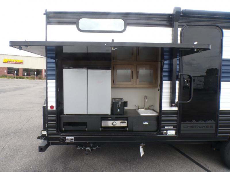 Your larger family will love spending weekends away with this Cherokee Grey Wolf travel trailer as their home away from home. This model offers lots of sleeping space with three bunk beds in the rear private bunkhouse. In the front, there is a master suite with wardrobes and nightstands on either side of the RV king bed, and it even has private access to the dual-entry bath. The two entry doors will make accessing the trailer easy for everyone, and you will appreciate the abundant storage throughout this unit including large overhead cabinets, a spacious pantry, and numerous outside storage compartments for all of your outdoor gear. There's even an outside bar & grill!