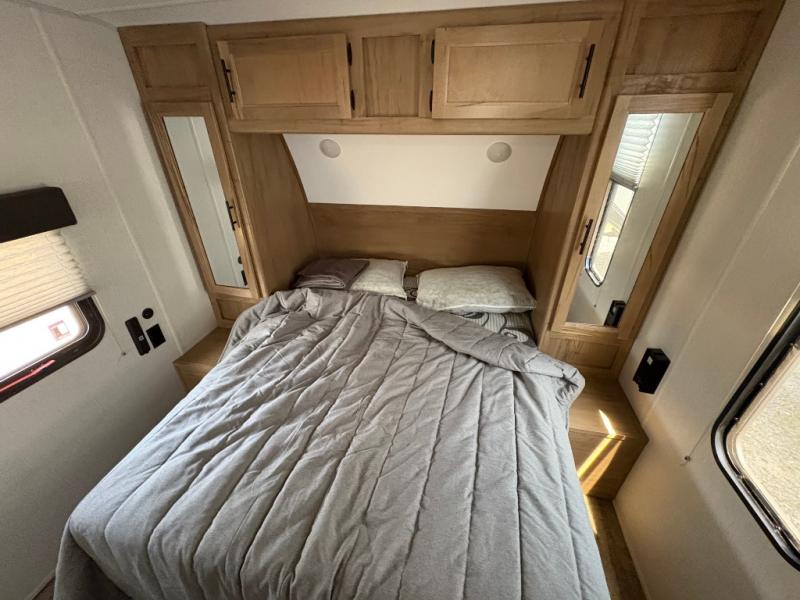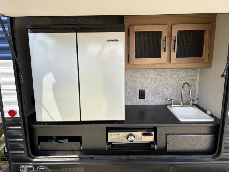 Your larger family will love spending weekends away with this Cherokee Grey Wolf travel trailer as their home away from home. This model offers lots of sleeping space with three bunk beds in the rear private bunkhouse. In the front, there is a master suite with a wardrobe beside RV king bed, and it even has private access to the dual-entry bath. The two entry doors will make accessing the trailer easy for everyone, and you will appreciate the abundant storage throughout this unit including large overhead cabinets, a spacious pantry, and numerous outside storage compartments for all of your outdoor gear. There's even an outside bar & grill!