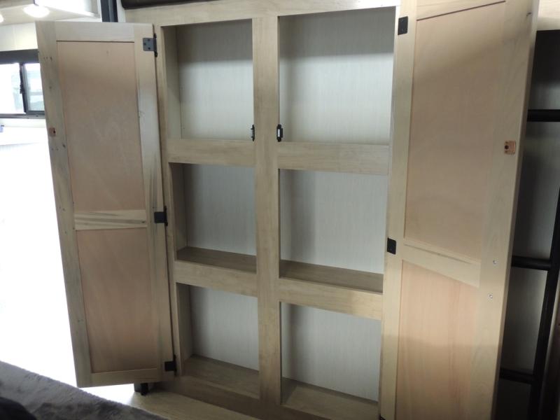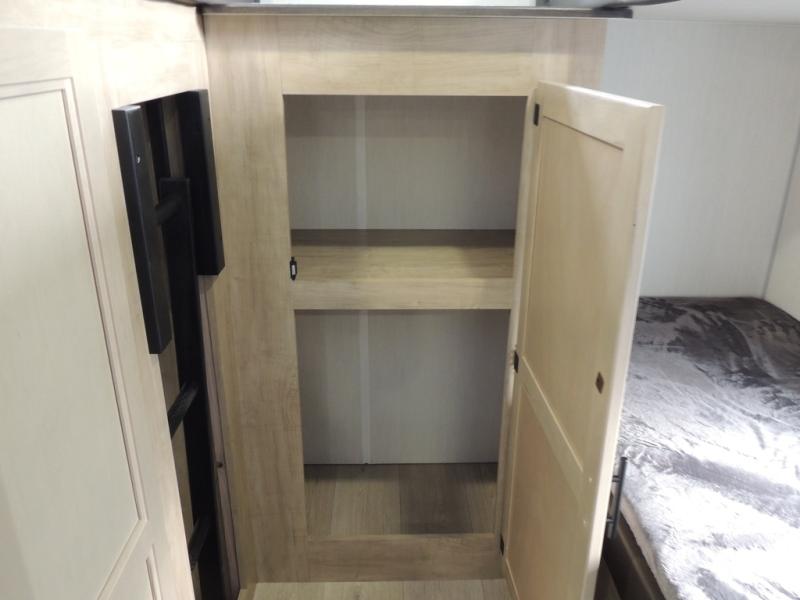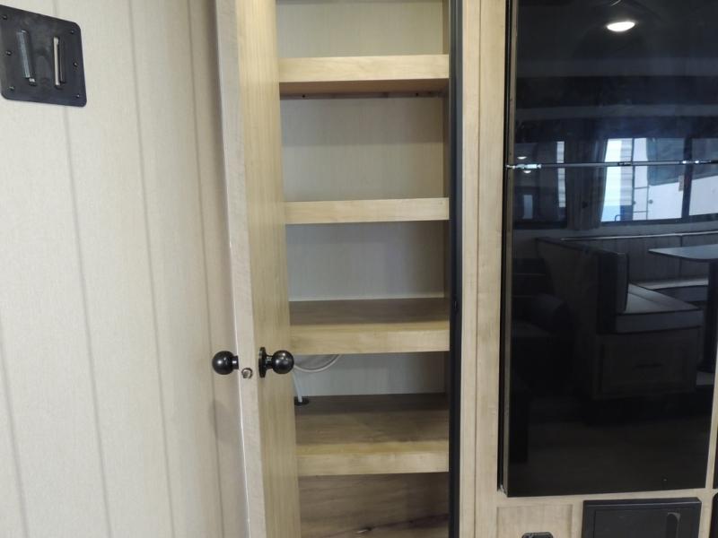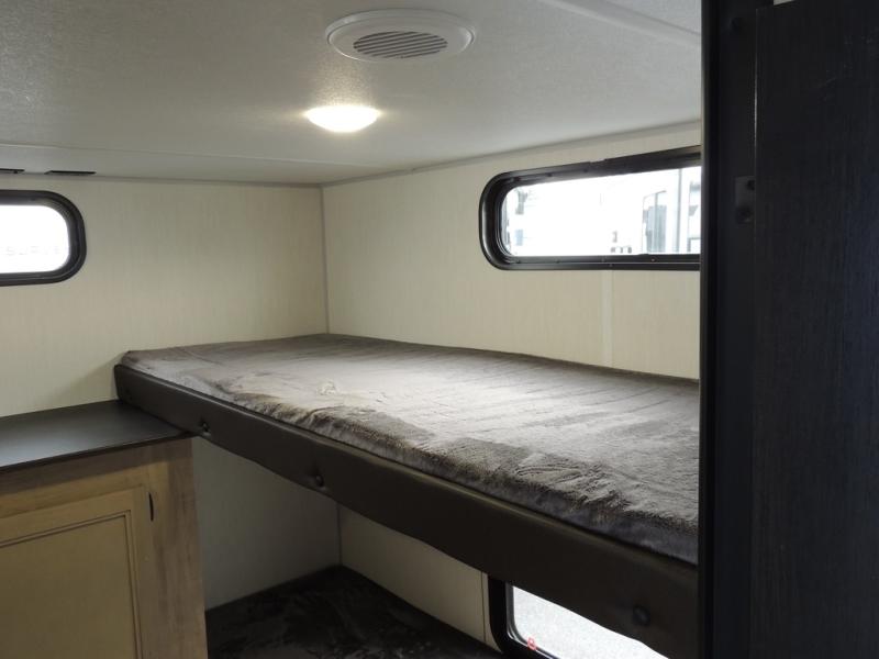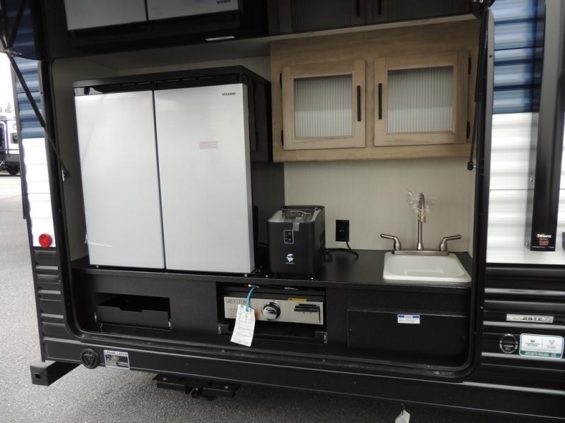 Your larger family will love spending weekends away with this Cherokee Grey Wolf travel trailer as their home away from home. This model offers lots of sleeping space with three bunk beds in the rear private bunkhouse. In the front, there is a master suite with a wardrobe beside RV king bed, and it even has private access to the dual-entry bath. The two entry doors will make accessing the trailer easy for everyone, and you will appreciate the abundant storage throughout this unit including large overhead cabinets, a spacious pantry, and numerous outside storage compartments for all of your outdoor gear. There's even an outside bar & grill!