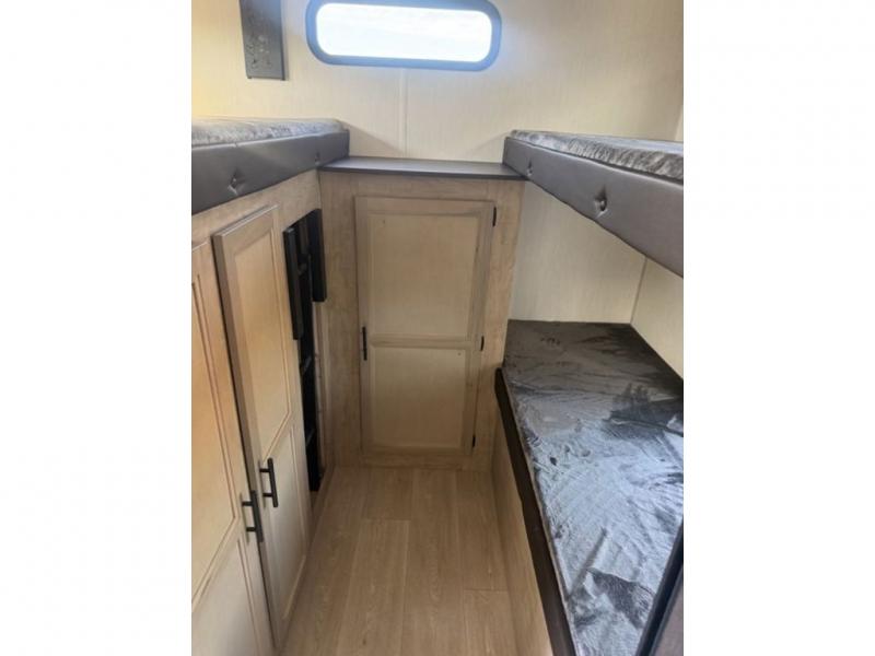 Your larger family will love spending weekends away with this Cherokee Grey Wolf travel trailer as their home away from home. This model offers lots of sleeping space with three bunk beds in the rear private bunkhouse. In the front, there is a master suite with a wardrobe beside RV king bed, and it even has private access to the dual-entry bath. The two entry doors will make accessing the trailer easy for everyone, and you will appreciate the abundant storage throughout this unit including large overhead cabinets, a spacious pantry, and numerous outside storage compartments for all of your outdoor gear. There's even an outside bar & grill!