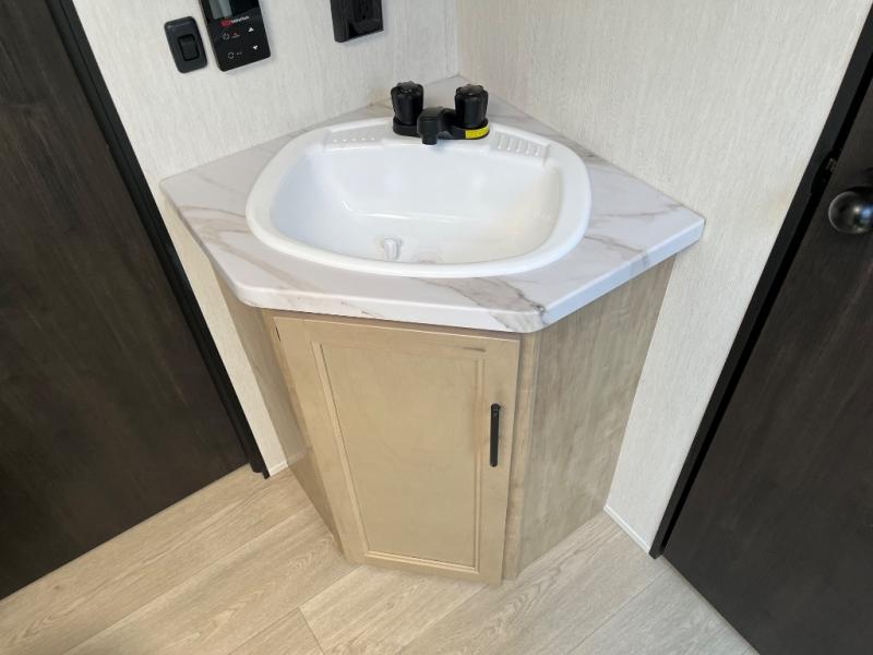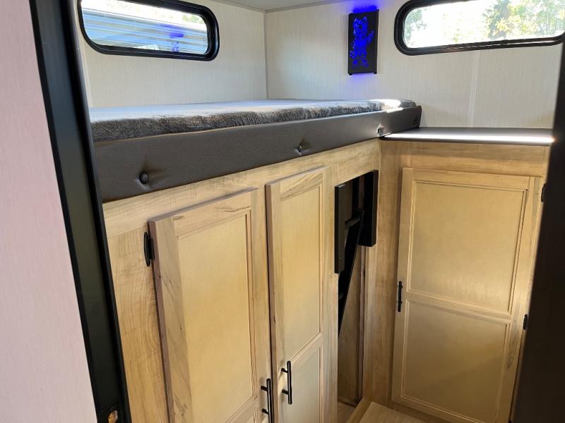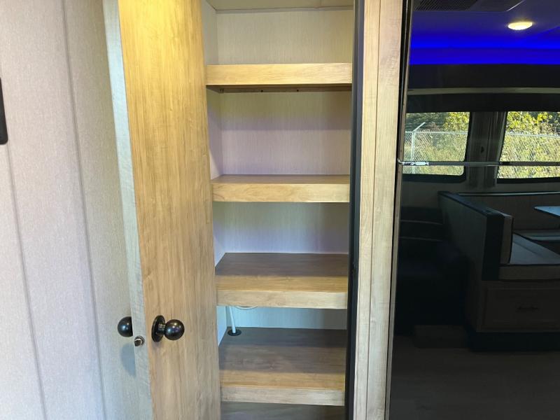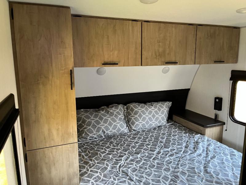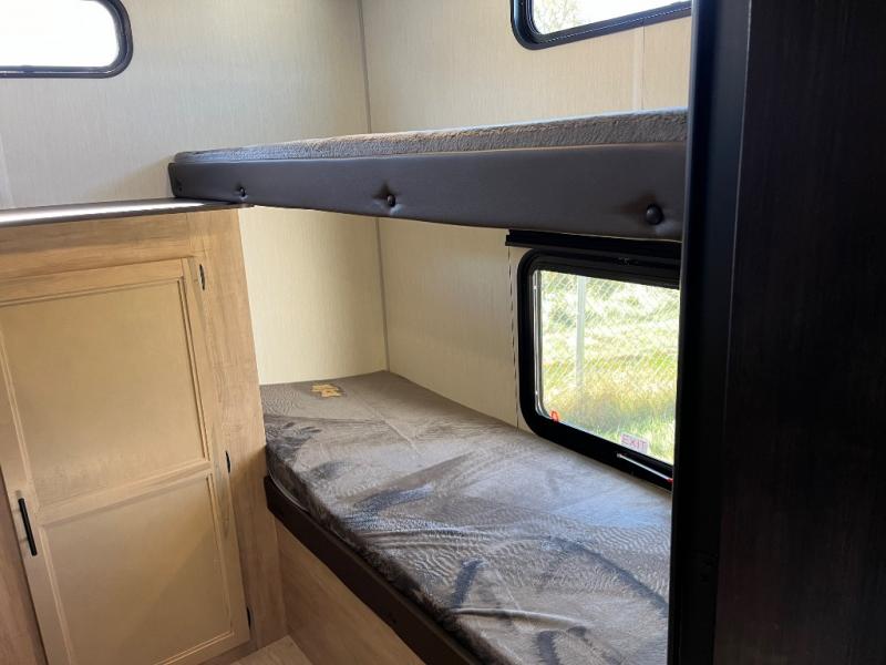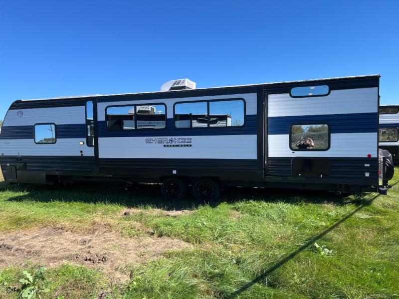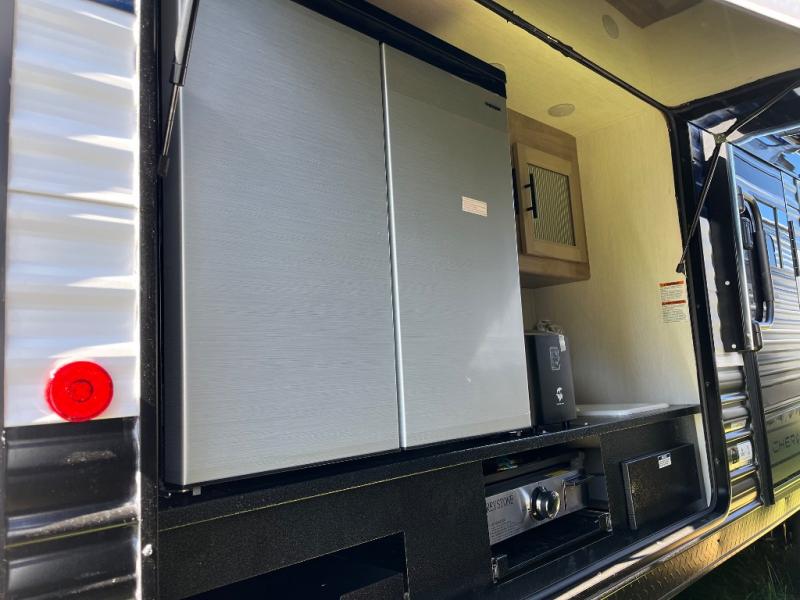 Your larger family will love spending weekends away with this Cherokee Grey Wolf travel trailer as their home away from home. This model offers lots of sleeping space with three bunk beds in the rear private bunkhouse. In the front, there is a master suite with a wardrobe beside RV king bed, and it even has private access to the dual-entry bath. The two entry doors will make accessing the trailer easy for everyone, and you will appreciate the abundant storage throughout this unit including large overhead cabinets, a spacious pantry, and numerous outside storage compartments for all of your outdoor gear. There's even an outside bar & grill!