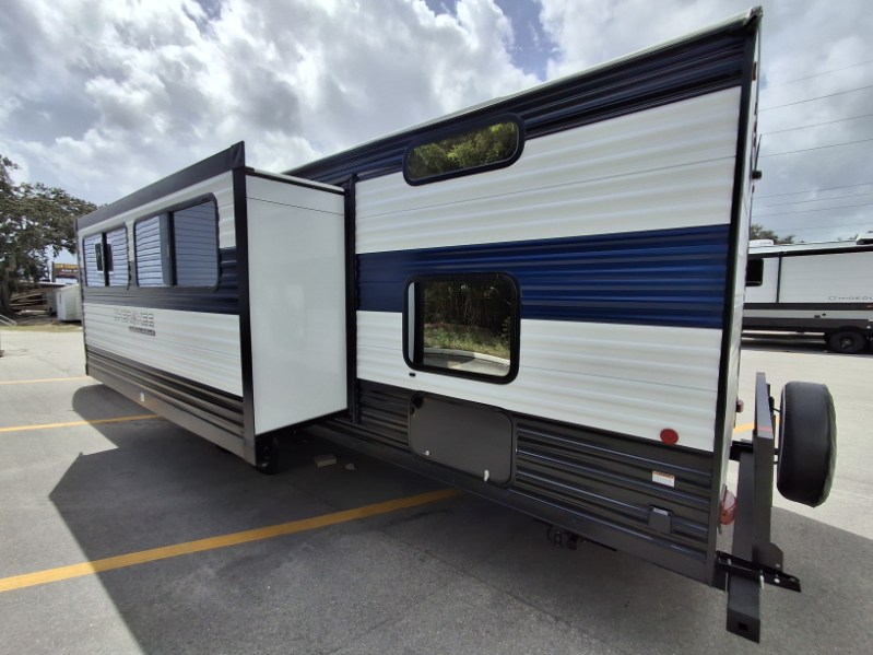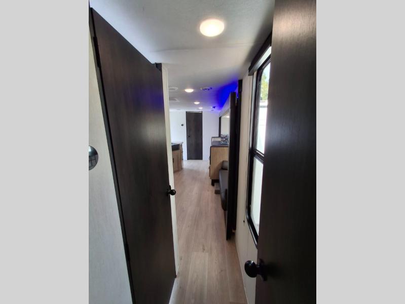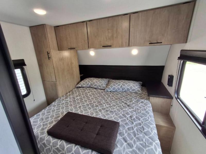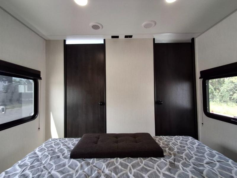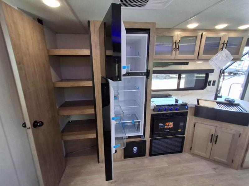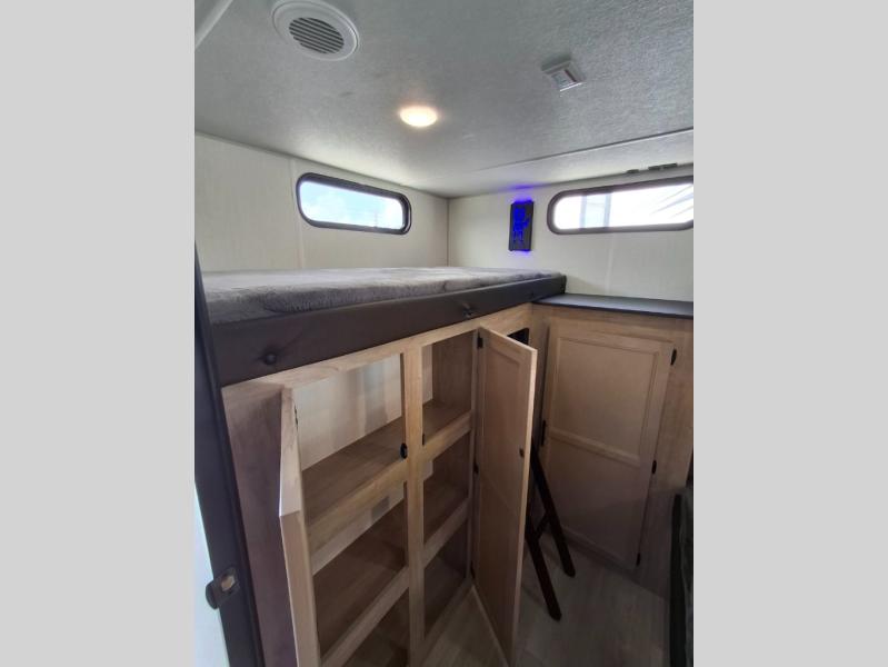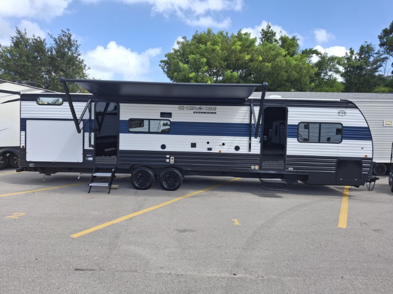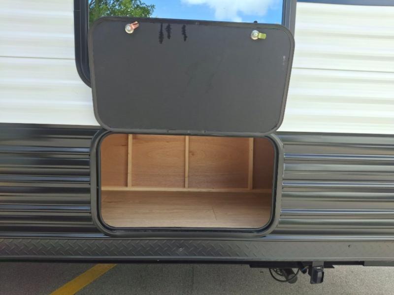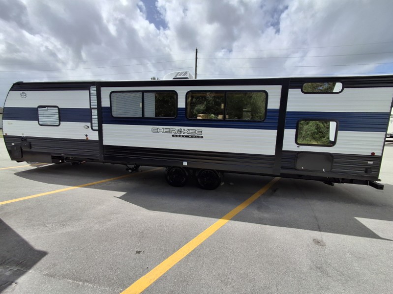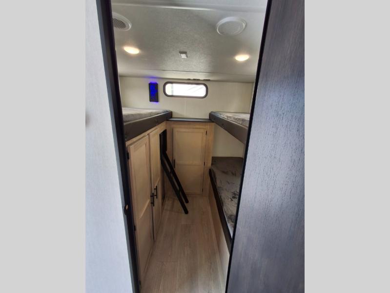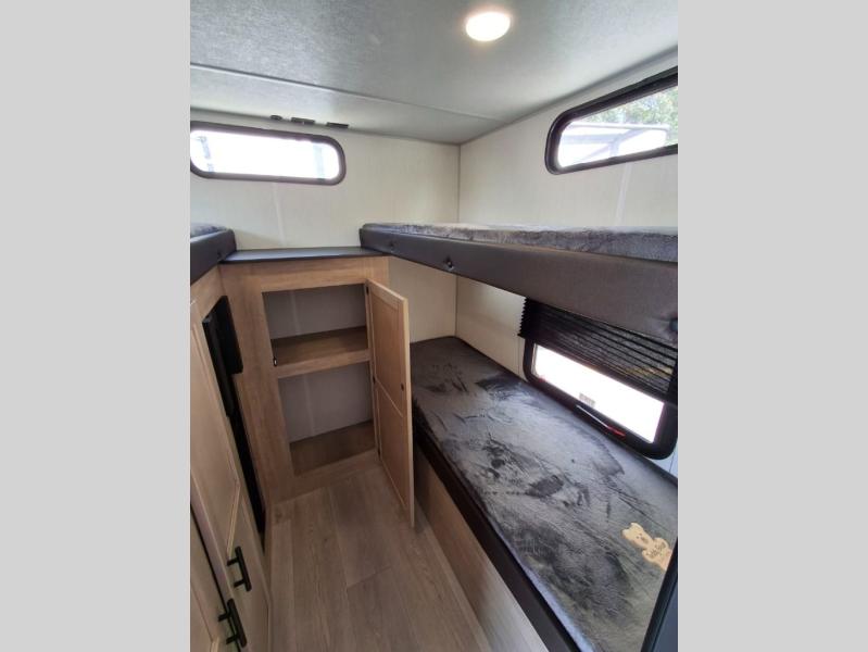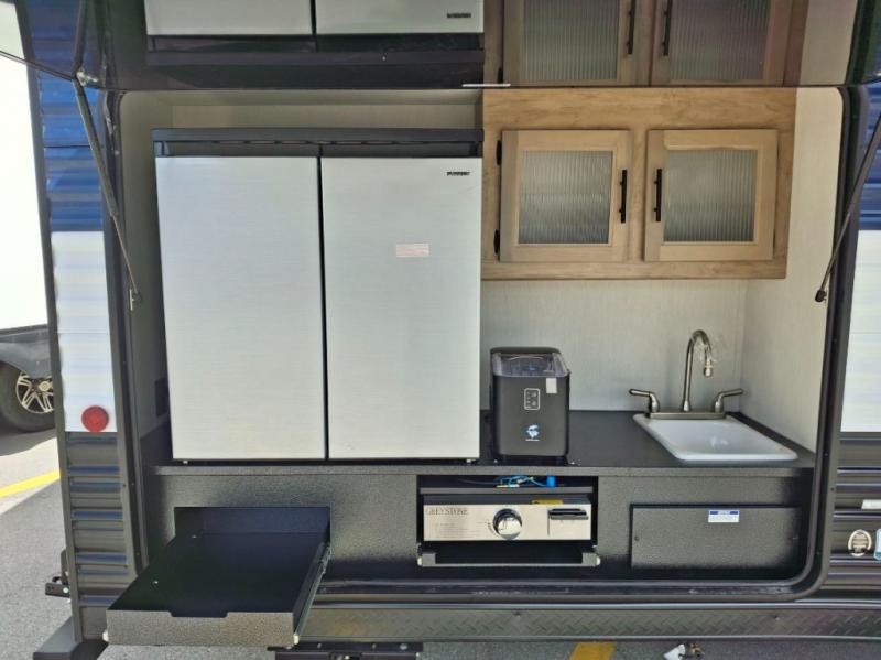 Your larger family will love spending weekends away with this Cherokee Grey Wolf travel trailer as their home away from home. This model offers lots of sleeping space with three bunk beds in the rear private bunkhouse. In the front, there is a master suite with a wardrobe beside RV king bed, and it even has private access to the dual-entry bath. The two entry doors will make accessing the trailer easy for everyone, and you will appreciate the abundant storage throughout this unit including large overhead cabinets, a spacious pantry, and numerous outside storage compartments for all of your outdoor gear. There's even an outside bar & grill!