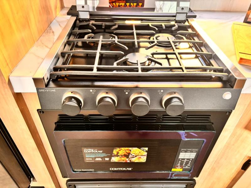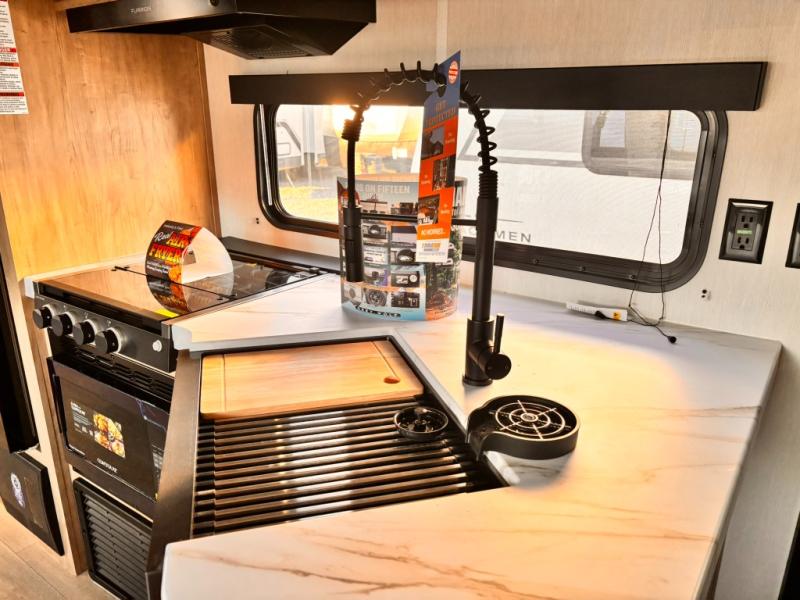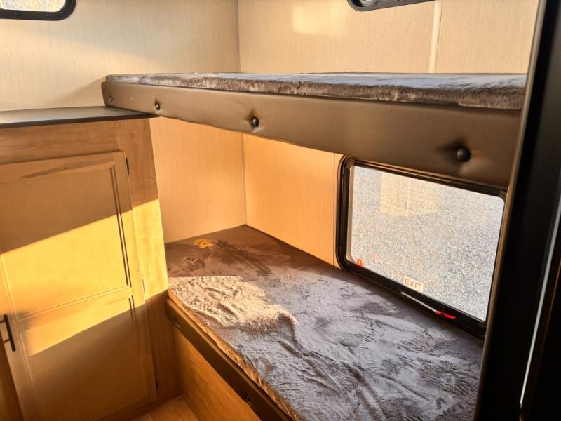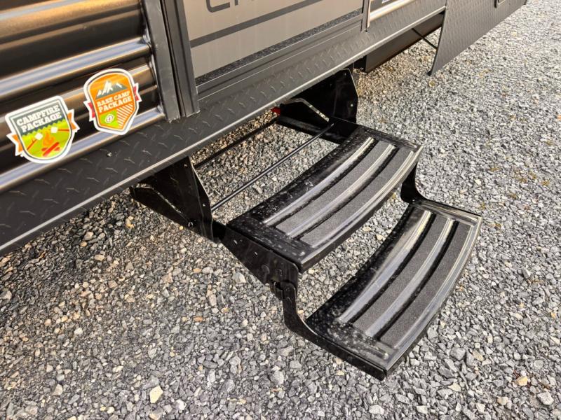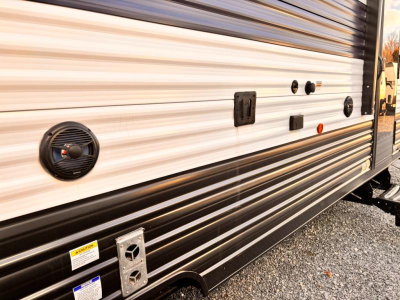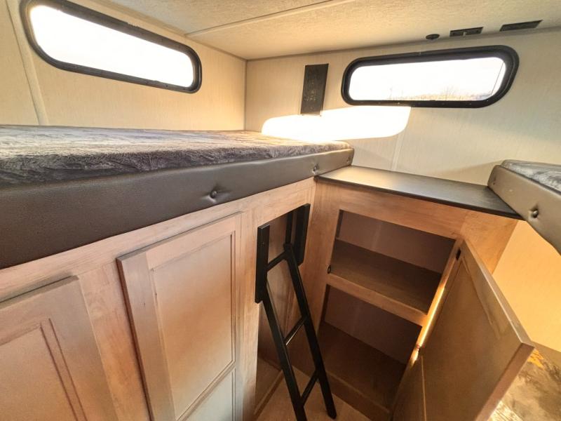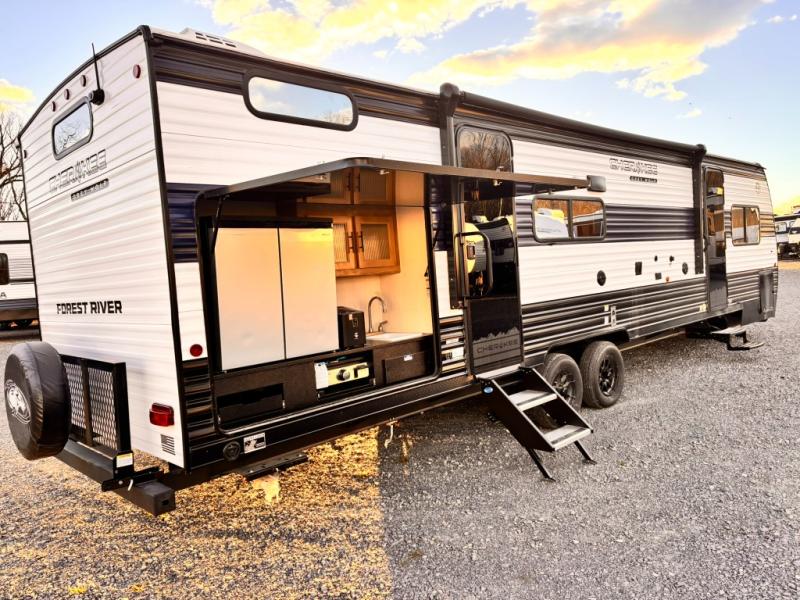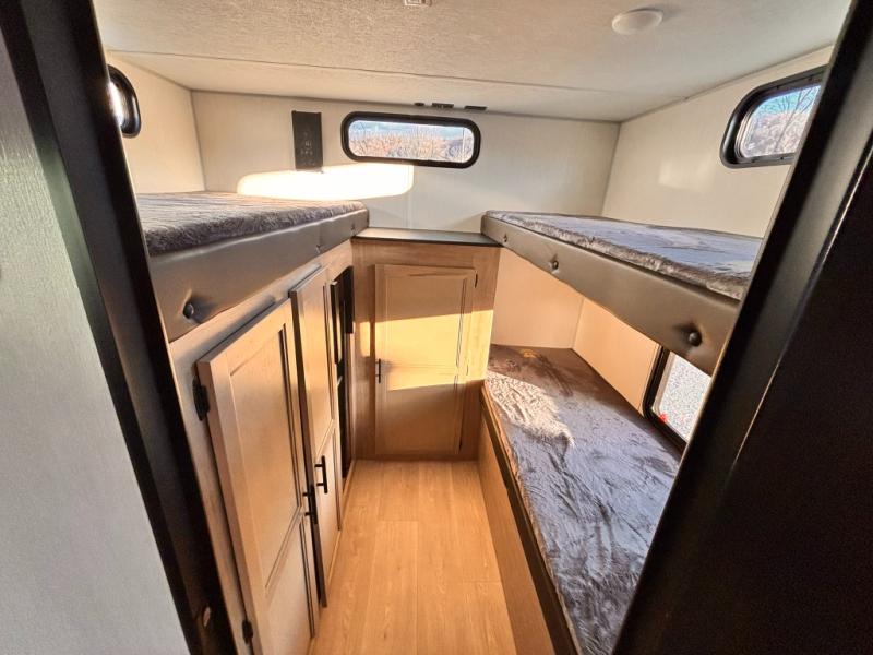 Your larger family will love spending weekends away with this Cherokee Grey Wolf travel trailer as their home away from home. This model offers lots of sleeping space with three bunk beds in the rear private bunkhouse. In the front, there is a master suite with a wardrobe beside RV king bed, and it even has private access to the dual-entry bath. The two entry doors will make accessing the trailer easy for everyone, and you will appreciate the abundant storage throughout this unit including large overhead cabinets, a spacious pantry, and numerous outside storage compartments for all of your outdoor gear. There's even an outside bar & grill!