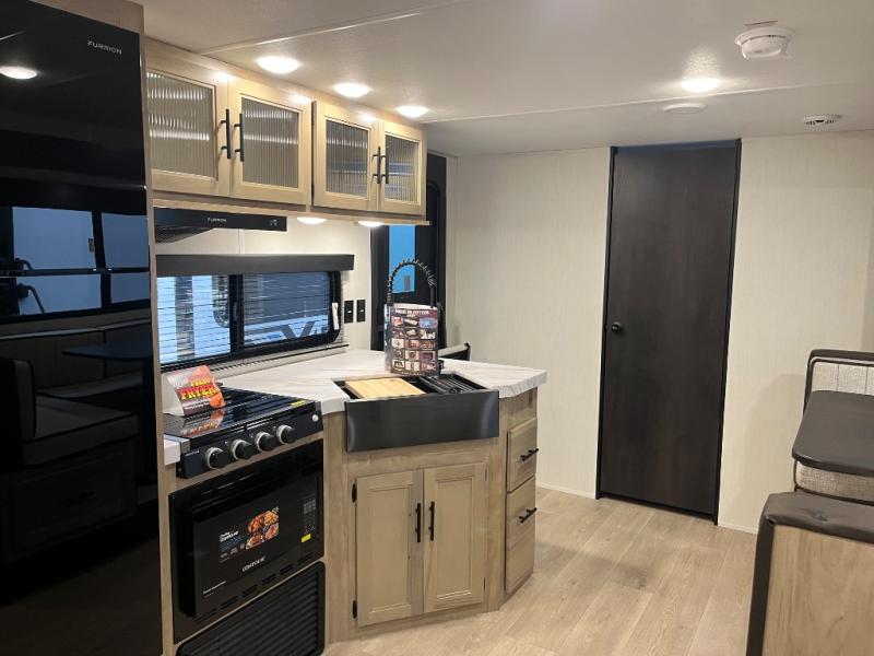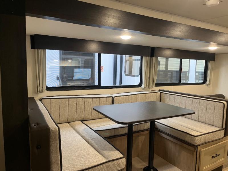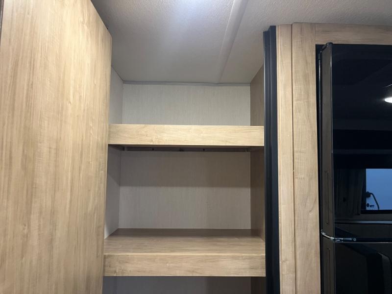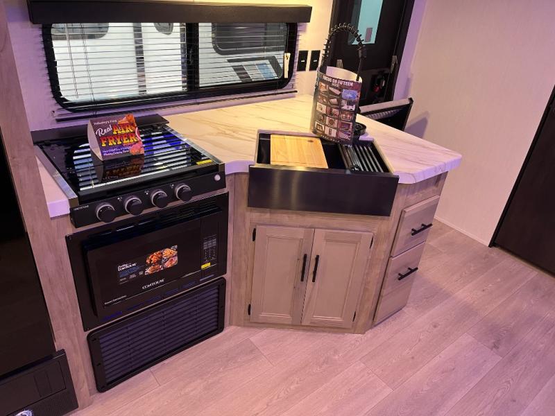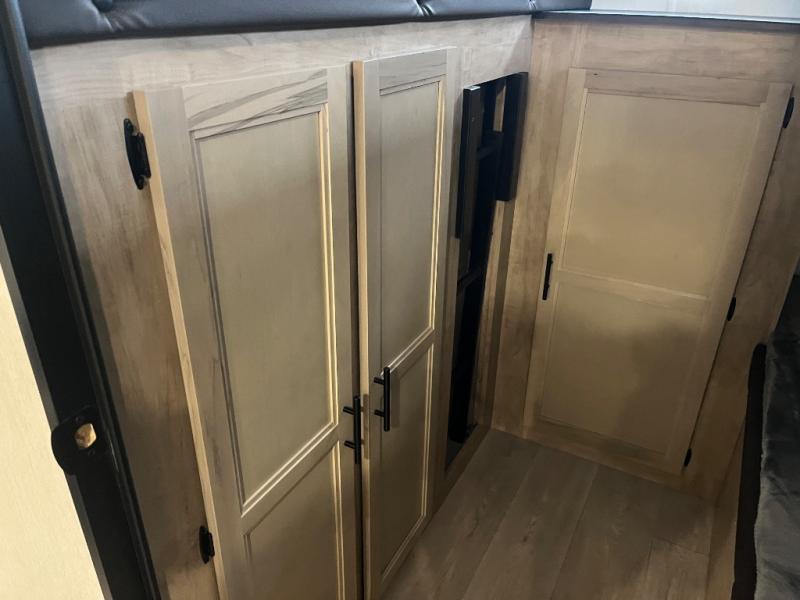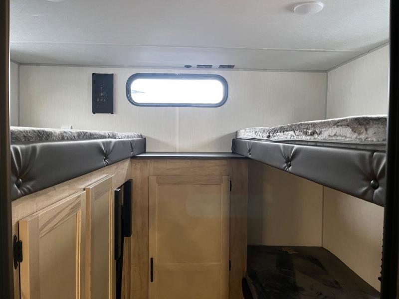 Your larger family will love spending weekends away with this Cherokee Grey Wolf travel trailer as their home away from home. This model offers lots of sleeping space with three bunk beds in the rear private bunkhouse. In the front, there is a master suite with a wardrobe beside RV king bed, and it even has private access to the dual-entry bath. The two entry doors will make accessing the trailer easy for everyone, and you will appreciate the abundant storage throughout this unit including large overhead cabinets, a spacious pantry, and numerous outside storage compartments for all of your outdoor gear. There's even an outside bar & grill!