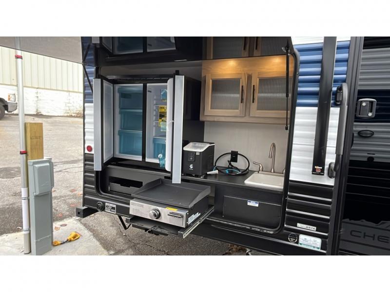 Your larger family will love spending weekends away with this Cherokee Grey Wolf travel trailer as their home away from home. This model offers lots of sleeping space with three bunk beds in the rear private bunkhouse. In the front, there is a master suite with a wardrobe beside RV king bed, and it even has private access to the dual-entry bath. The two entry doors will make accessing the trailer easy for everyone, and you will appreciate the abundant storage throughout this unit including large overhead cabinets, a spacious pantry, and numerous outside storage compartments for all of your outdoor gear. There's even an outside bar & grill!