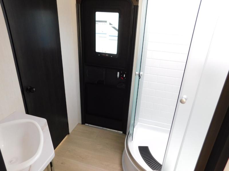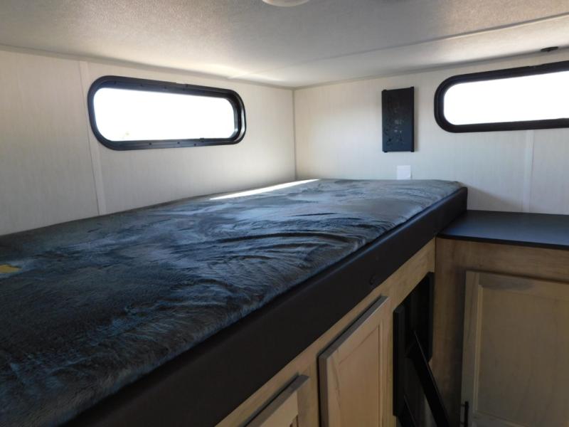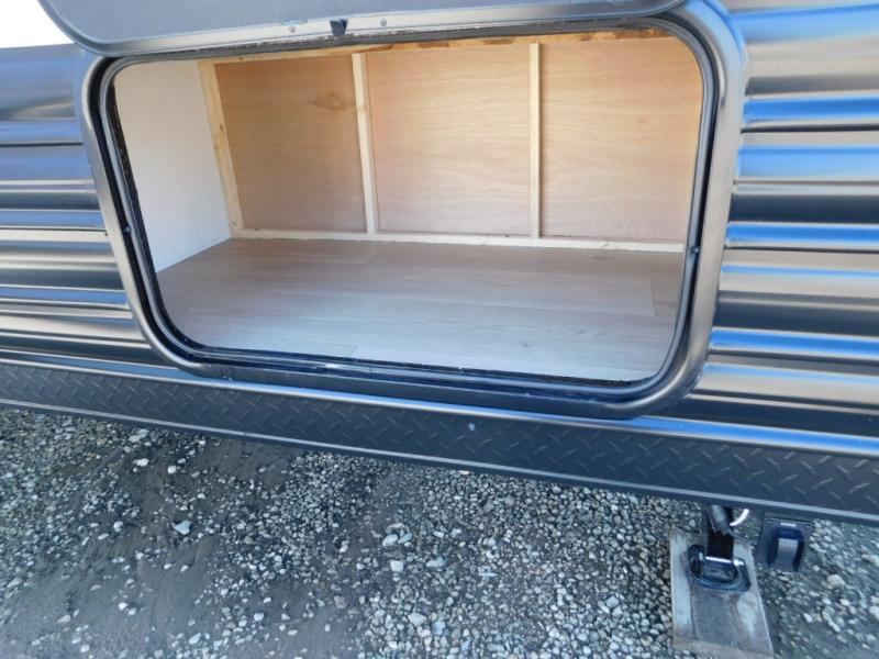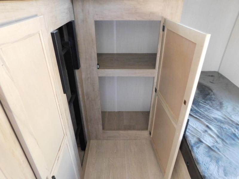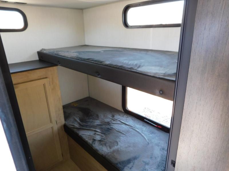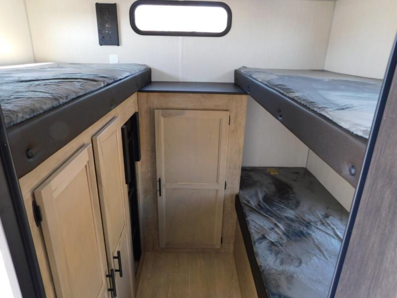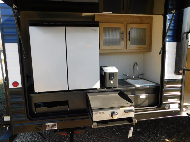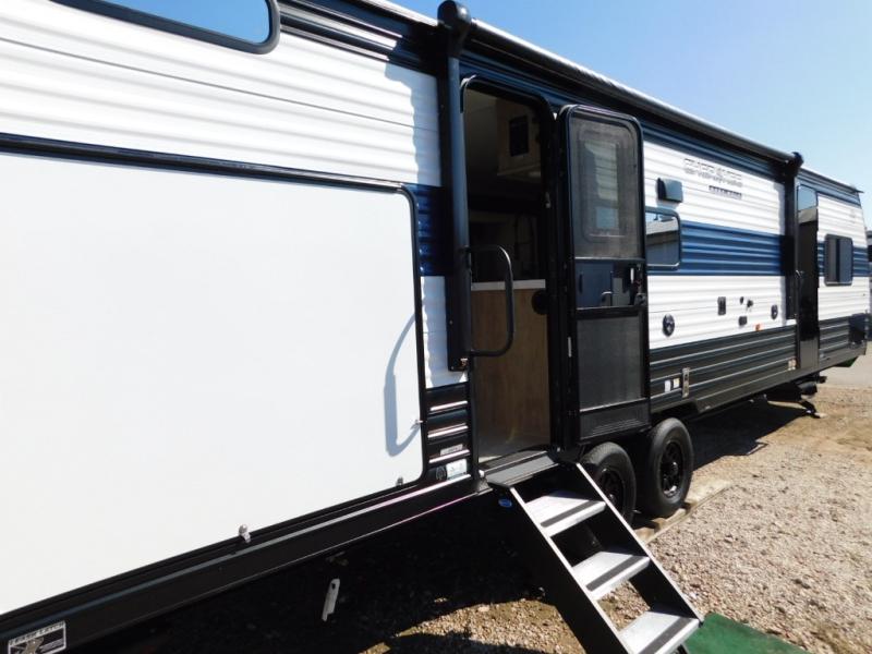 Your larger family will love spending weekends away with this Cherokee Grey Wolf travel trailer as their home away from home. This model offers lots of sleeping space with three bunk beds in the rear private bunkhouse. In the front, there is a master suite with a wardrobe beside RV king bed, and it even has private access to the dual-entry bath. The two entry doors will make accessing the trailer easy for everyone, and you will appreciate the abundant storage throughout this unit including large overhead cabinets, a spacious pantry, and numerous outside storage compartments for all of your outdoor gear. There's even an outside bar & grill!