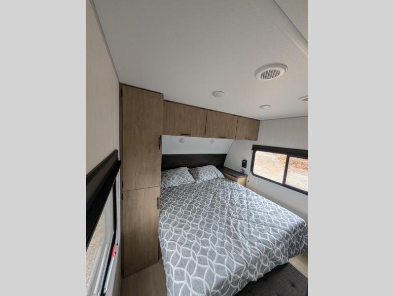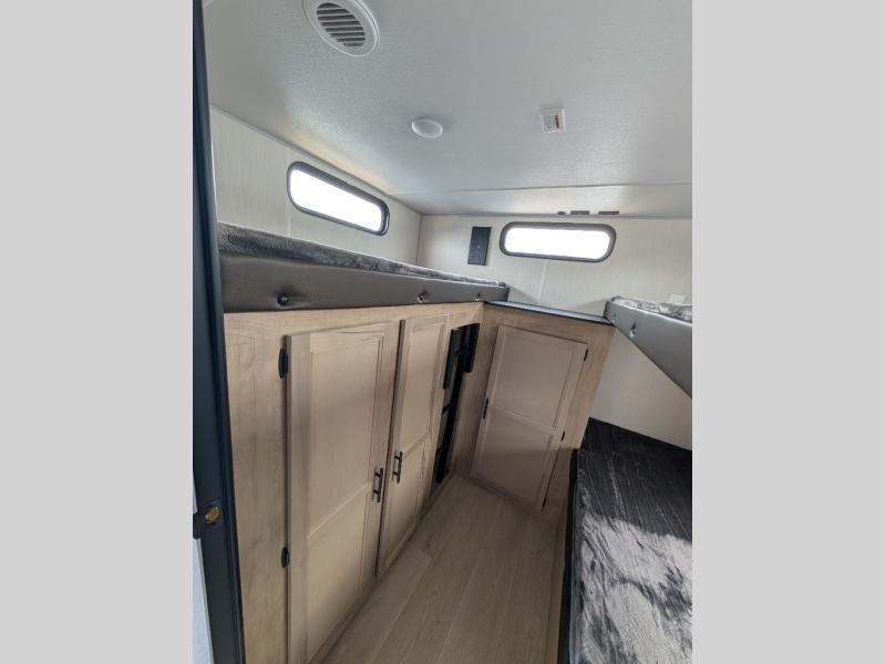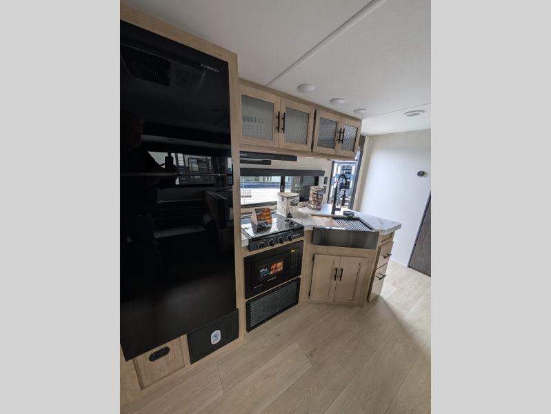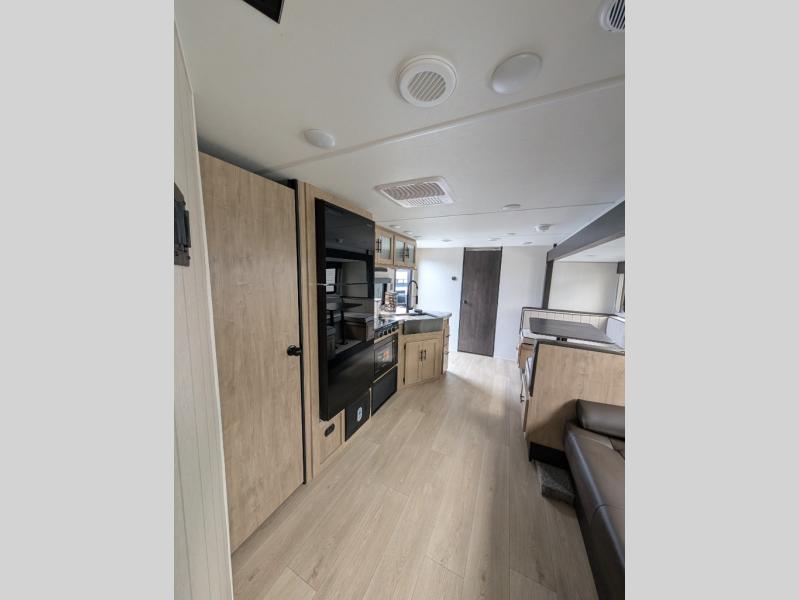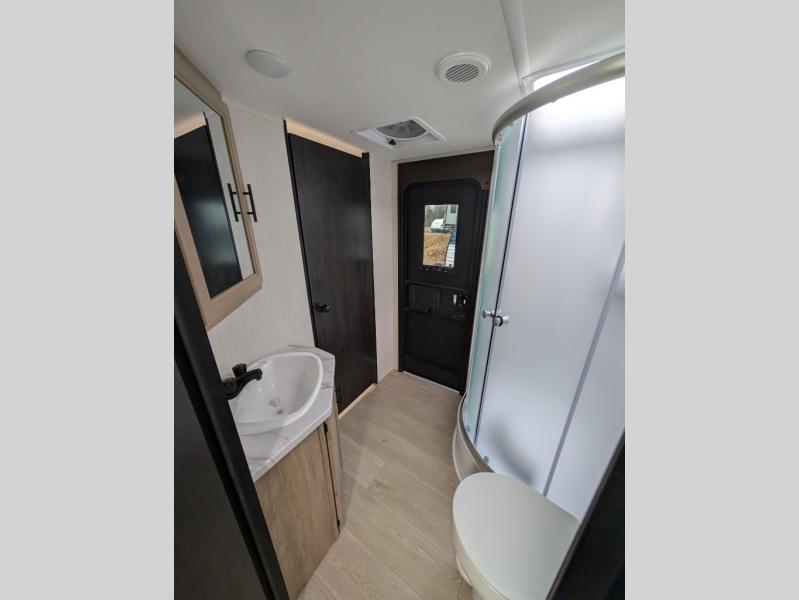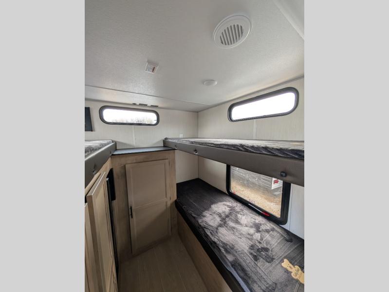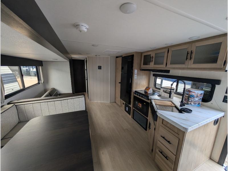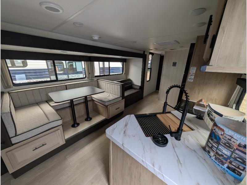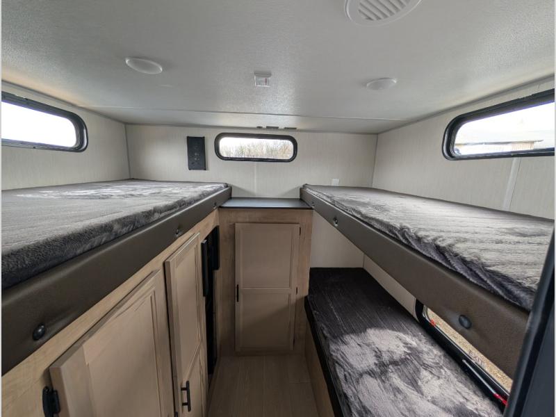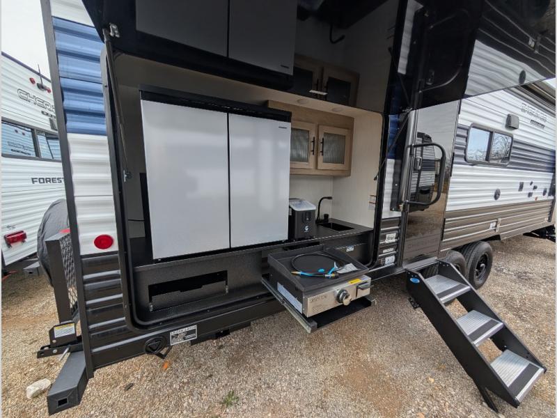 With a double entry and outdoor bathroom access, this RV offers convenience, flexibility and affordability. The rear bunkhouse provides ample sleeping space for kids, while the outdoor kitchen, complete with a side-by-side refrigerator/freezer, ice maker, cooktop, sink, and storage, is perfect for outdoor entertaining.